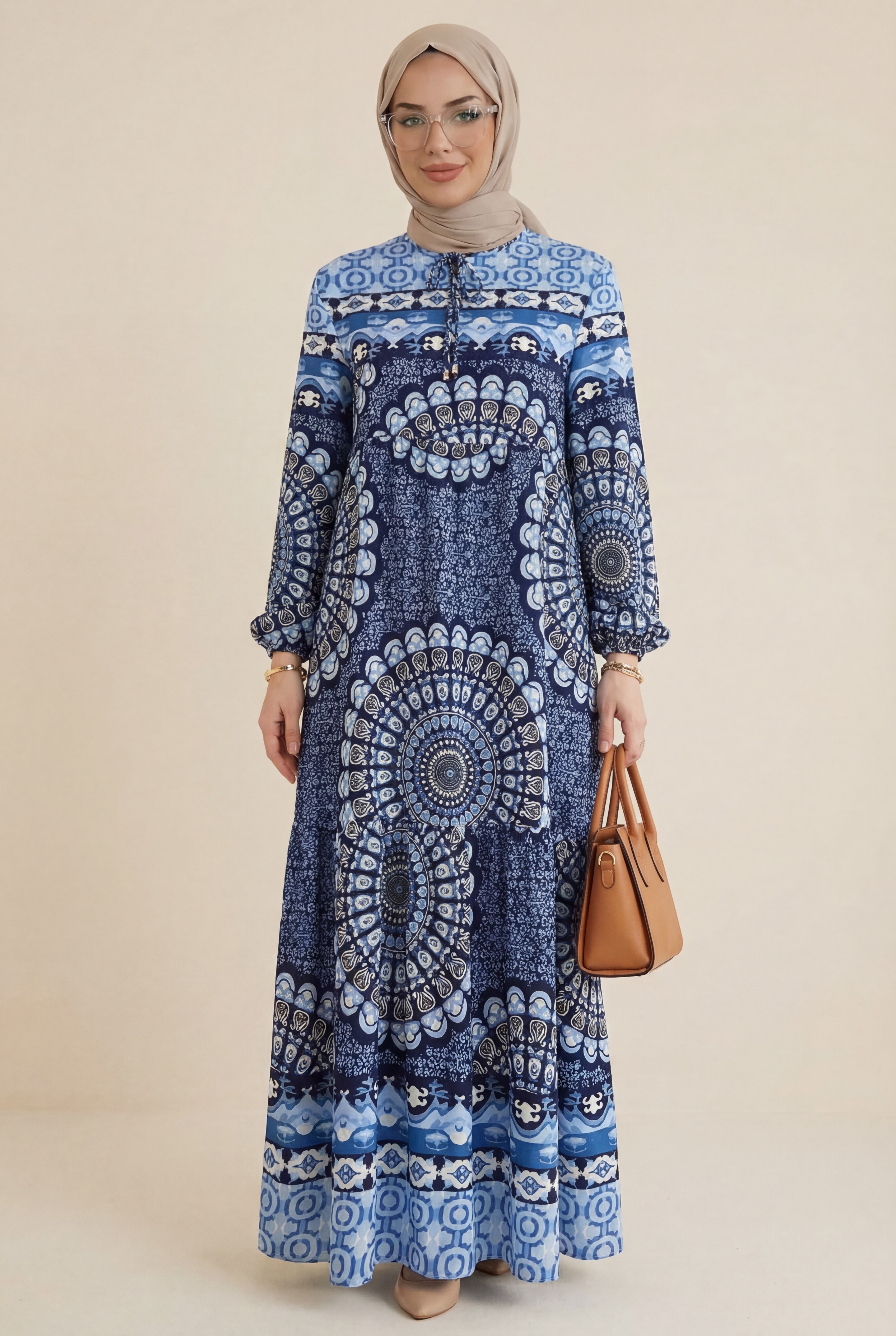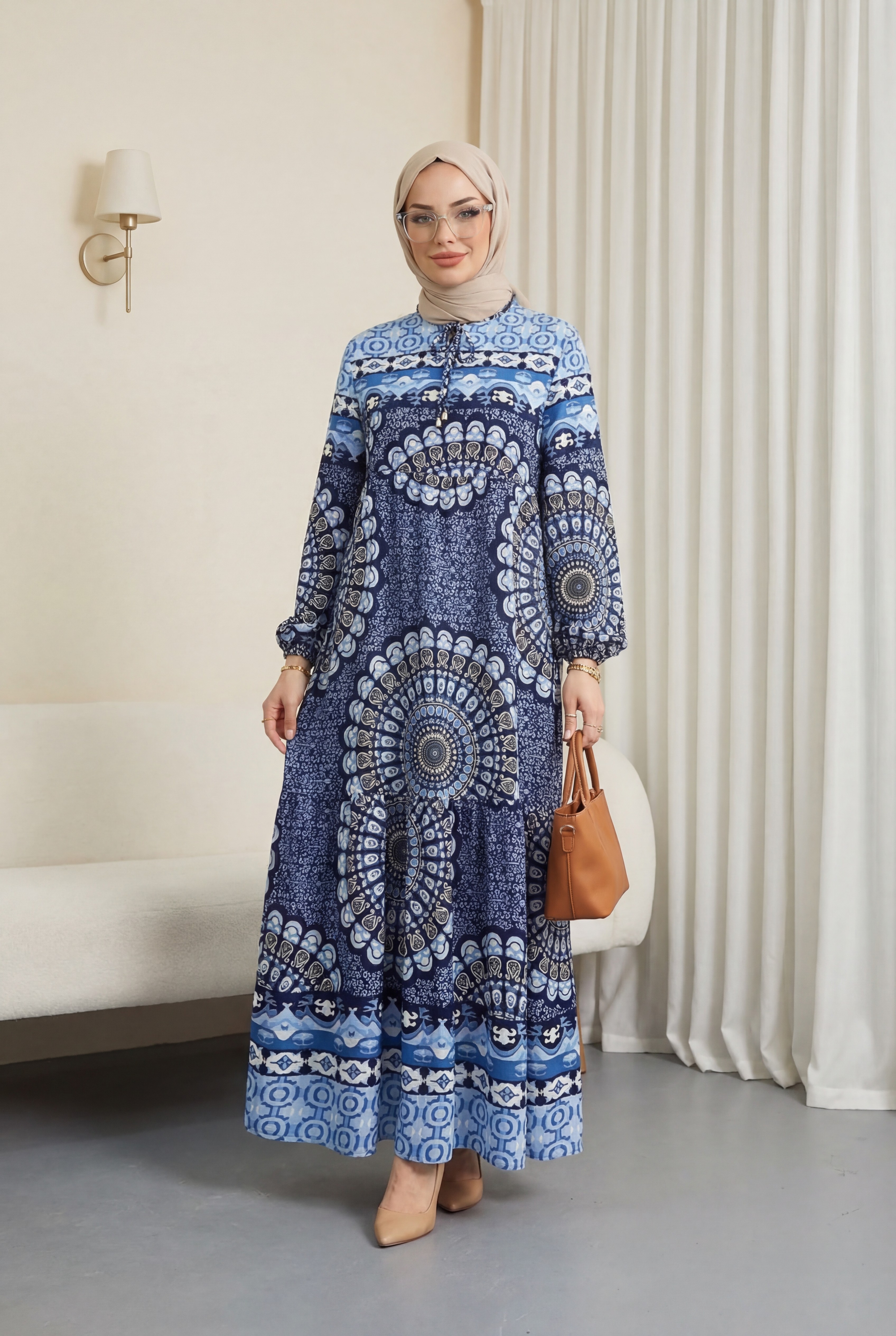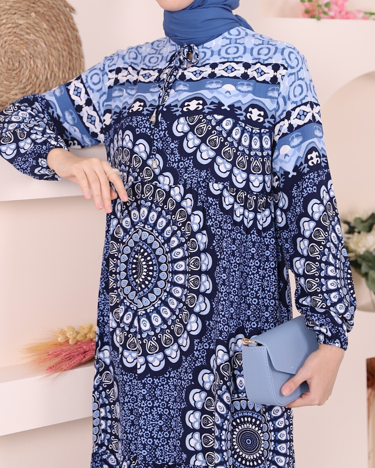 Yakası bağcıklı, desenli, arkadan fermuarlı, kol manşeti lastikli, astarsız elbise modelimiz yeni sezonun en çok sevilen modelleri arasında yer almaktadır.
