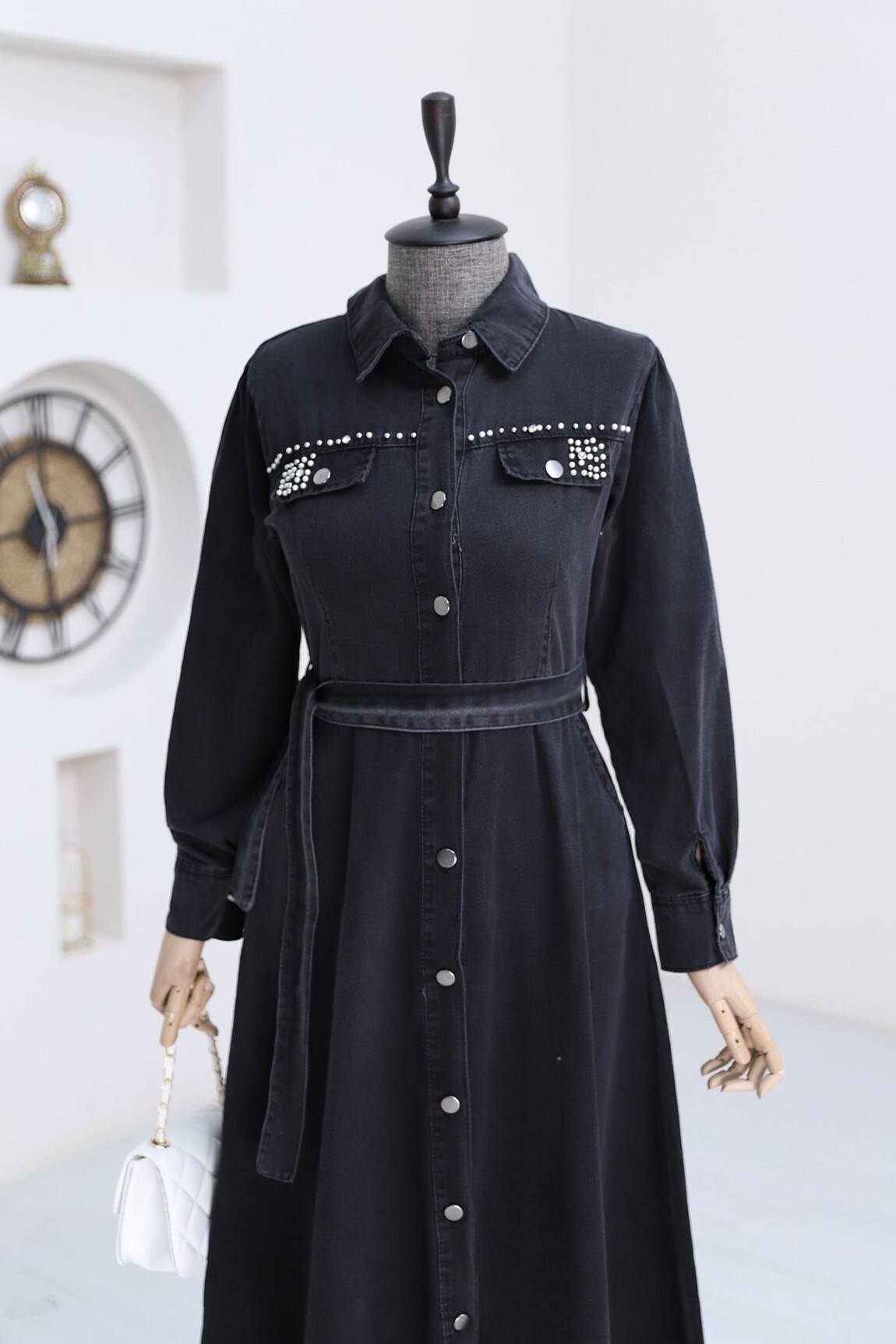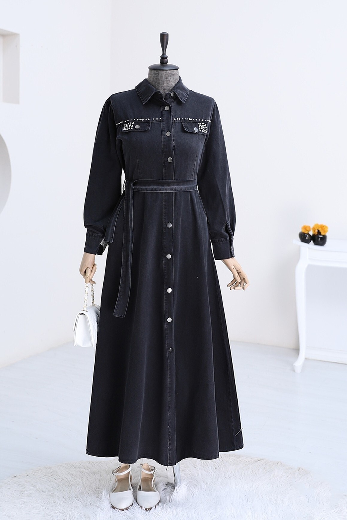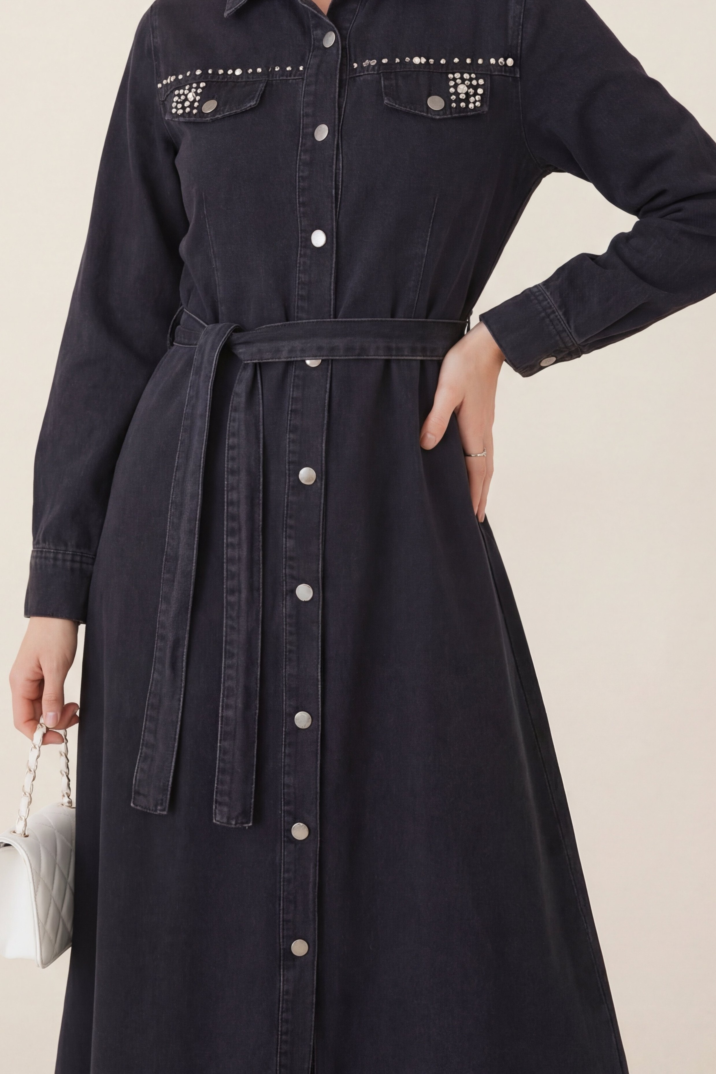 Taş Detaylı, Boydan Düğmeli Kot Elbise; zarif taş işlemeleriyle şıklığı artıran modern bir elbise seçeneğidir. Boydan düğmeli tasarımı klasik bir görünüm sunarken, taş detayları elbiseye ışıltı ve zarafet katmaktadır. Kot kumaşı ise rahatlık ve şıklığı bir arada sunar, hem gündelik kullanım hem de özel davetlerde tercih edilebilecek mükemmel bir seçenek oluşturur. Bu elbise, tarzınızı zarif ve şık bir şekilde tamamlar.