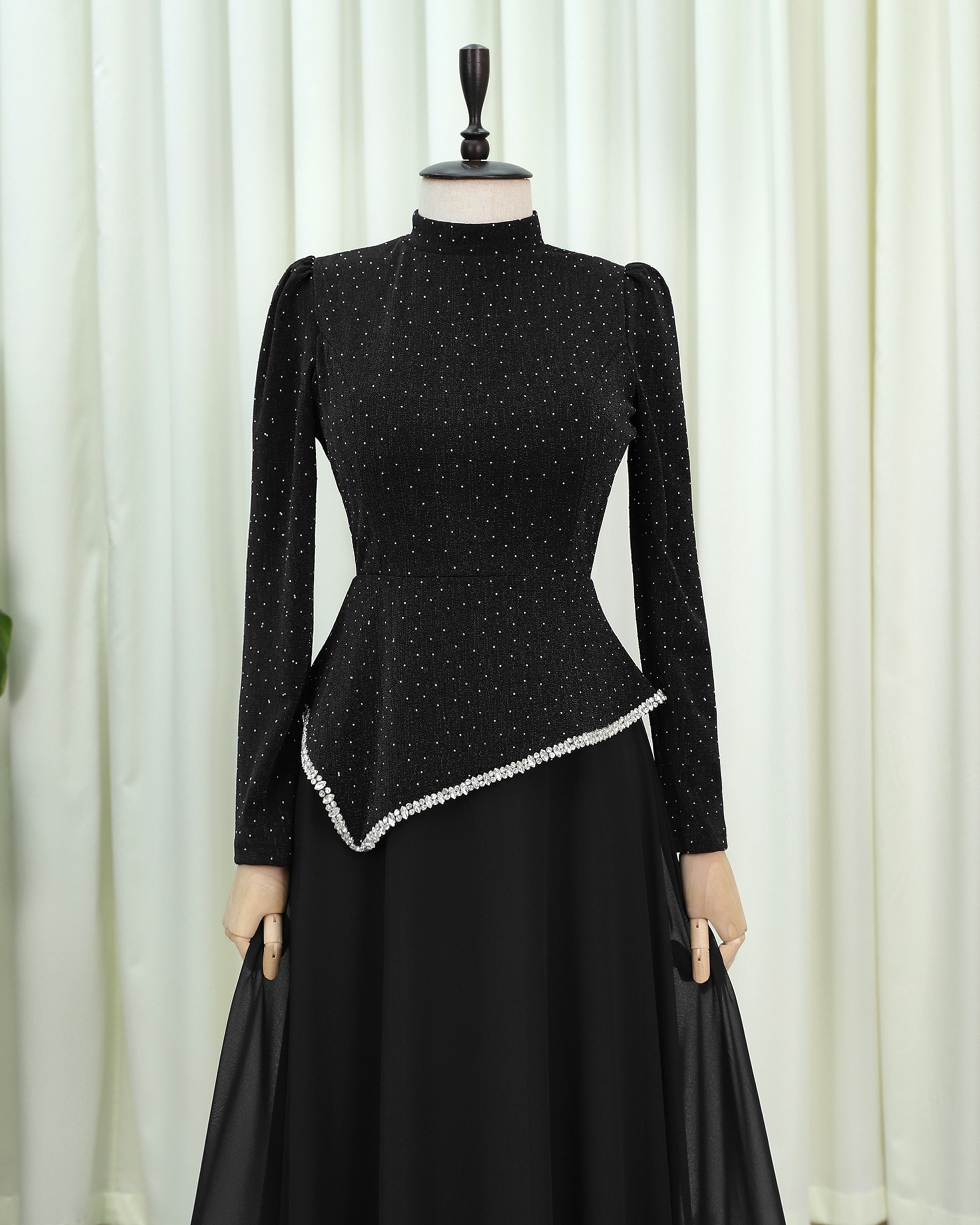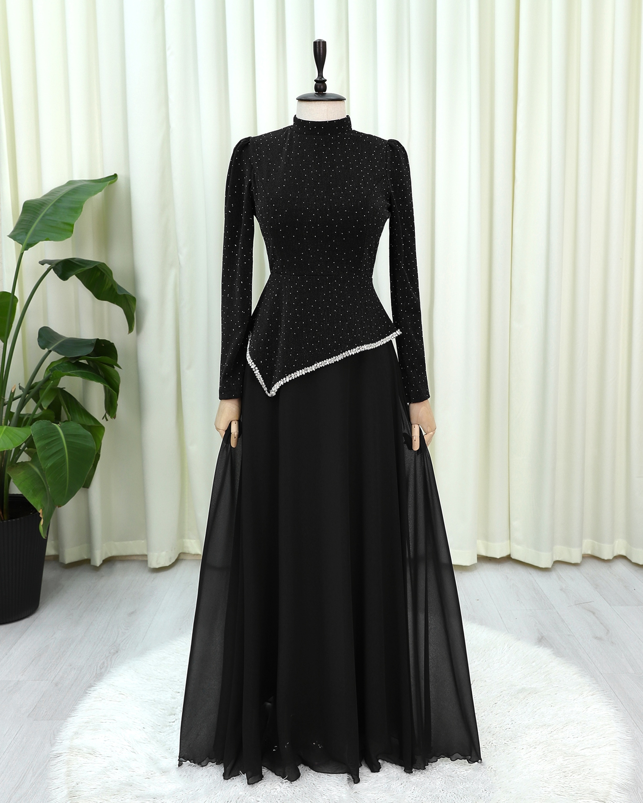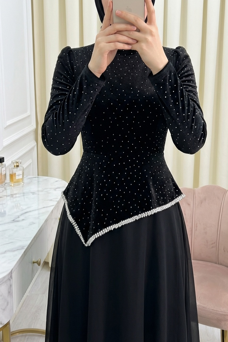 Üstü Asimetrik Kesim Taş Detaylı Eteği Şifon Elbise -Siyah