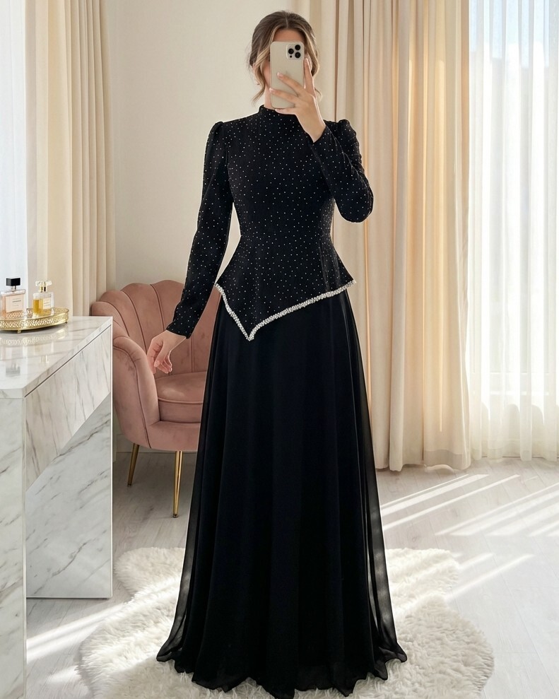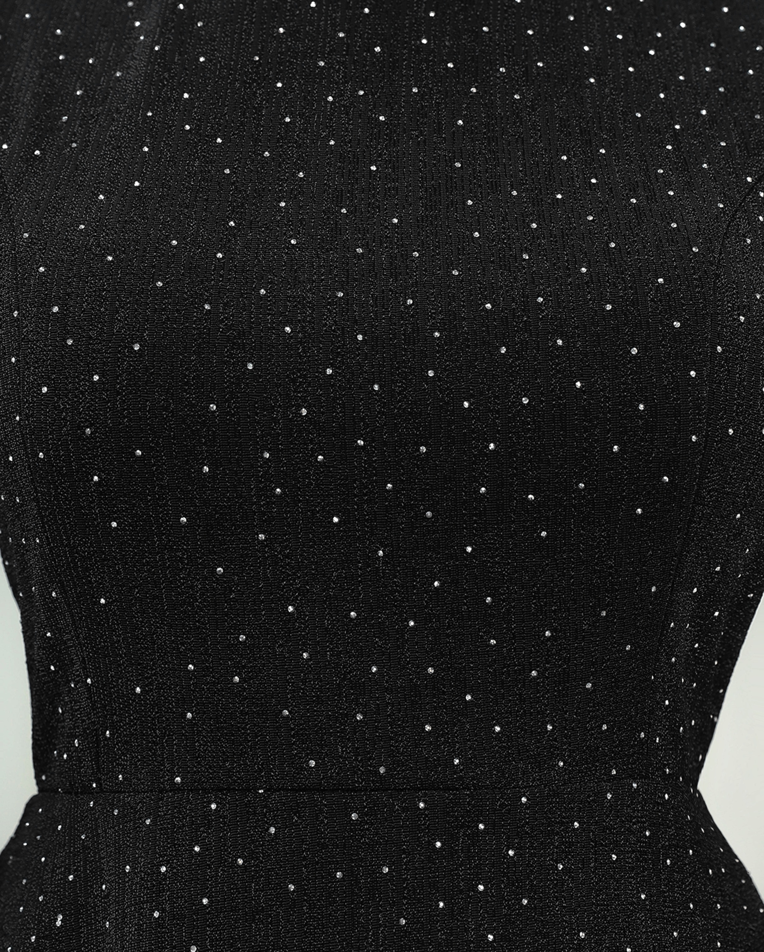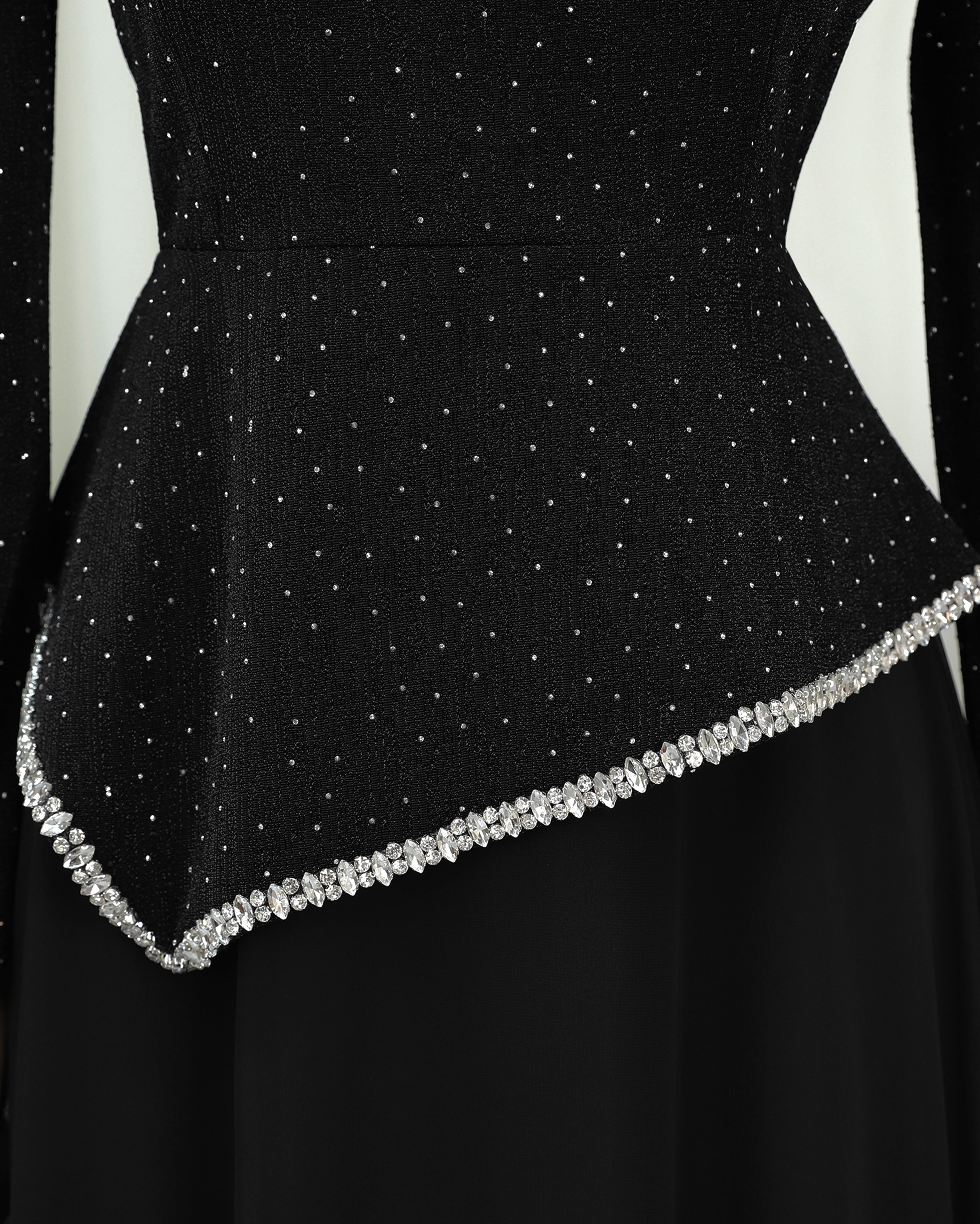 Üstü Asimetrik Kesim Taş Detaylı Eteği Şifon Elbise -Siyah