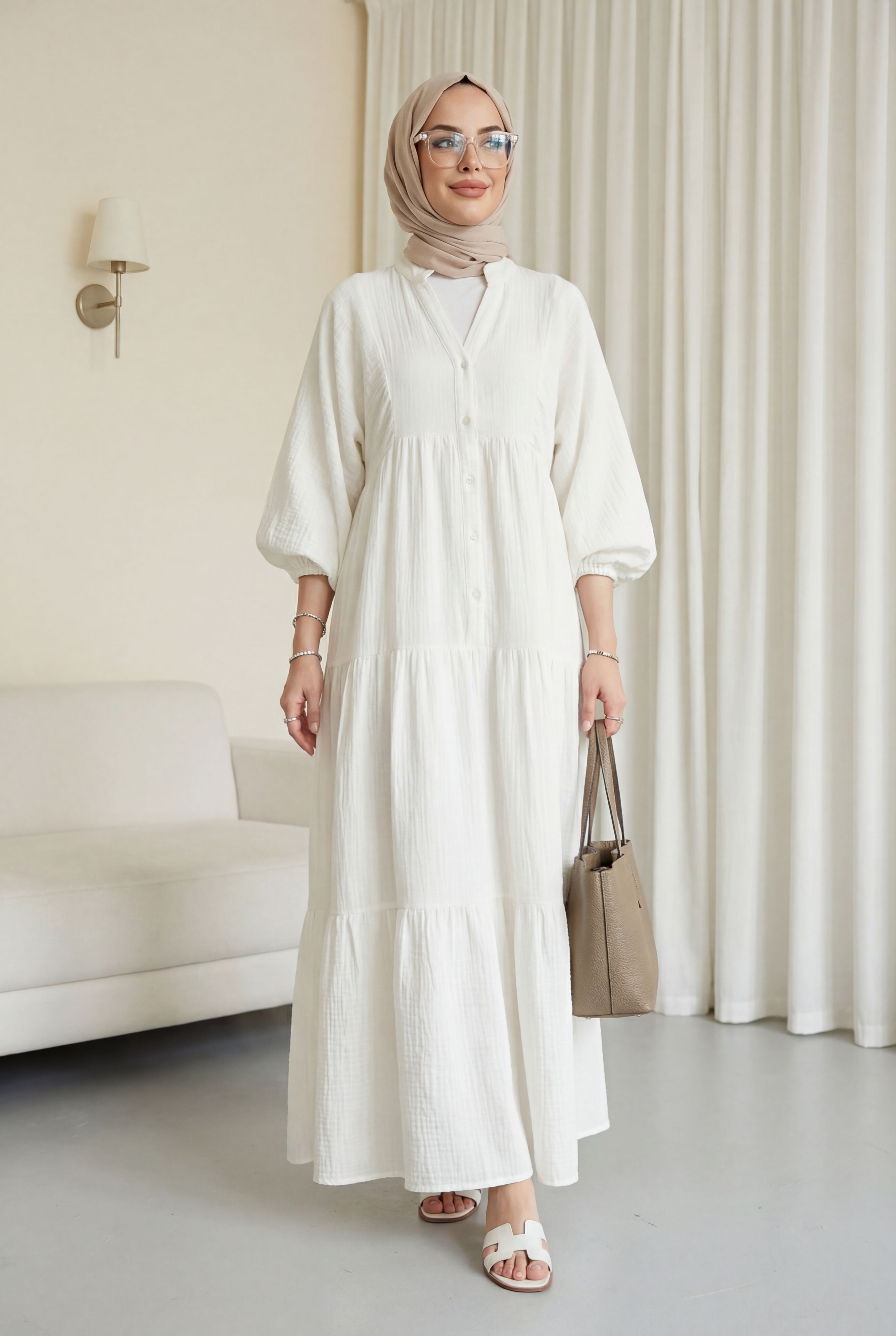 Kolu lastikli yapısı kullanım kolaylığı sağlarken, parçalı kesimi elbiseye hareketli ve akıcı bir siluet kazandırır. Nefes alabilen müslin kumaşı sayesinde özellikle sıcak havalarda ferah bir kullanım sunar. Günlük kombinlerden hafta sonu şıklığına kadar geniş bir kullanım alanına sahiptir.