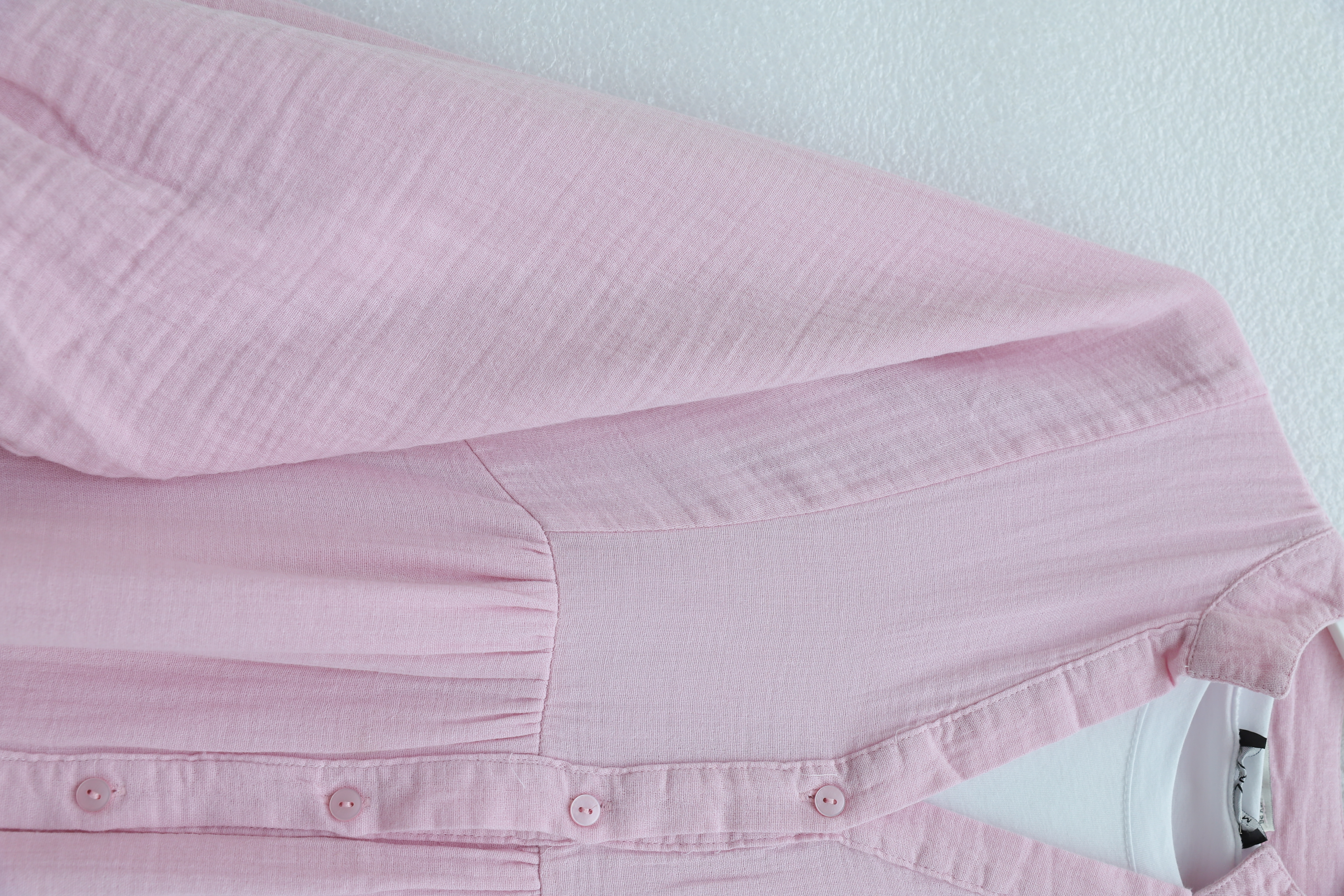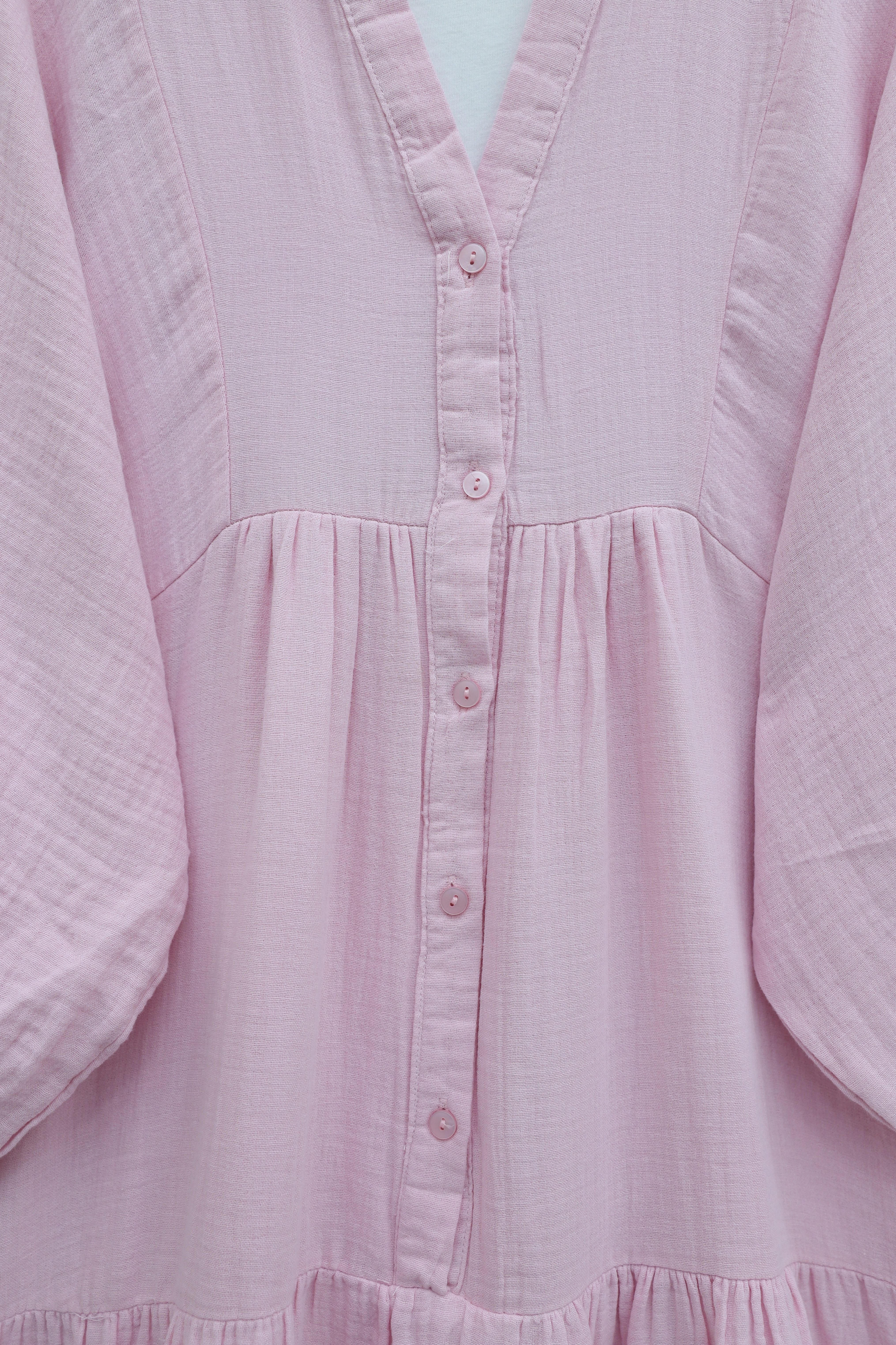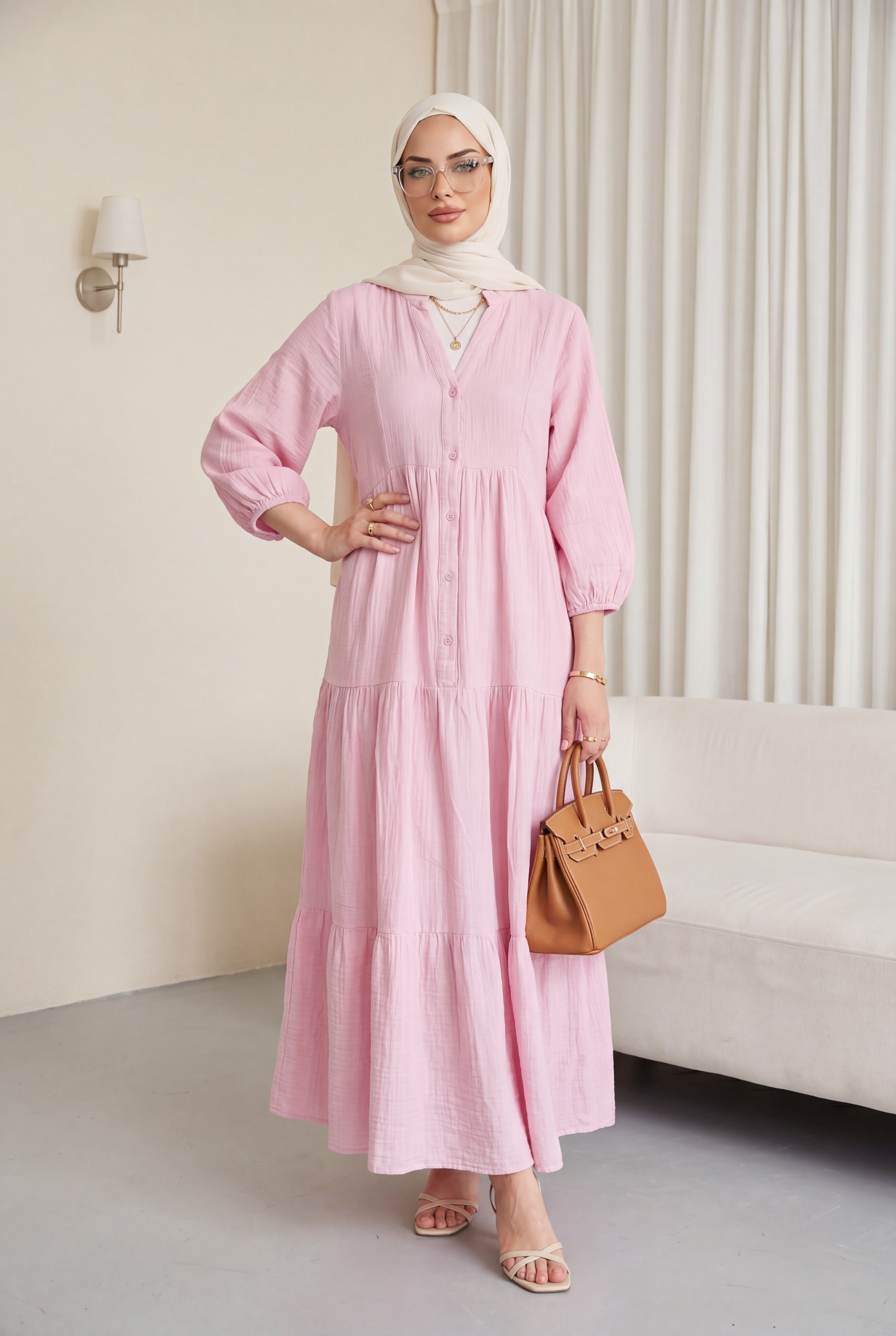 Doğal dokusu ve rahat kesimiyle öne çıkan V Yaka Yarım Düğmeli Kolu Lastikli Parçalı Müslin Elbise, gün boyu konforu şıklıkla buluşturur. V yaka tasarımı zarif bir görünüm sunarken, yarım düğmeli detayı elbiseye modern bir hava katar.