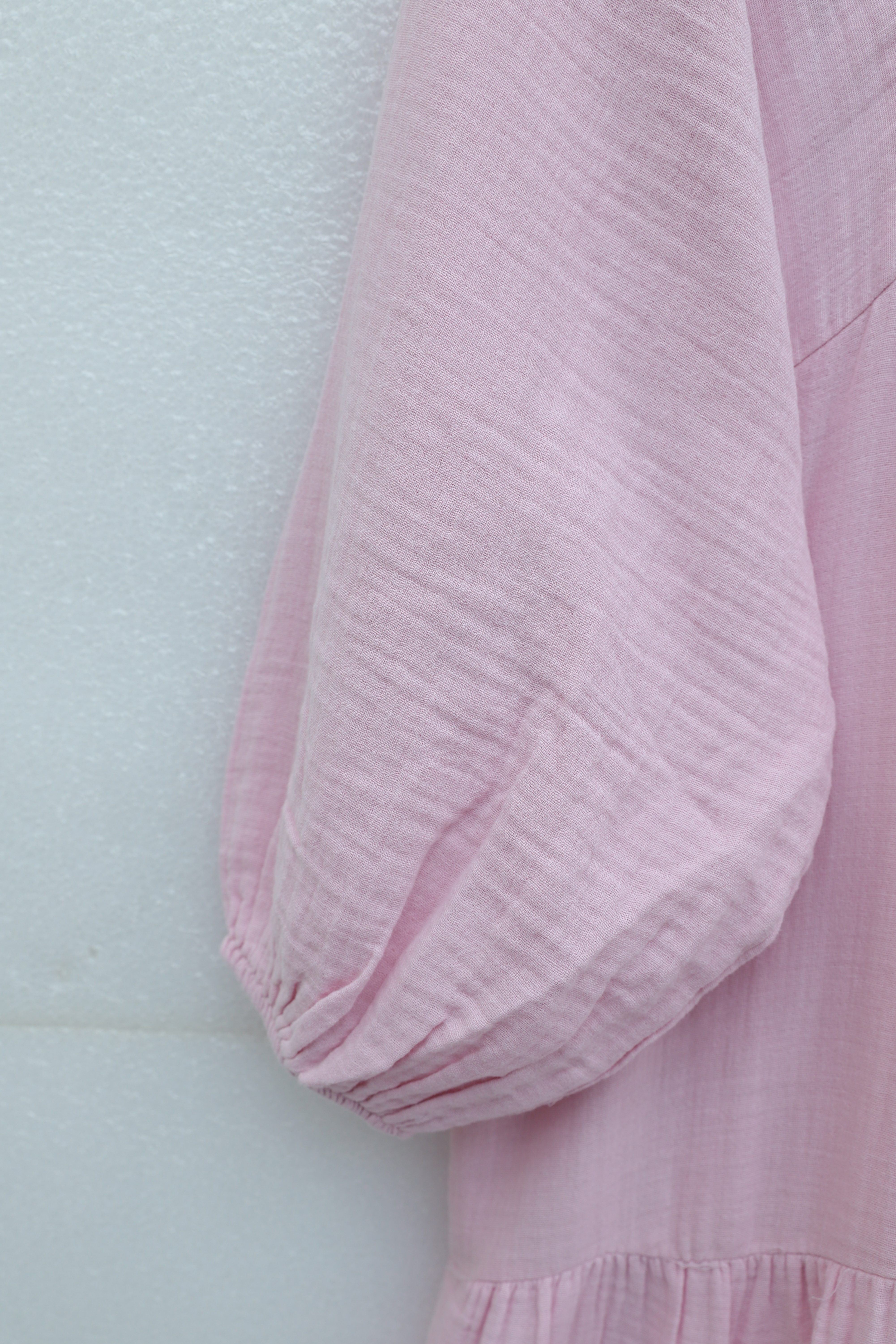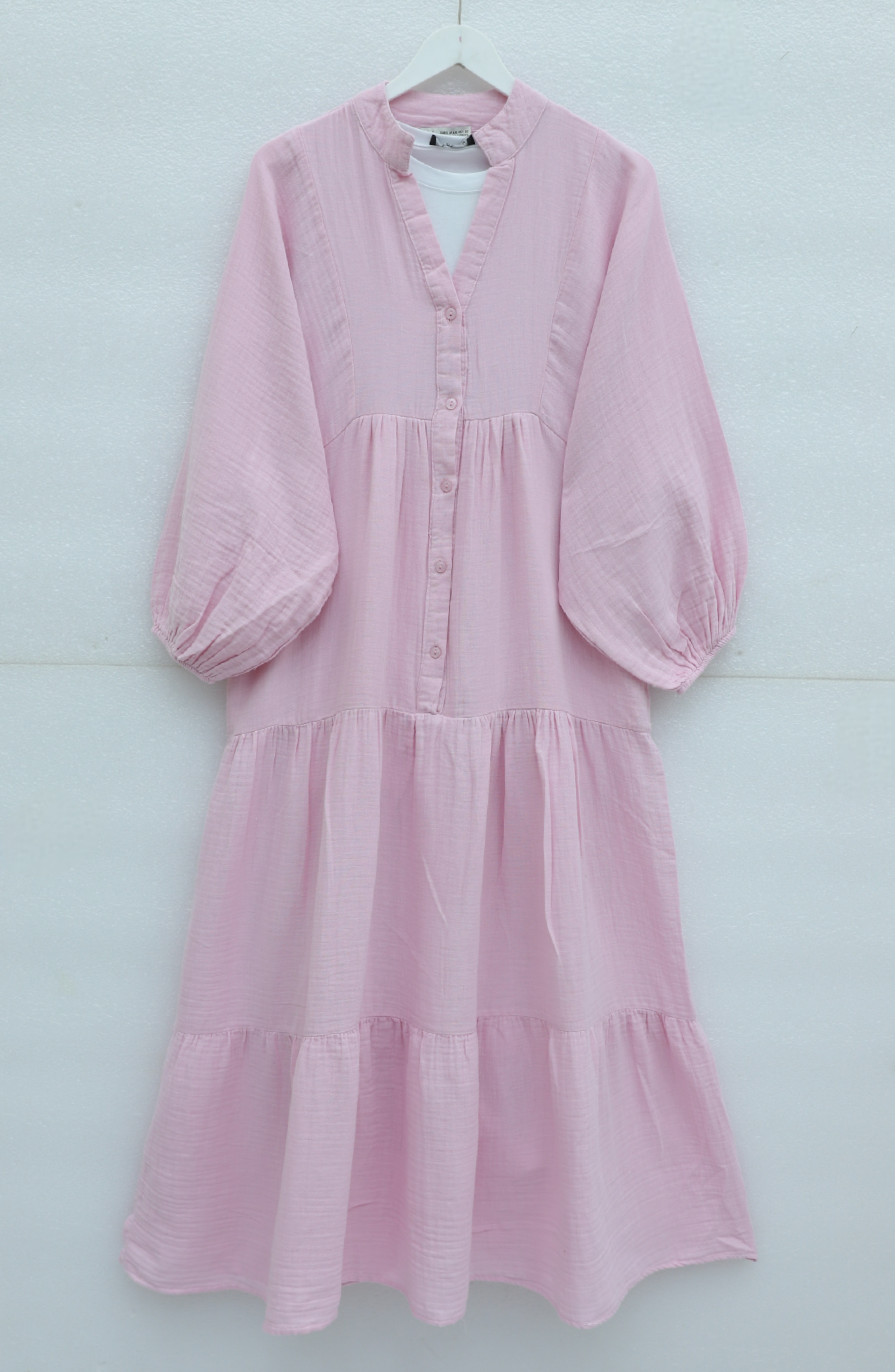 Kolu lastikli yapısı kullanım kolaylığı sağlarken, parçalı kesimi elbiseye hareketli ve akıcı bir siluet kazandırır. Nefes alabilen müslin kumaşı sayesinde özellikle sıcak havalarda ferah bir kullanım sunar. Günlük kombinlerden hafta sonu şıklığına kadar geniş bir kullanım alanına sahiptir.