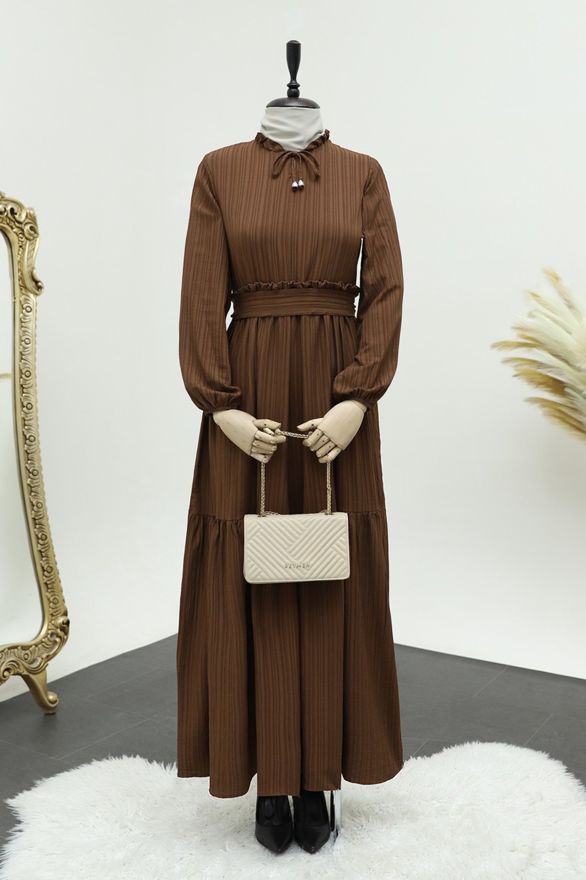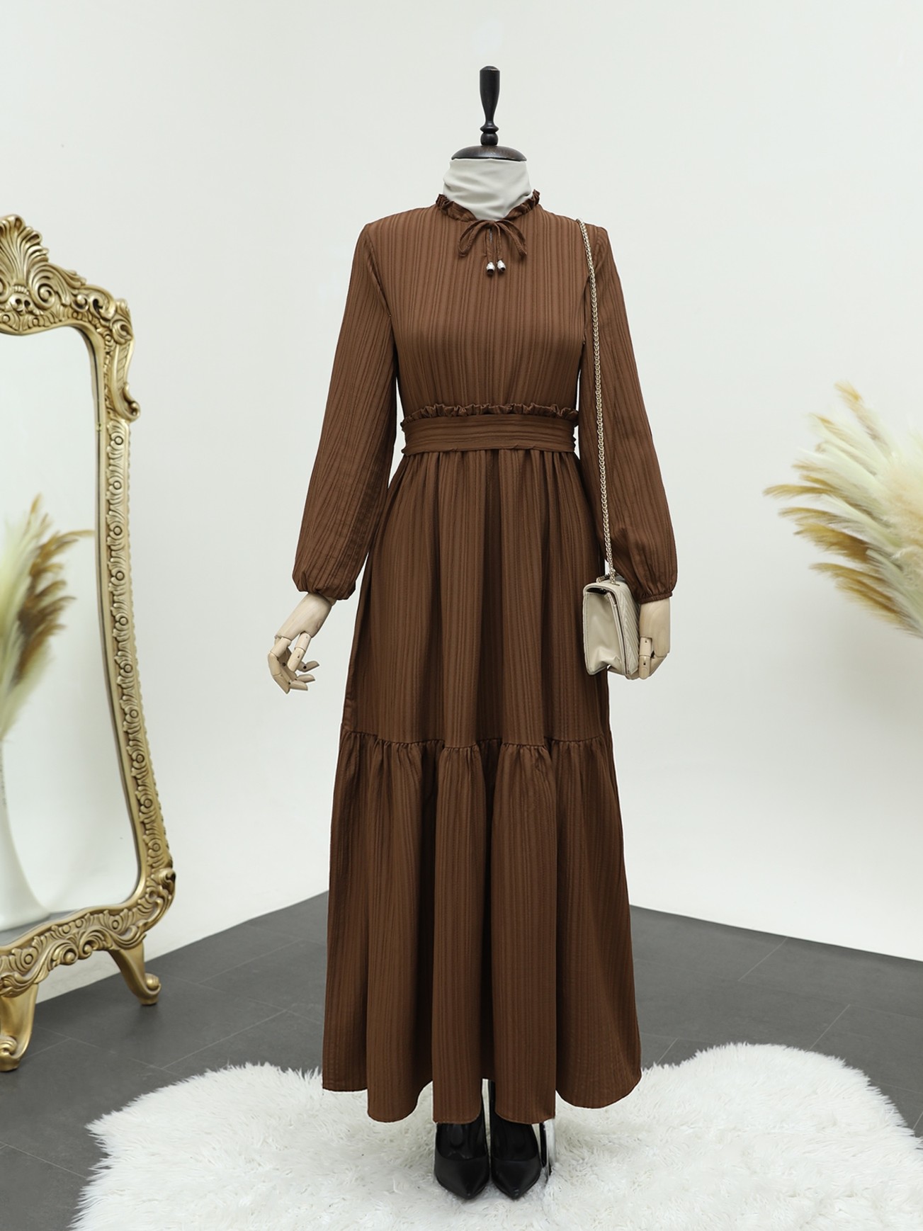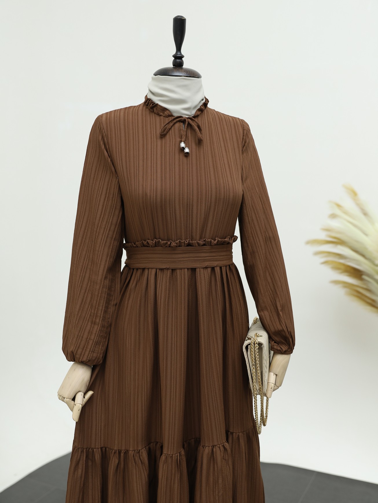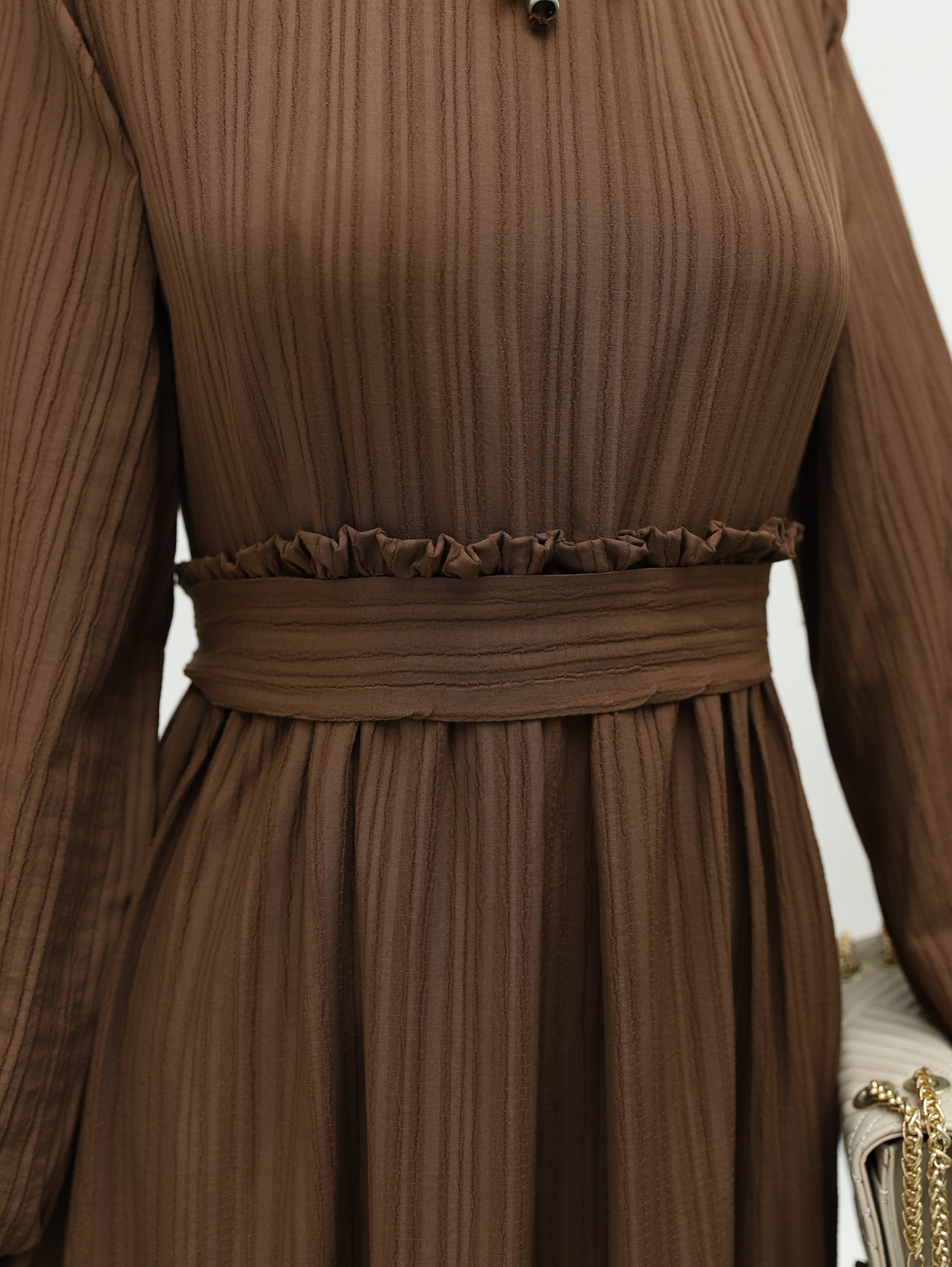 Yaka Fırfırlı Parçalı Gofre Elbise -K. Kahve