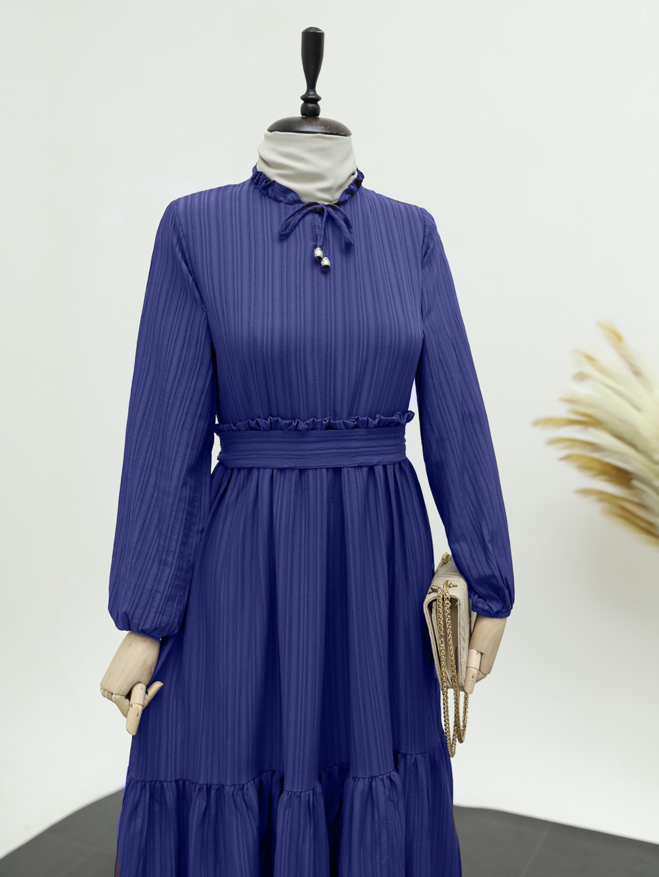 Yaka fırfırlı, parçalı, gofre elbise; zarif ve modern bir tasarıma sahiptir. Fırfır detaylı yaka, elbiseye şık bir hava katar ve göz alıcı bir görünüm sunar. Parçalı tasarımı ise elbiseye özgün bir dokunuş ekler. Gofre kumaşı, modern bir doku sunarken, rahat bir kullanım sağlar. Bu elbise, şık davetler ve özel etkinlikler için mükemmel bir tercihtir.