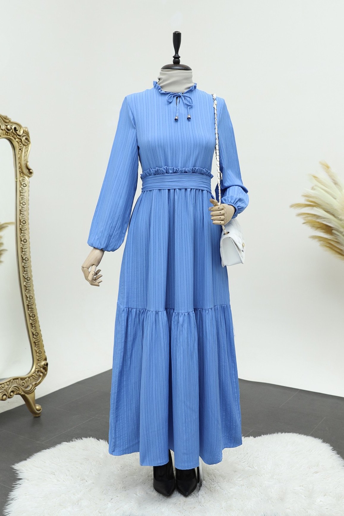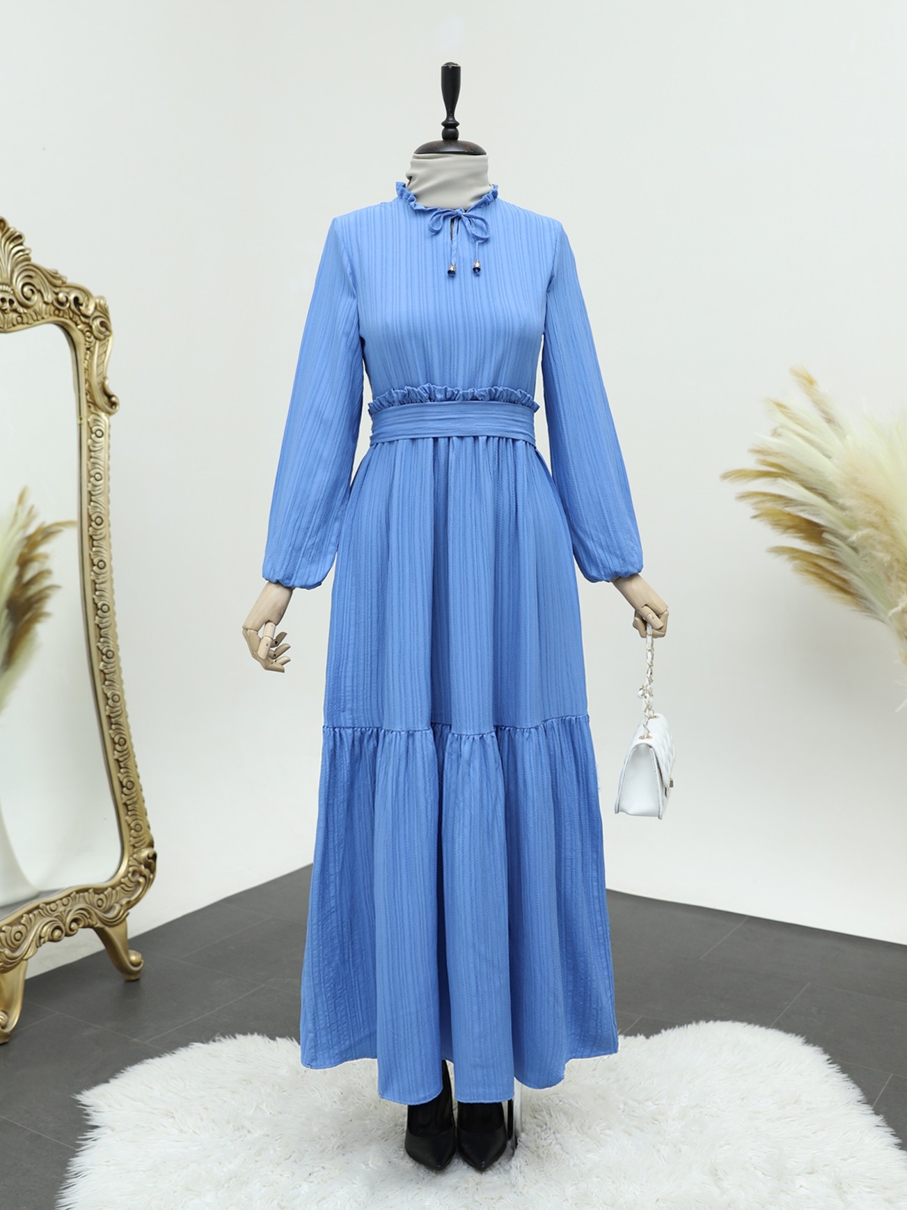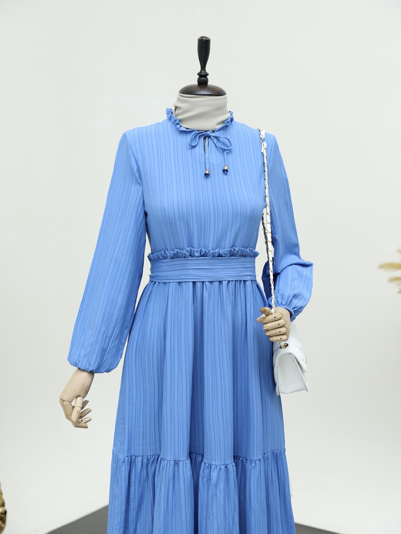 Yaka Fırfırlı Parçalı Gofre Elbise -Mavi