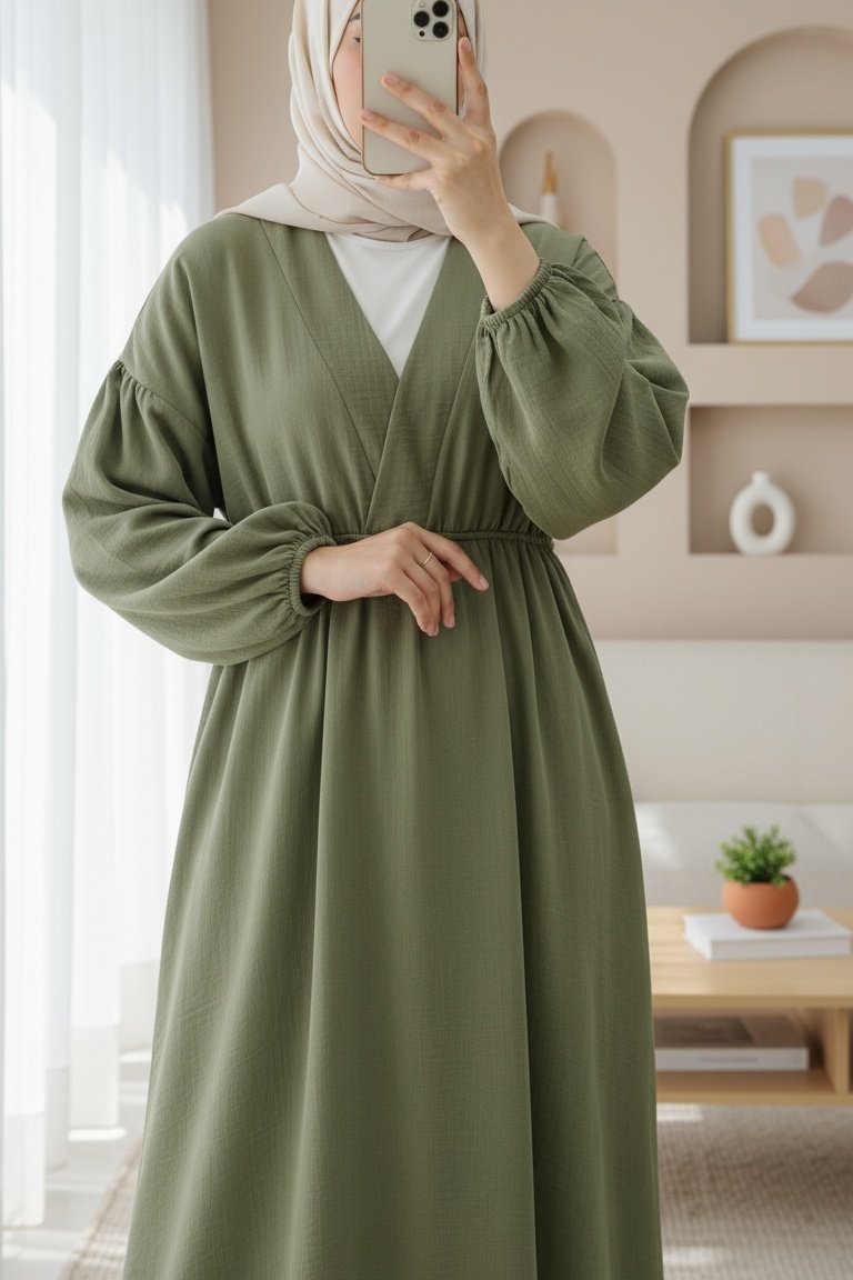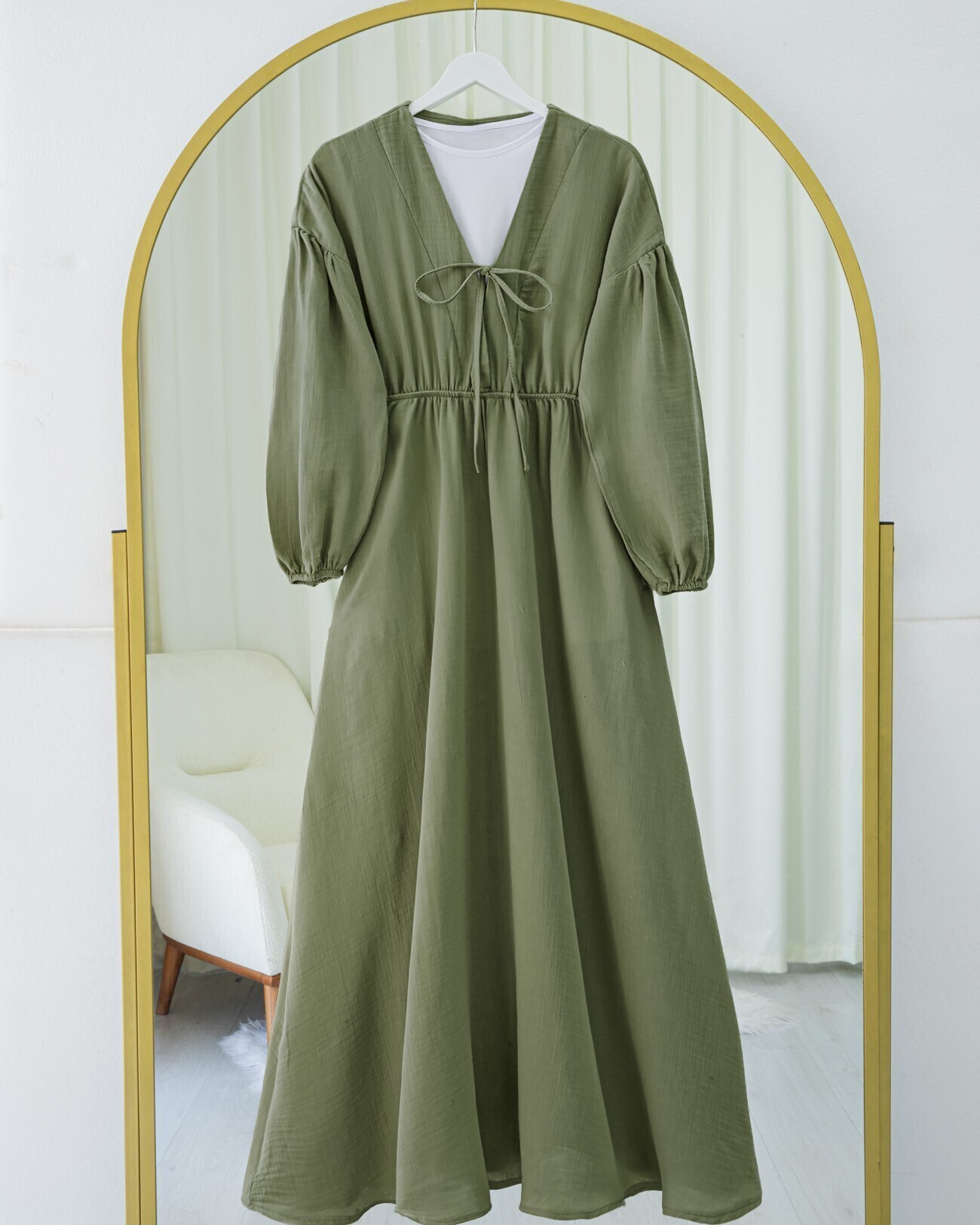 Nefes alan müslin kumaşıyla rahatlık sağlayan bu elbise, bağlamalı yaka ve lastikli kol-beli ile zarif ve şık bir duruş sunar. Günlük ve özel anlar için ideal.
