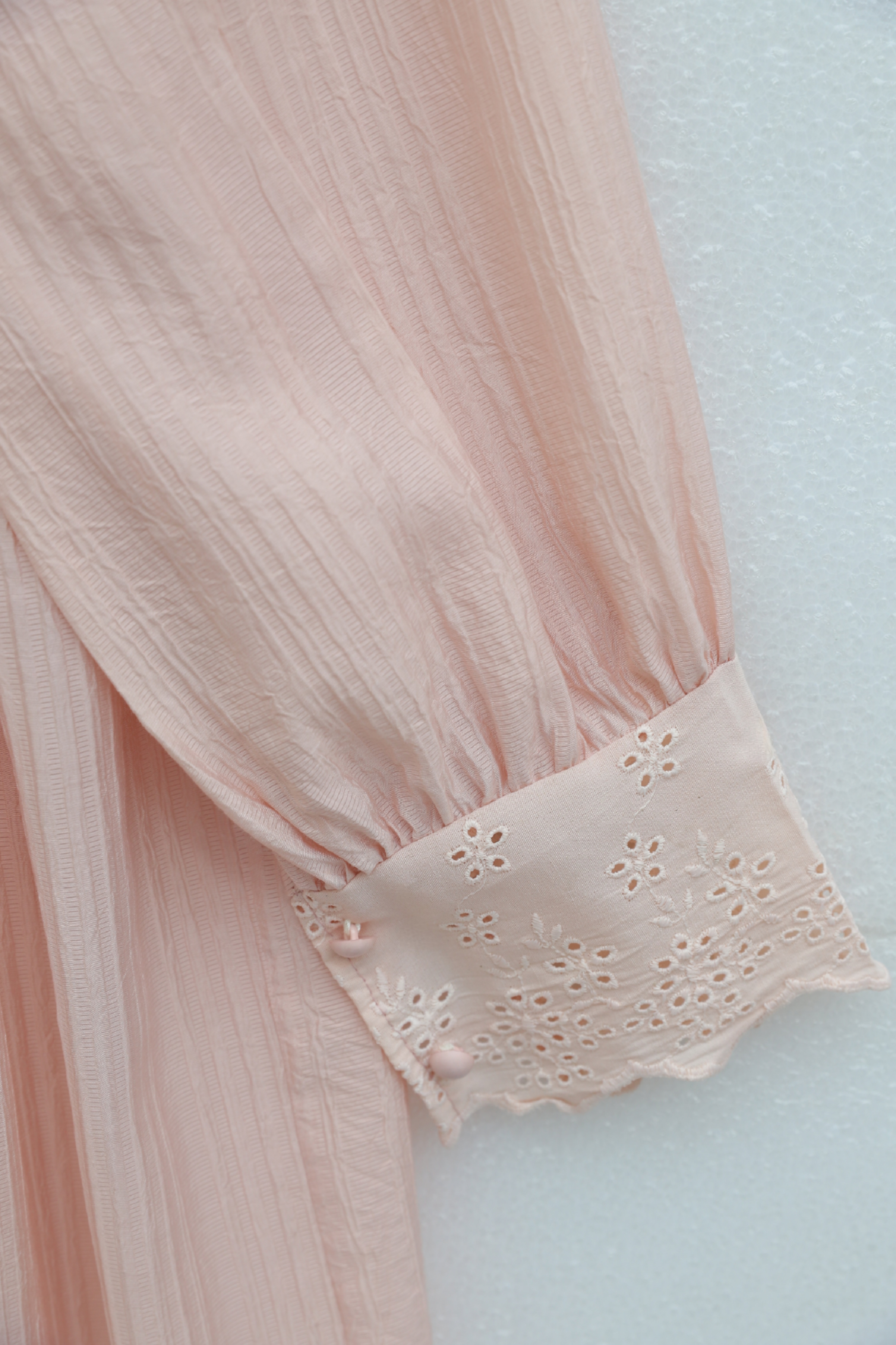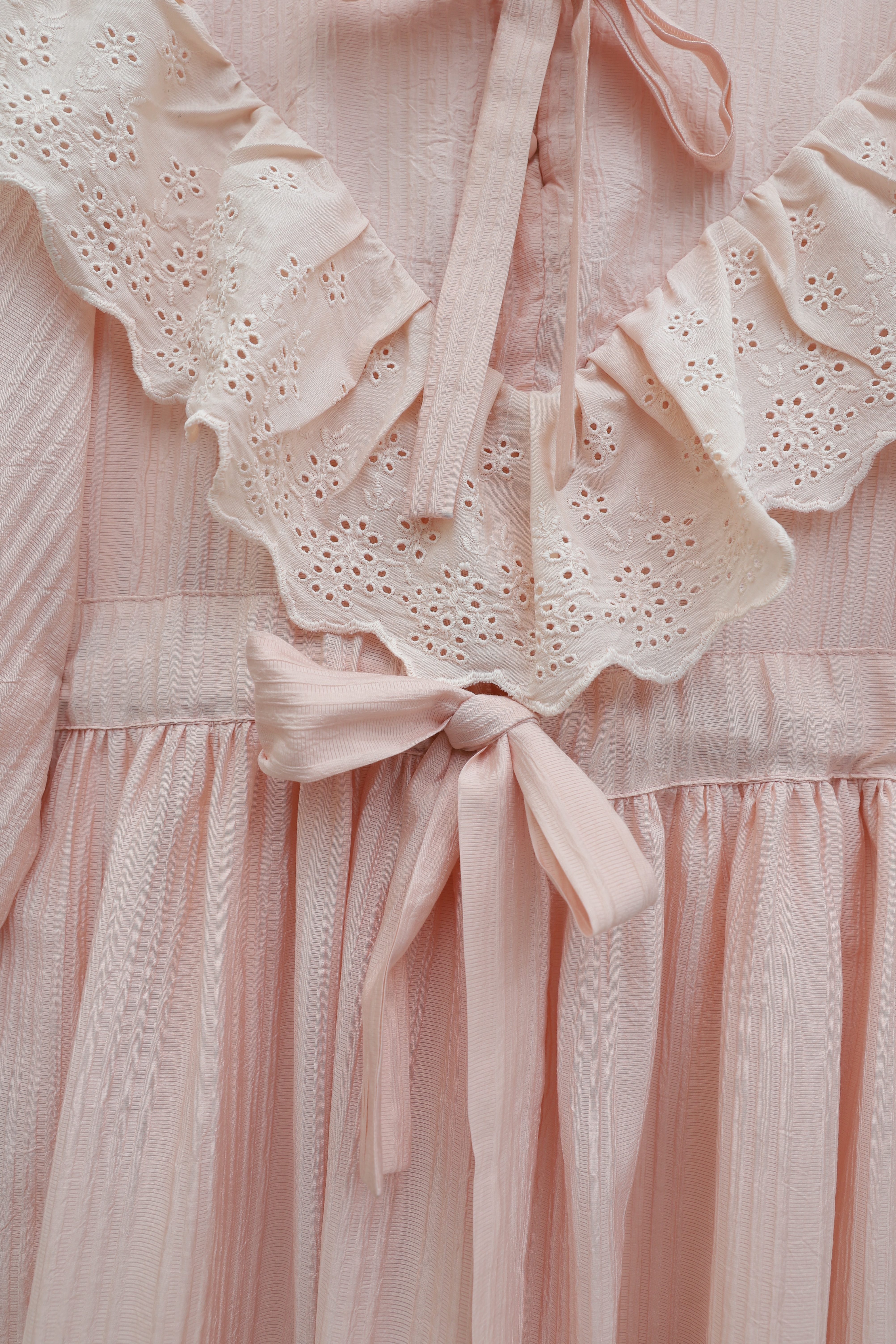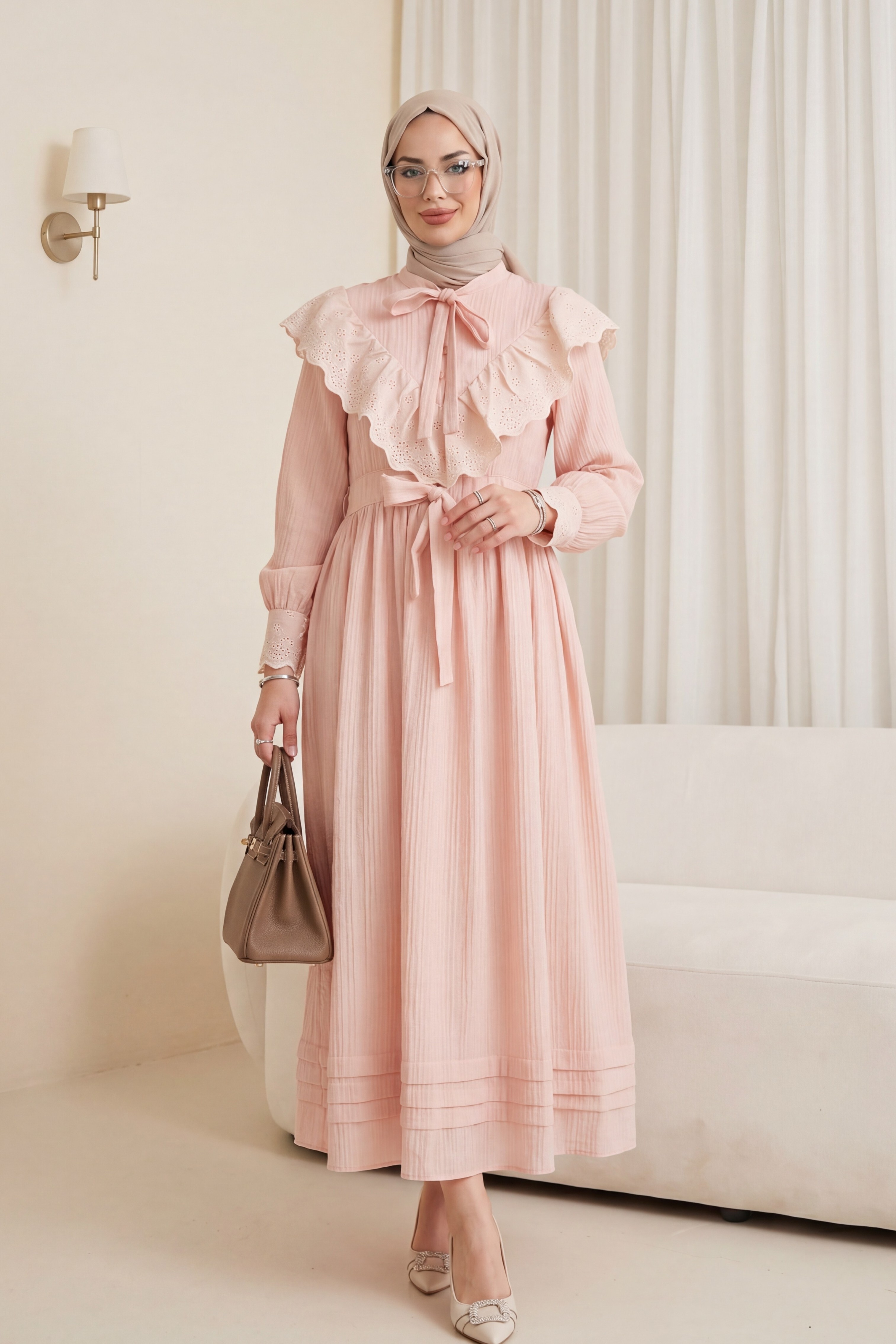 Yakası Ve Beli Bağlamalı Fistolu Astarlı Krinkıl Elbise -Pudra