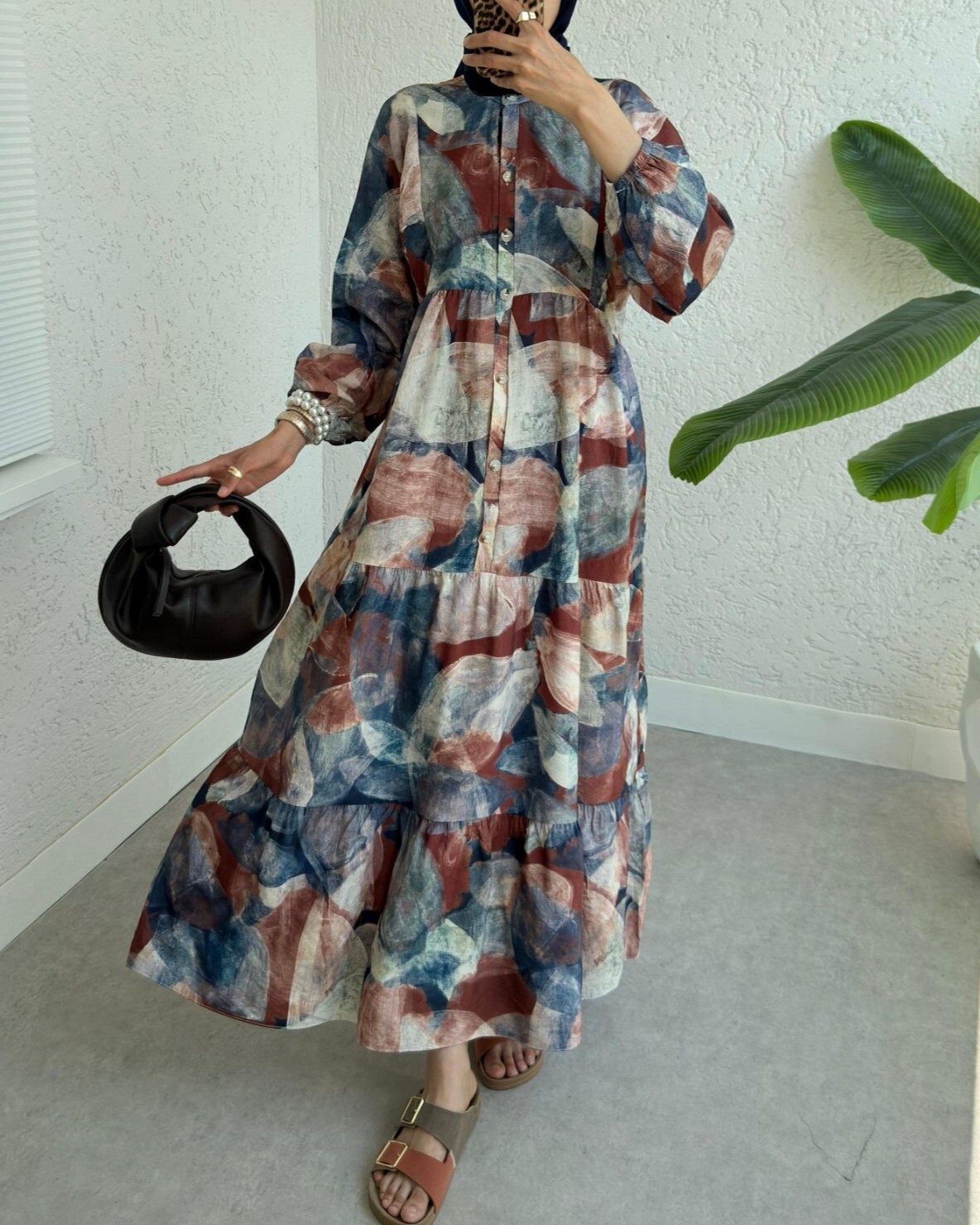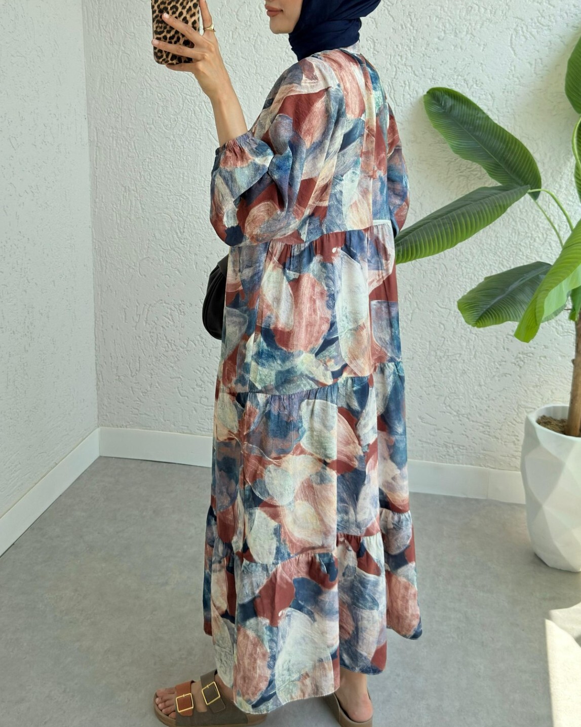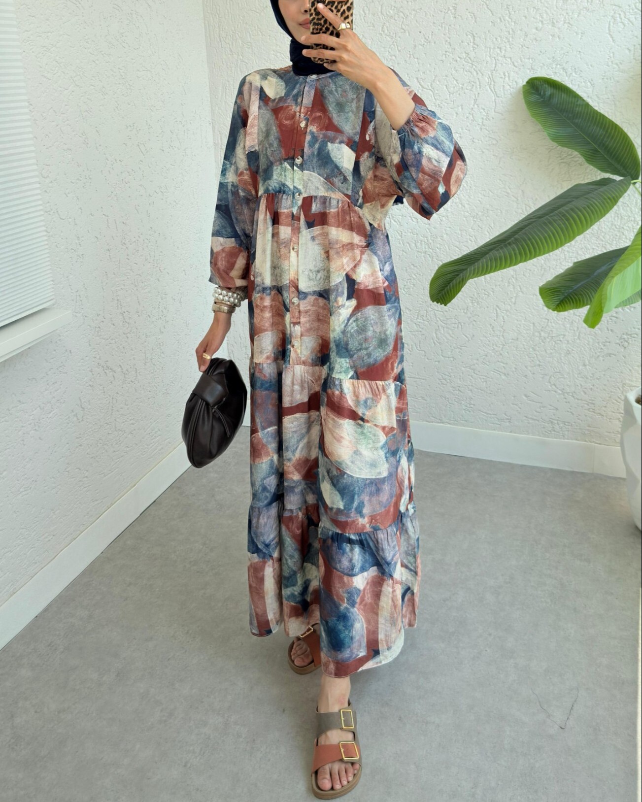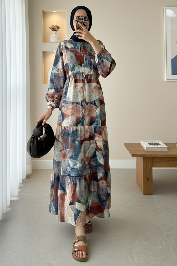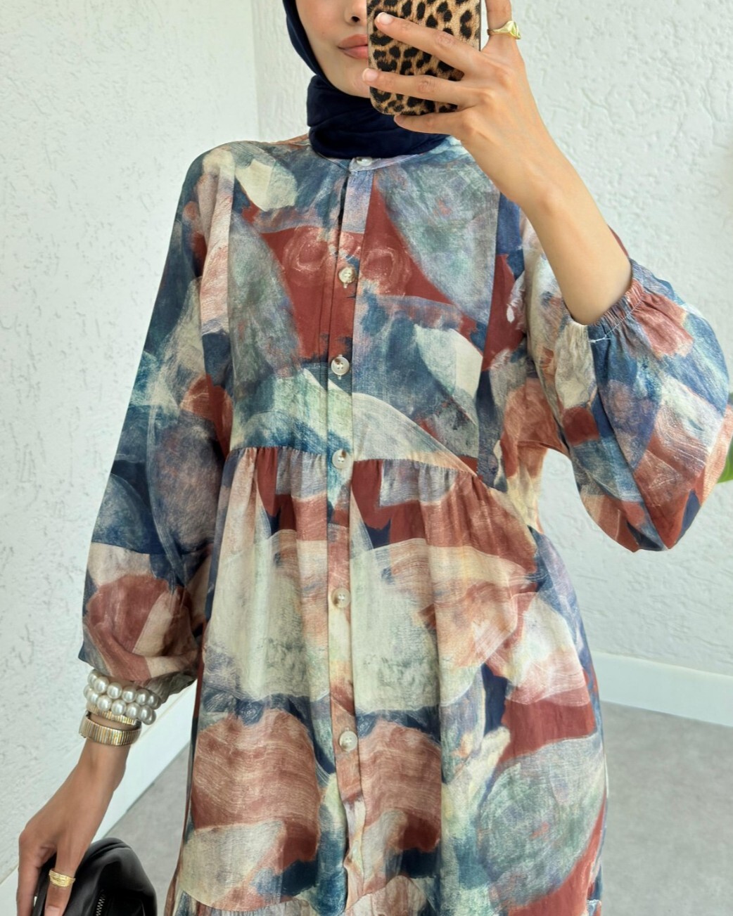 Yarım Düğmeli Kolu Lastikli Batik Desenli Elbise, batik desenin enerjisini zarif detaylarla buluşturuyor. Yarım düğme tasarımı ve kol lastiği sayesinde hem şık hem de konforlu bir kullanım sunar. Hafif kumaşıyla yaz aylarında ferah bir stil arayanlar için ideal bir tercihtir. Günlük kombinlerde ve hafta sonu şıklığında öne çıkmak isteyenler için mükemmel bir seçim!