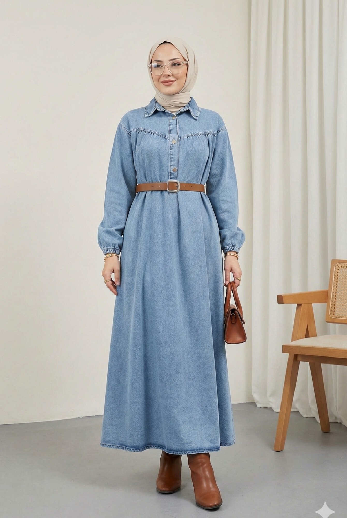 “Kemerli kot elbise”, “yarım düğmeli denim elbise”, “kolu lastikli kot elbise”, “günlük kot elbise modeli” gibi adlandırılabilir.