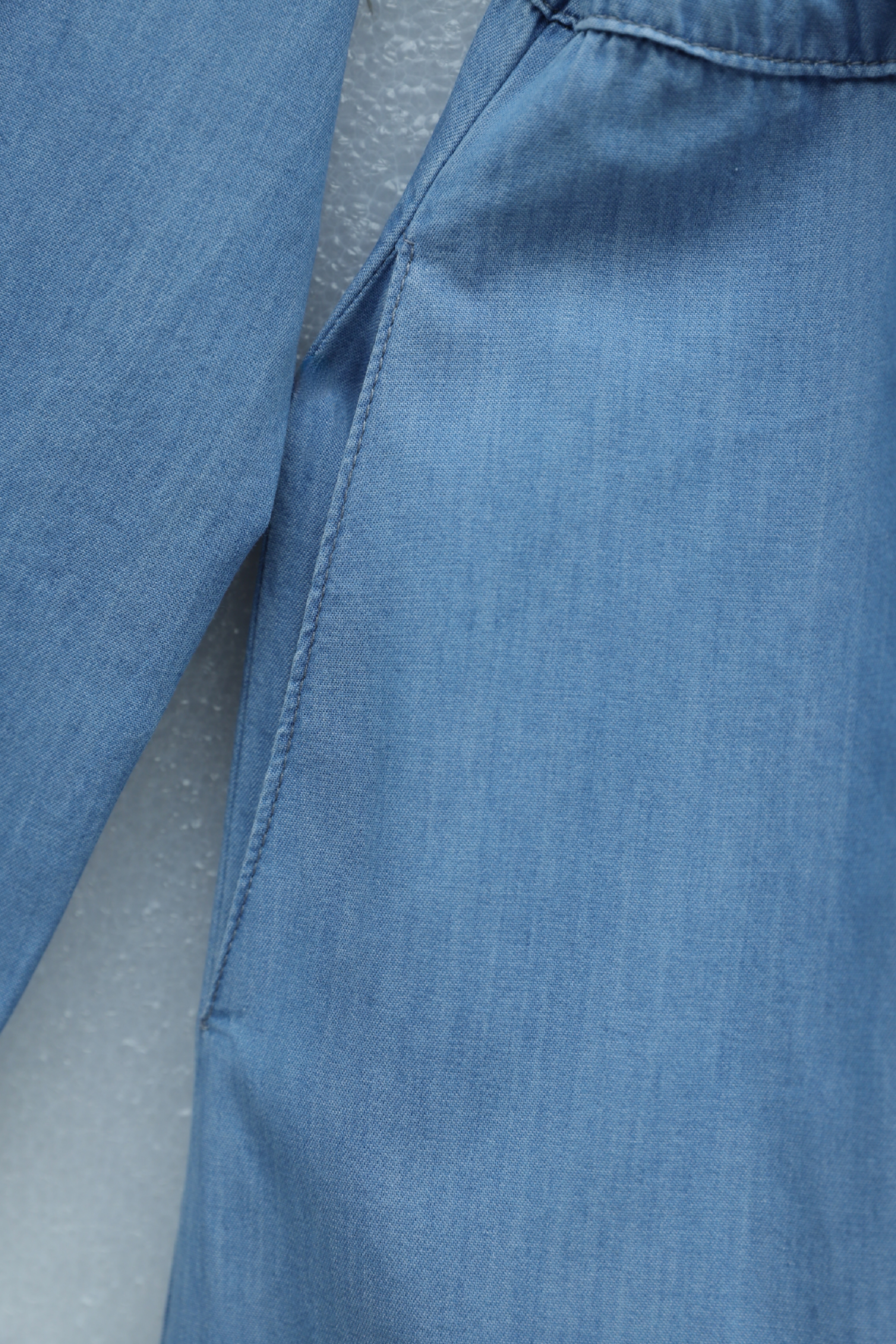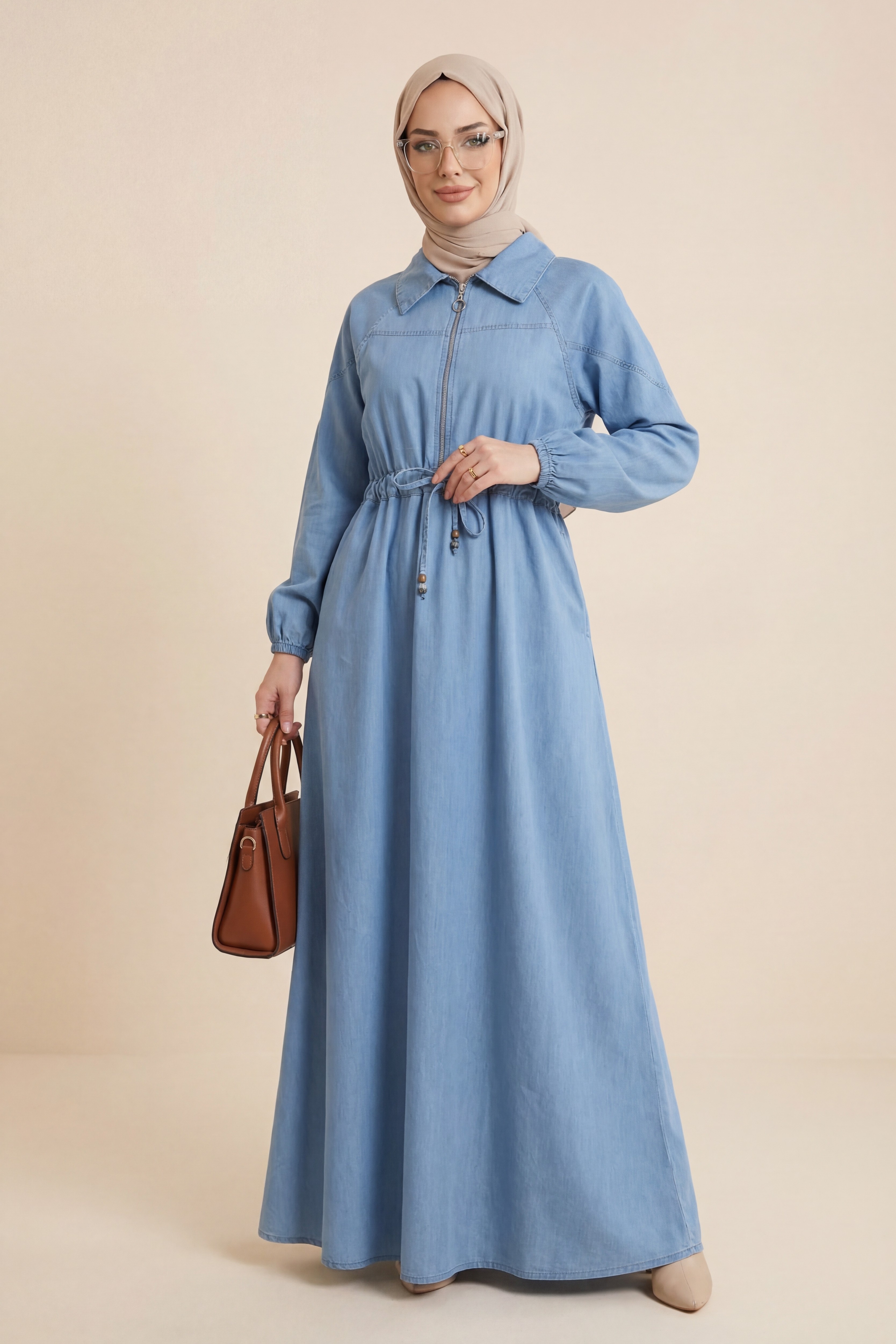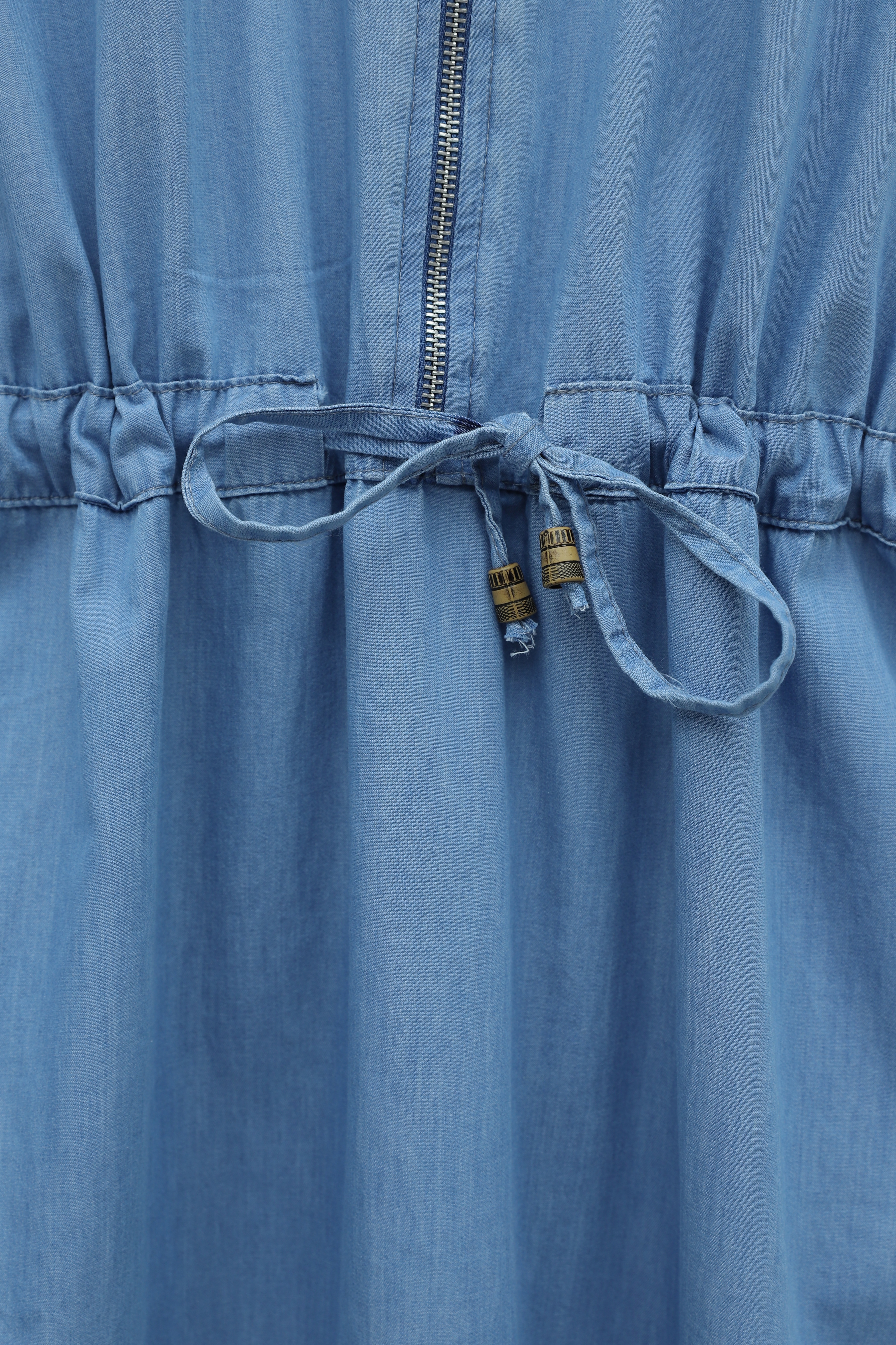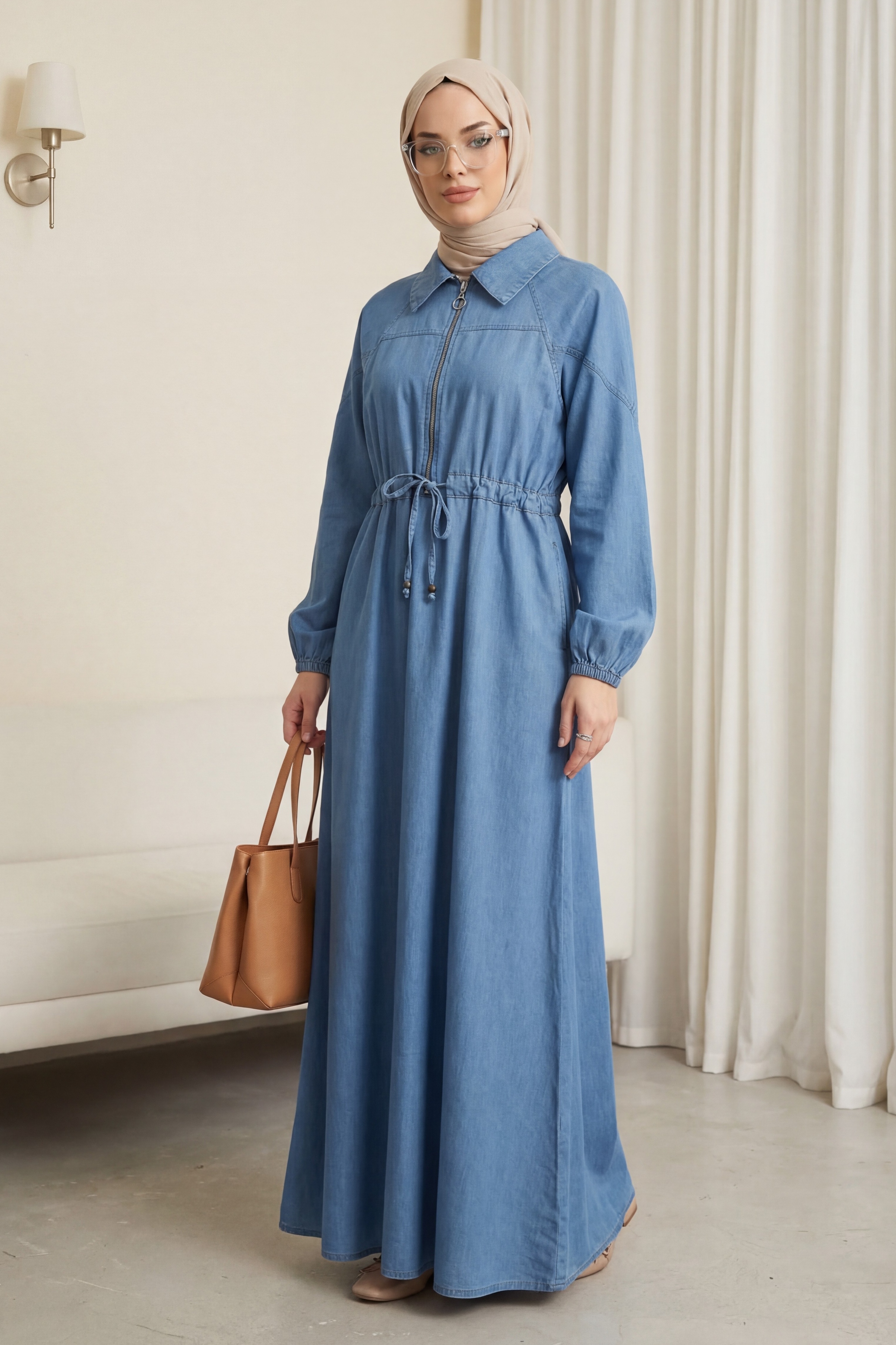 Yarım Fermuarlı Tünel Bağcıklı Cepli Tensel Kot Elbise, spor ve rahat şıklığı bir arada sunar. Yarım fermuar ve tünel bağcık detayı ayarlanabilir bir form kazandırırken, cepli tasarımı pratik kullanım sağlar. Tensel kot kumaşı hafif ve nefes alabilendir. Vücuda oturan fakat sıkmayan ideal kalıbı ile konforlu bir duruş sunar.