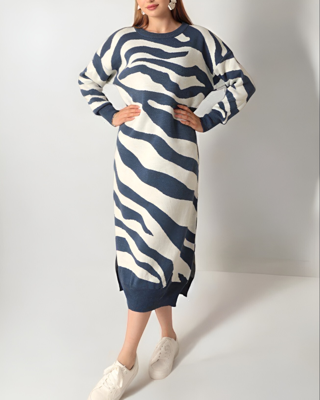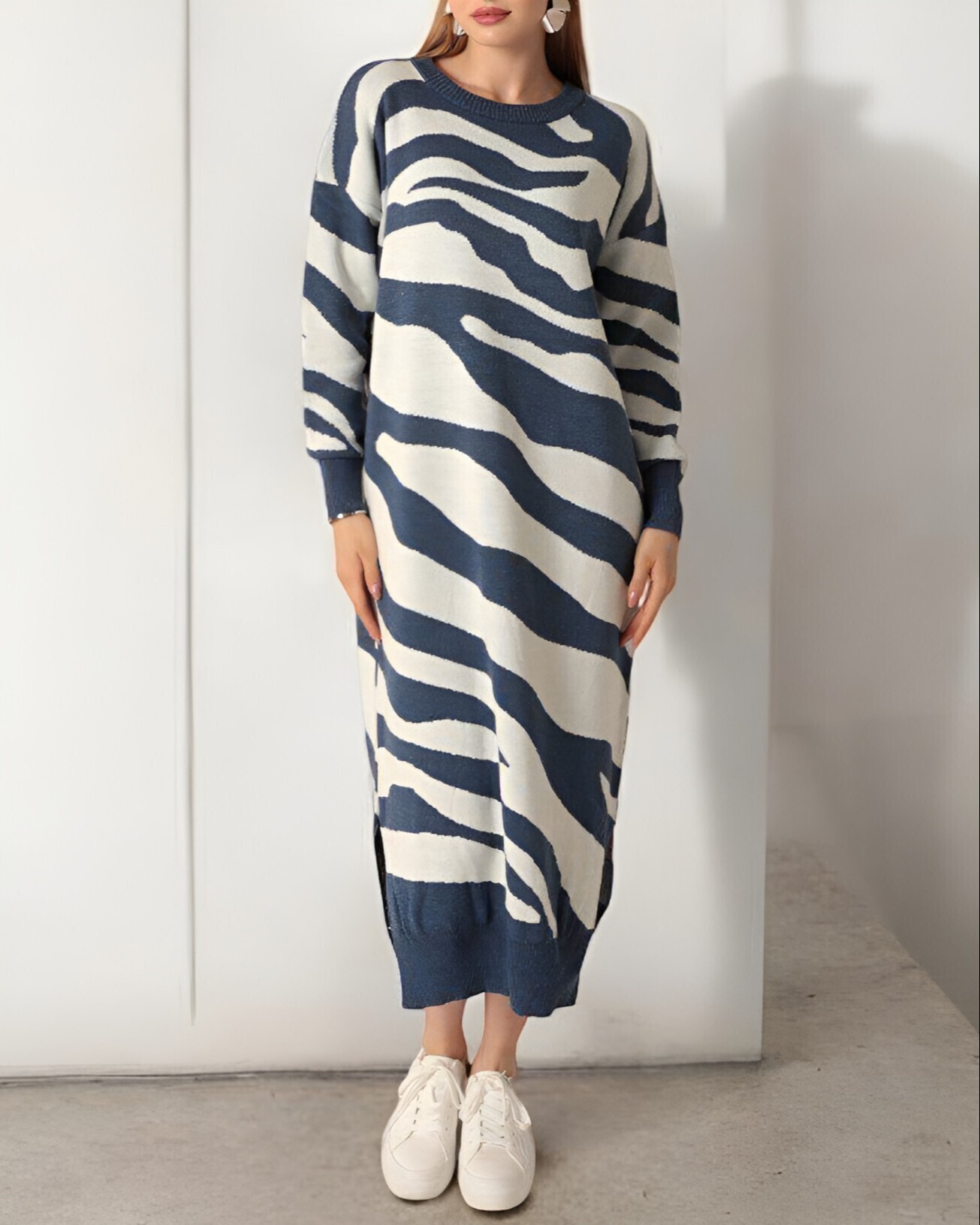 Yırtmaçlı Desenli Triko Elbise -İndigo
