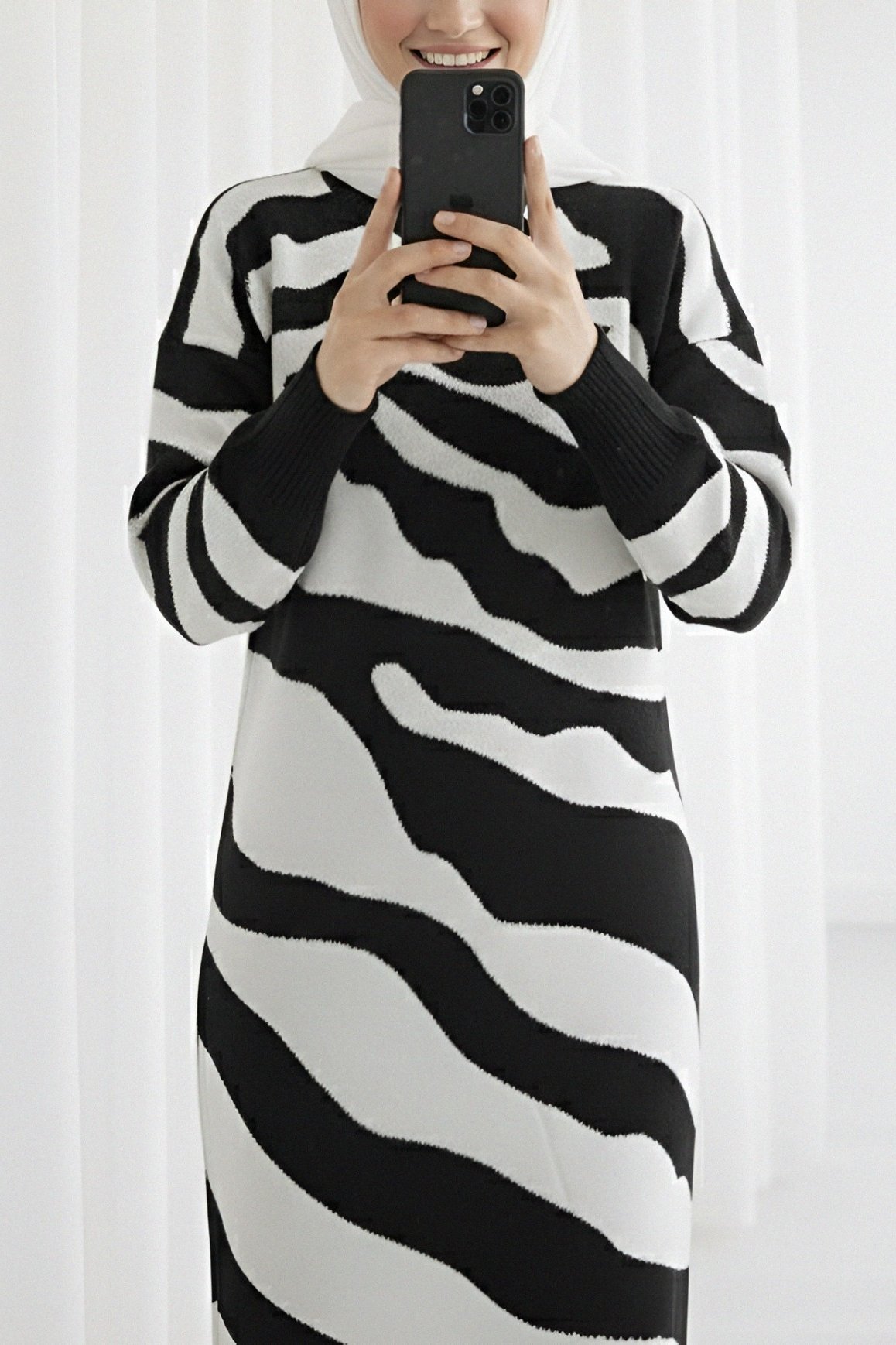 Yırtmaçlı Desenli Triko Elbise -Siyah