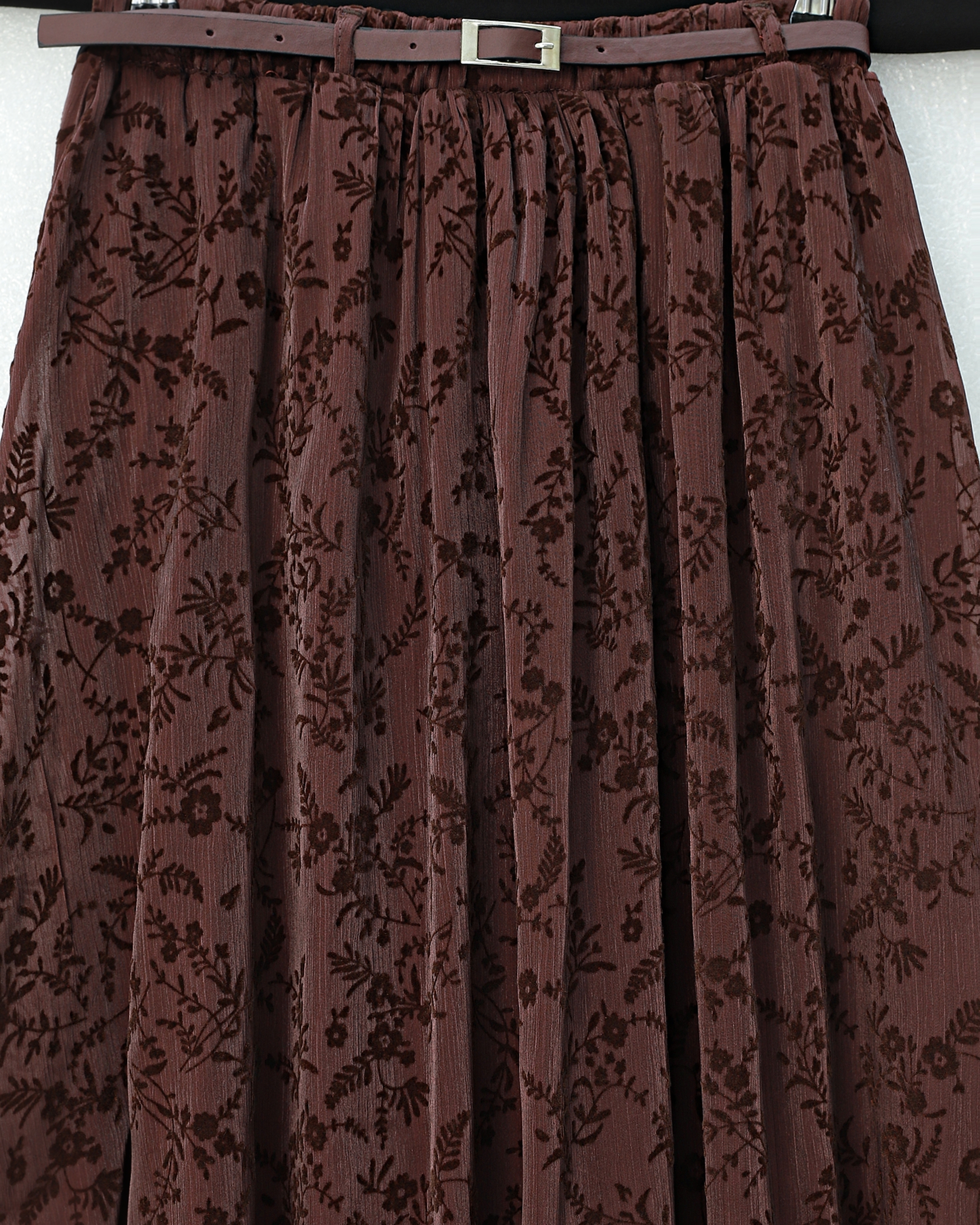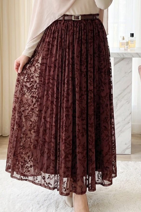 Astarlı Kemerli Kabartma Desenli Organze Etek -K. Bordo