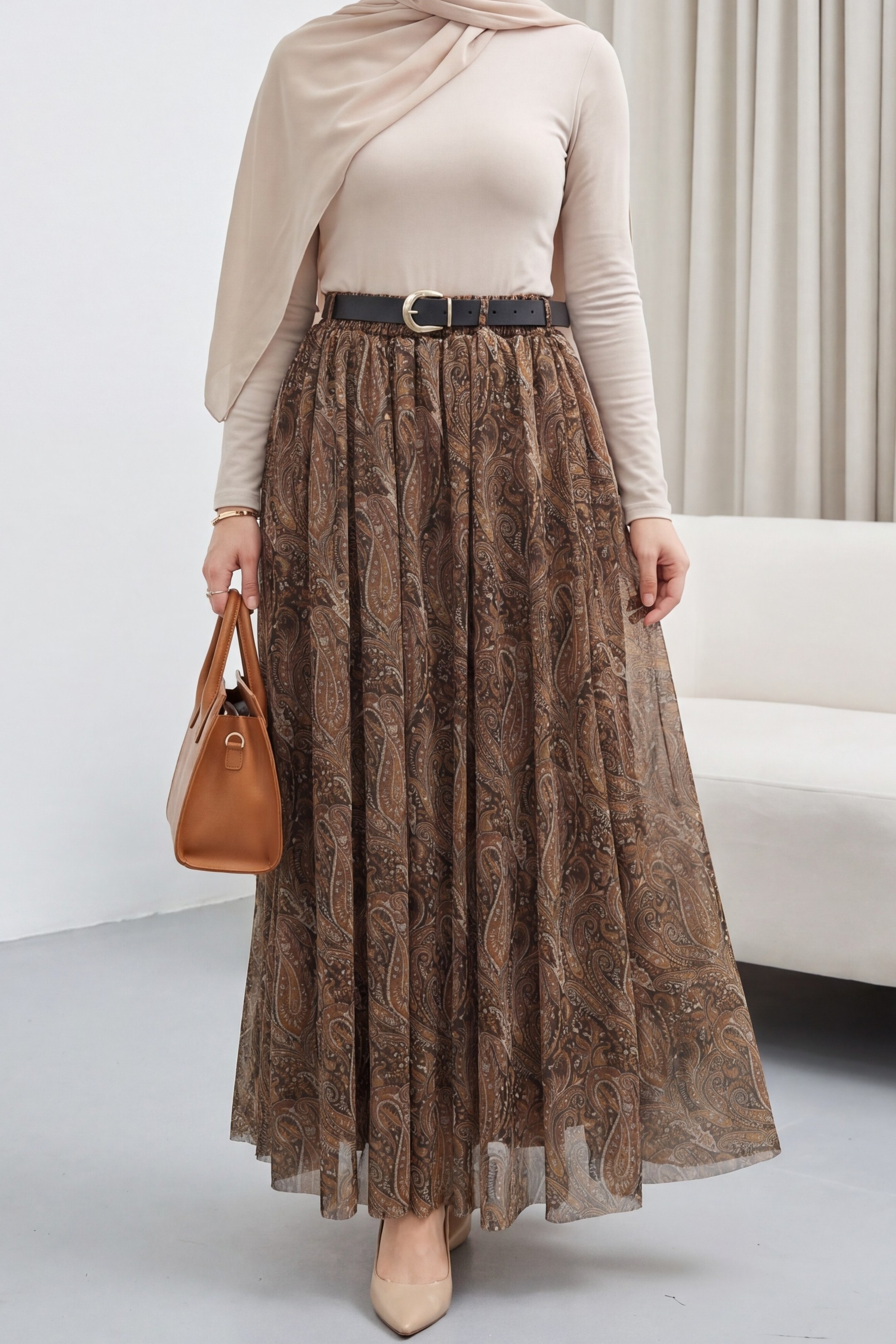 Beli Lastikli Kemerli Astarlı Desenli Tül Etek -Taba