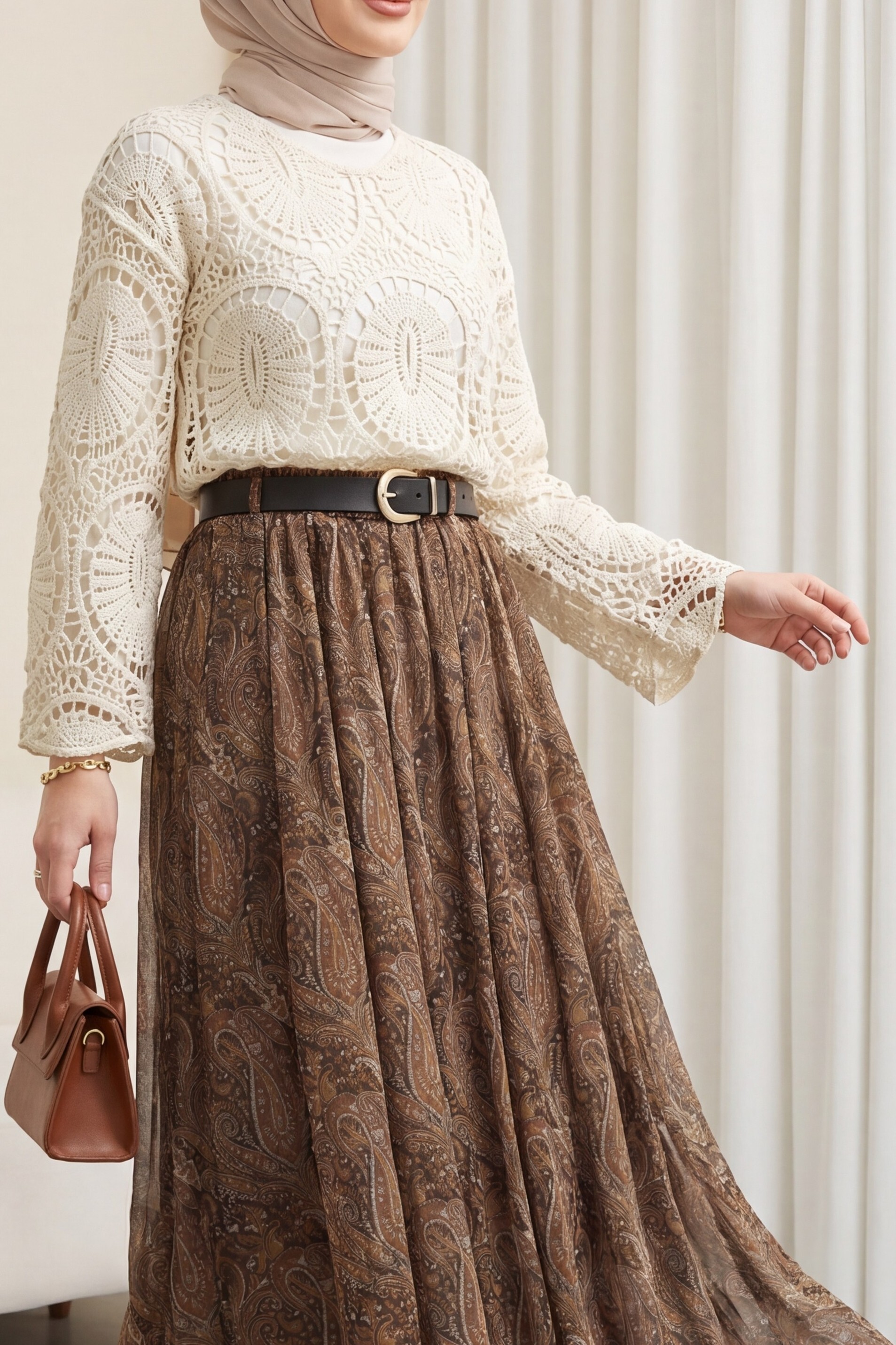 Kombindeki şal, çanta, ayakkabı ve takılar aksesuar olarak kullanılmıştır.