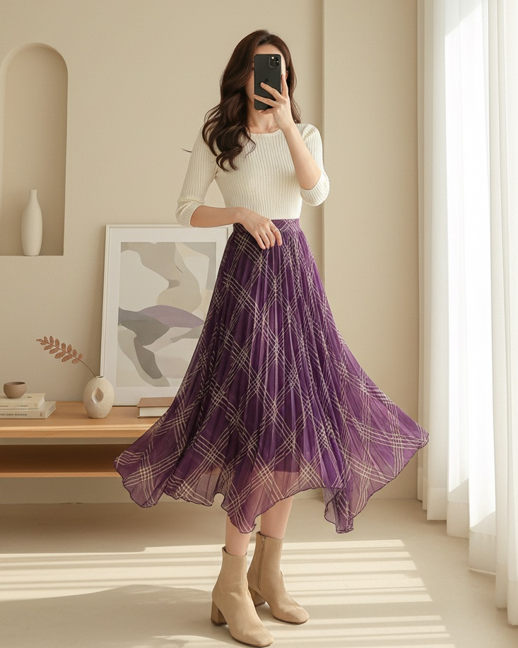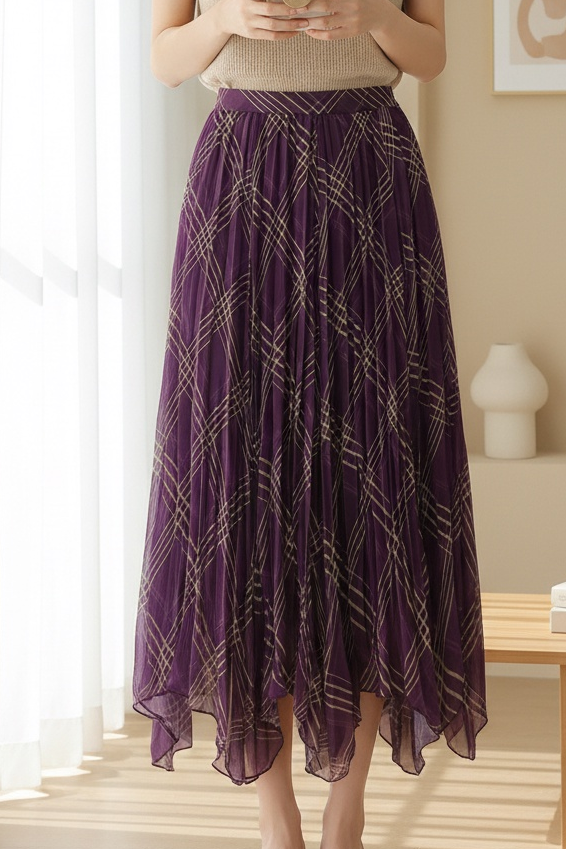 Eteği Asimetrik Kesim Astarlı Şifon Etek -Mor