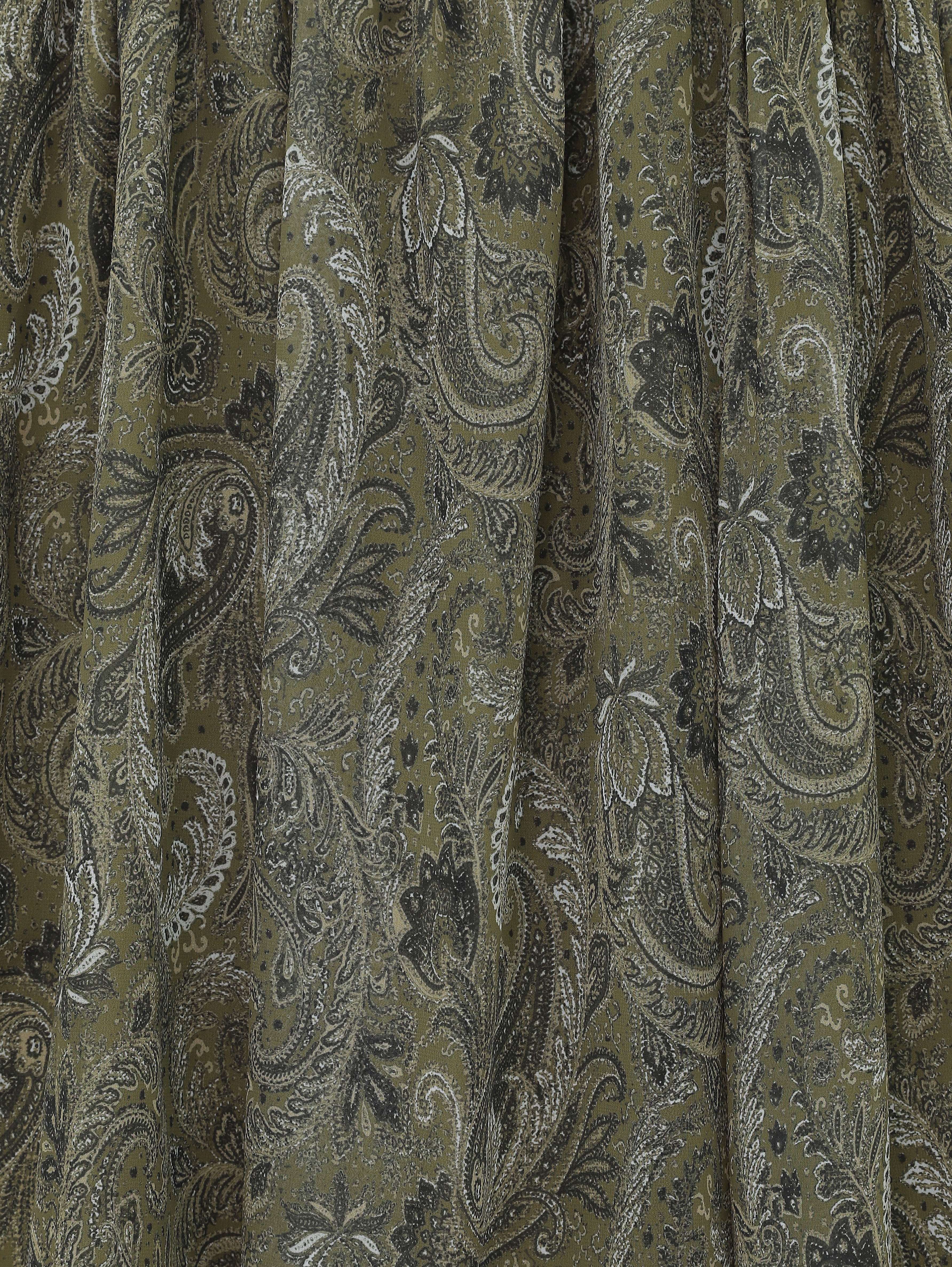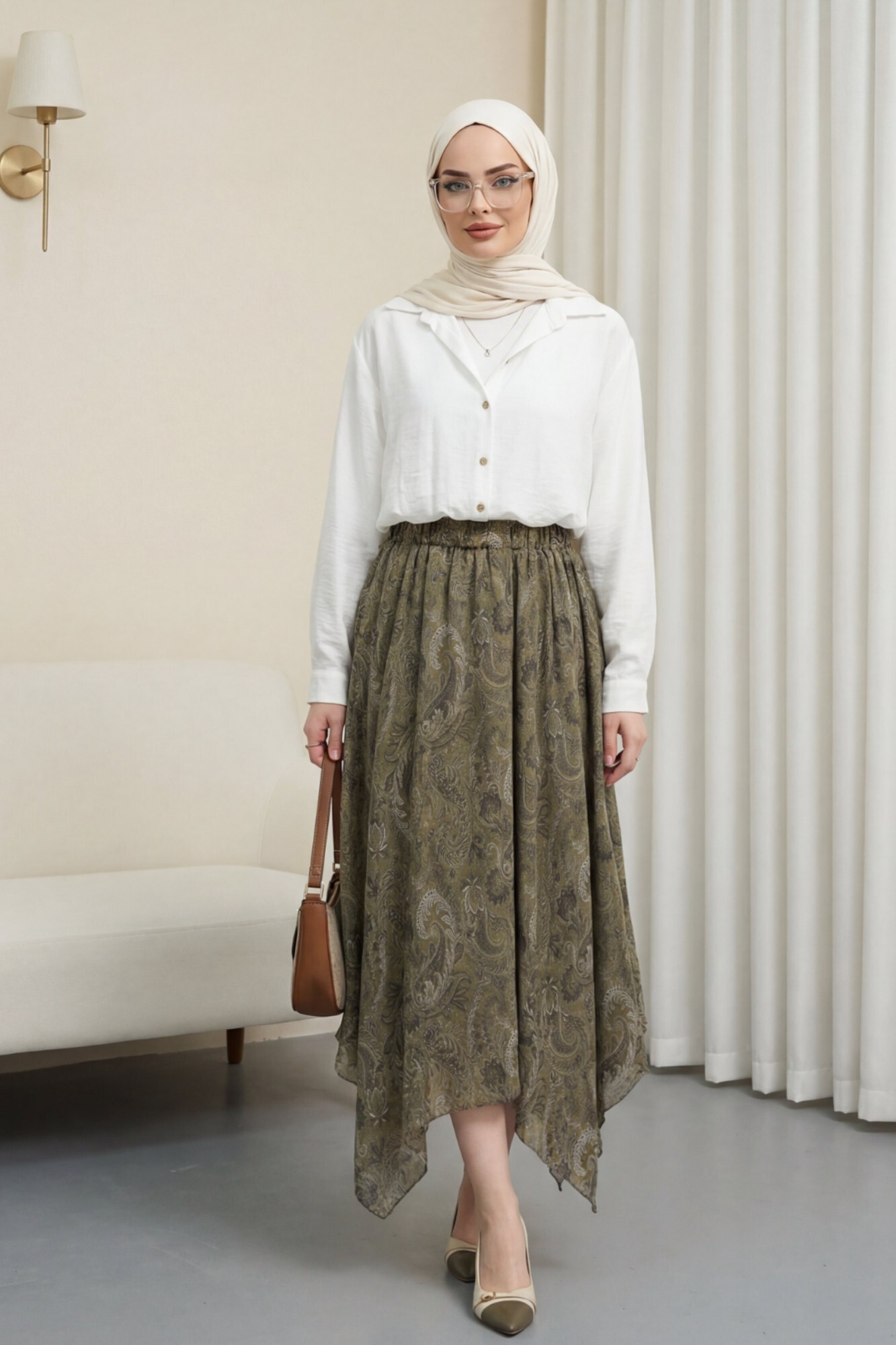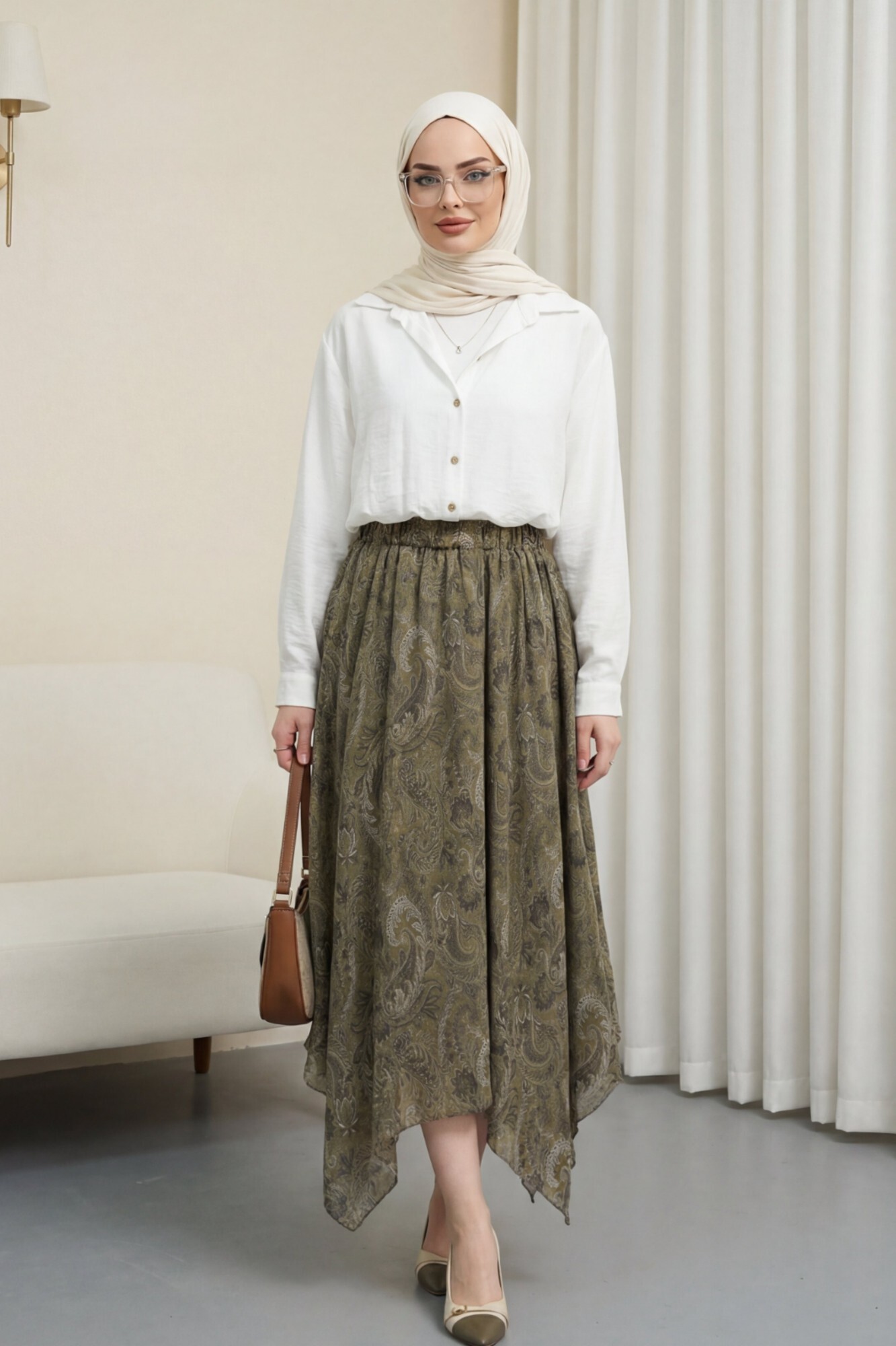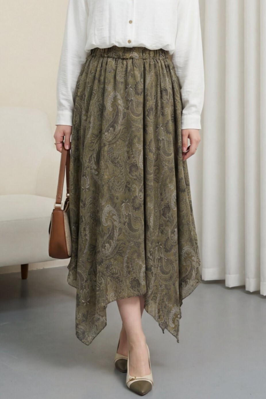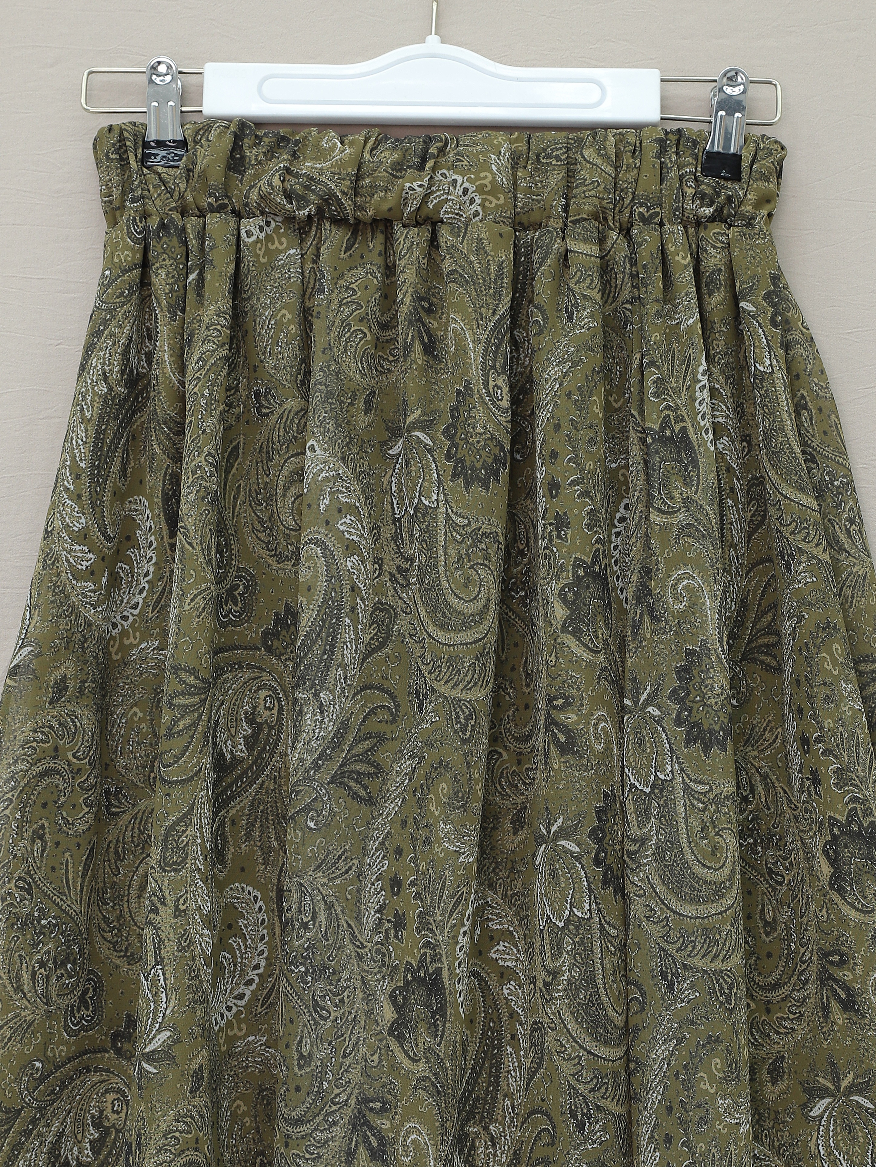 Etnik Desen Beli Lastikli Astarlı Ucu Asimetrik Kesim Şifon Etek -Haki
