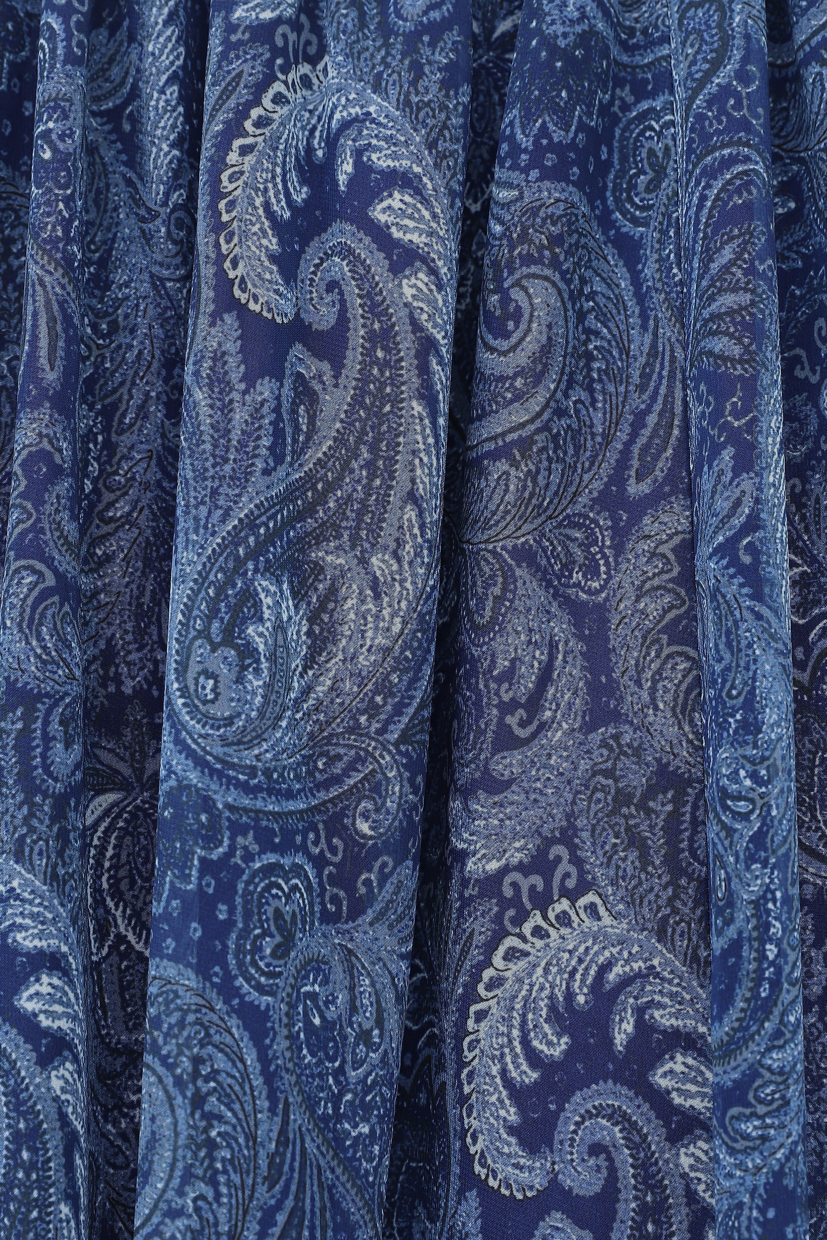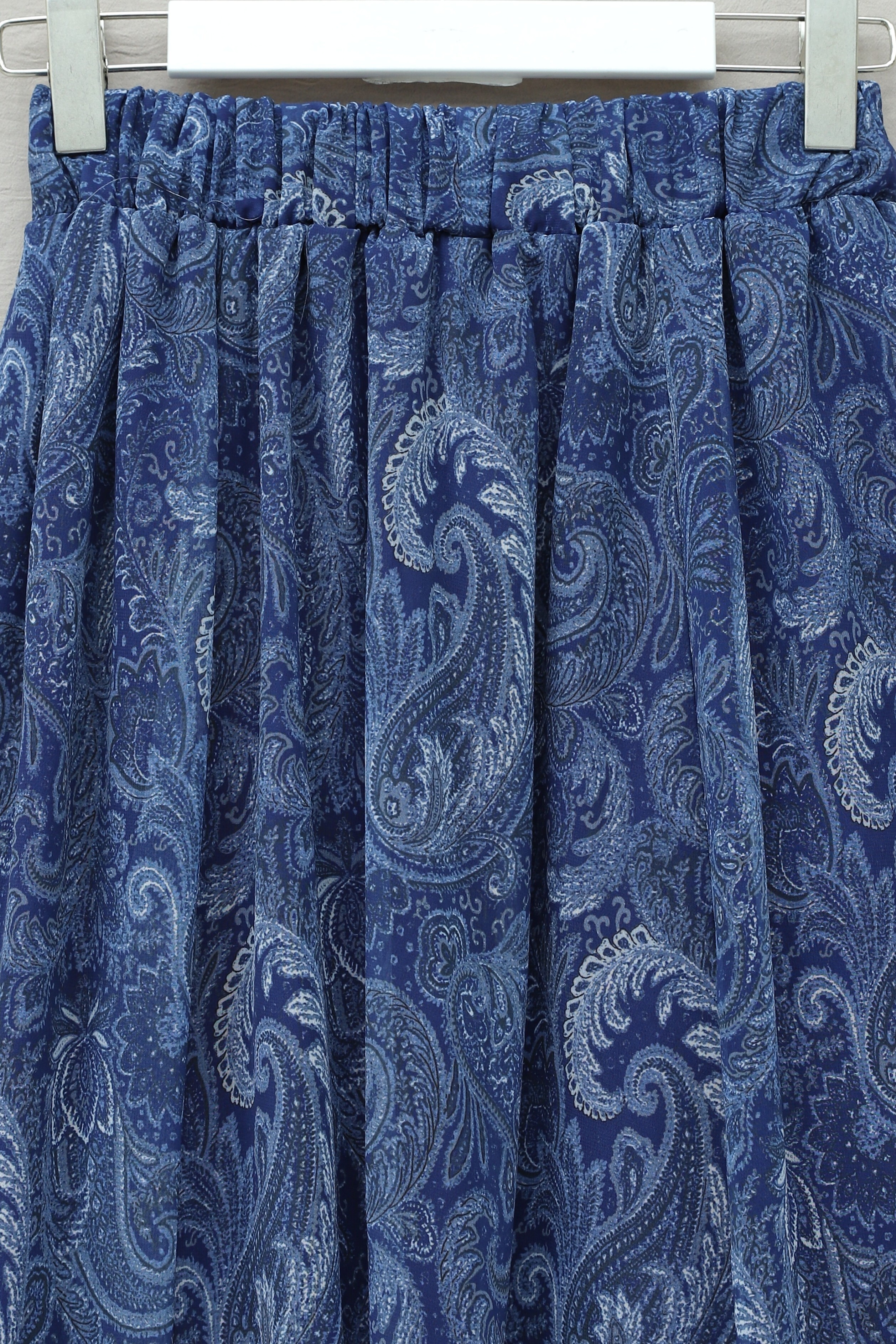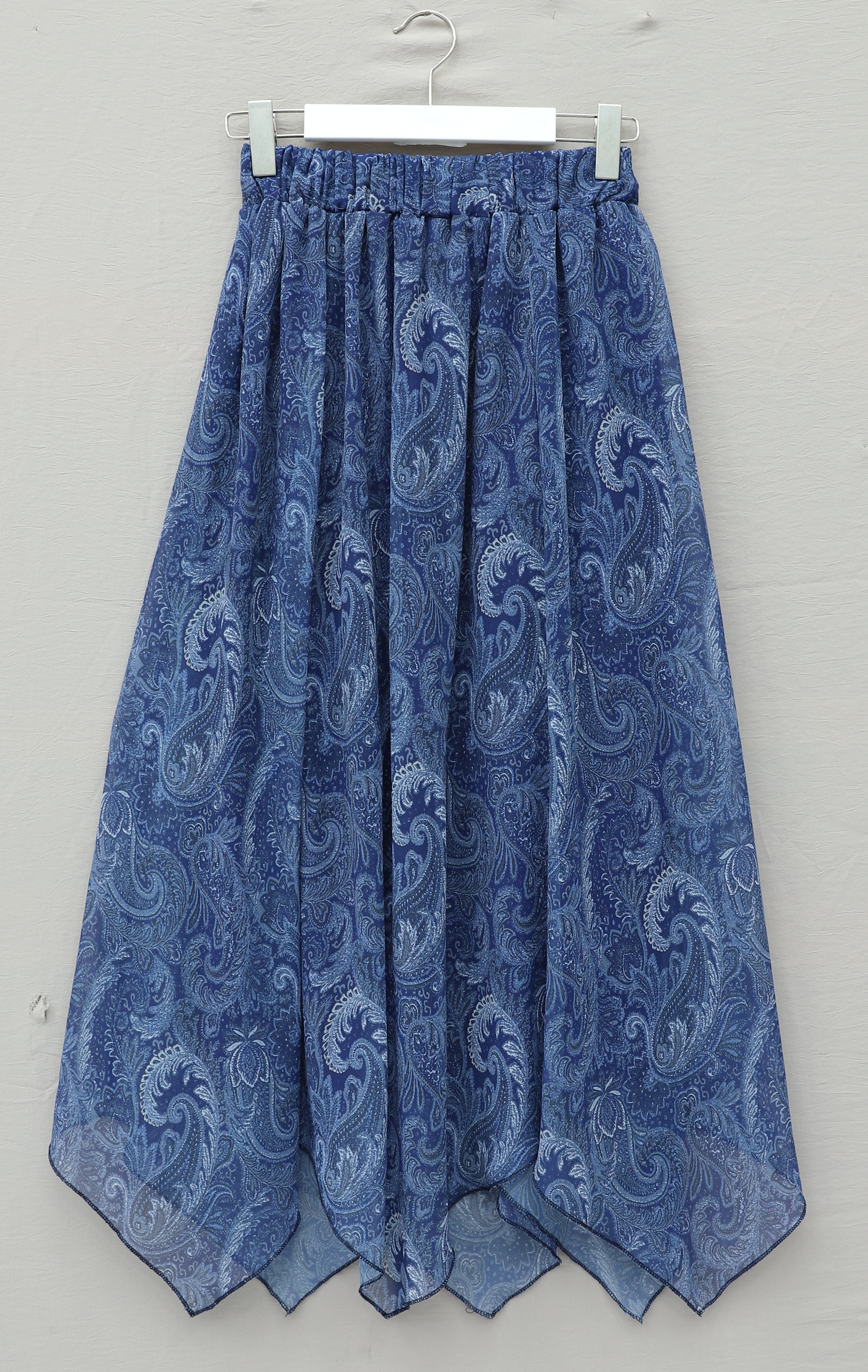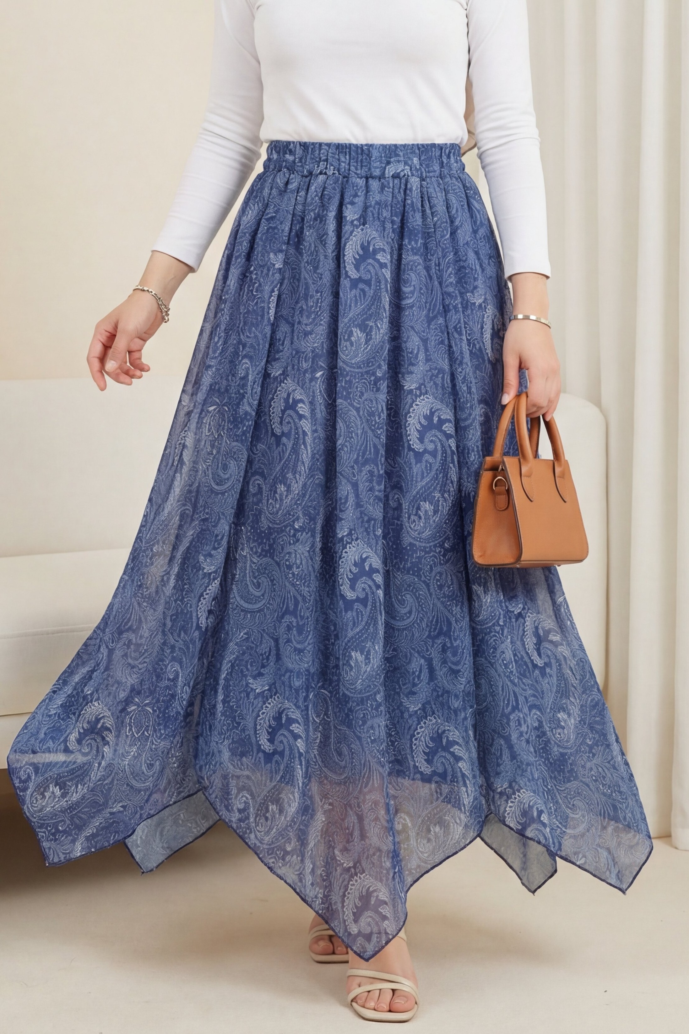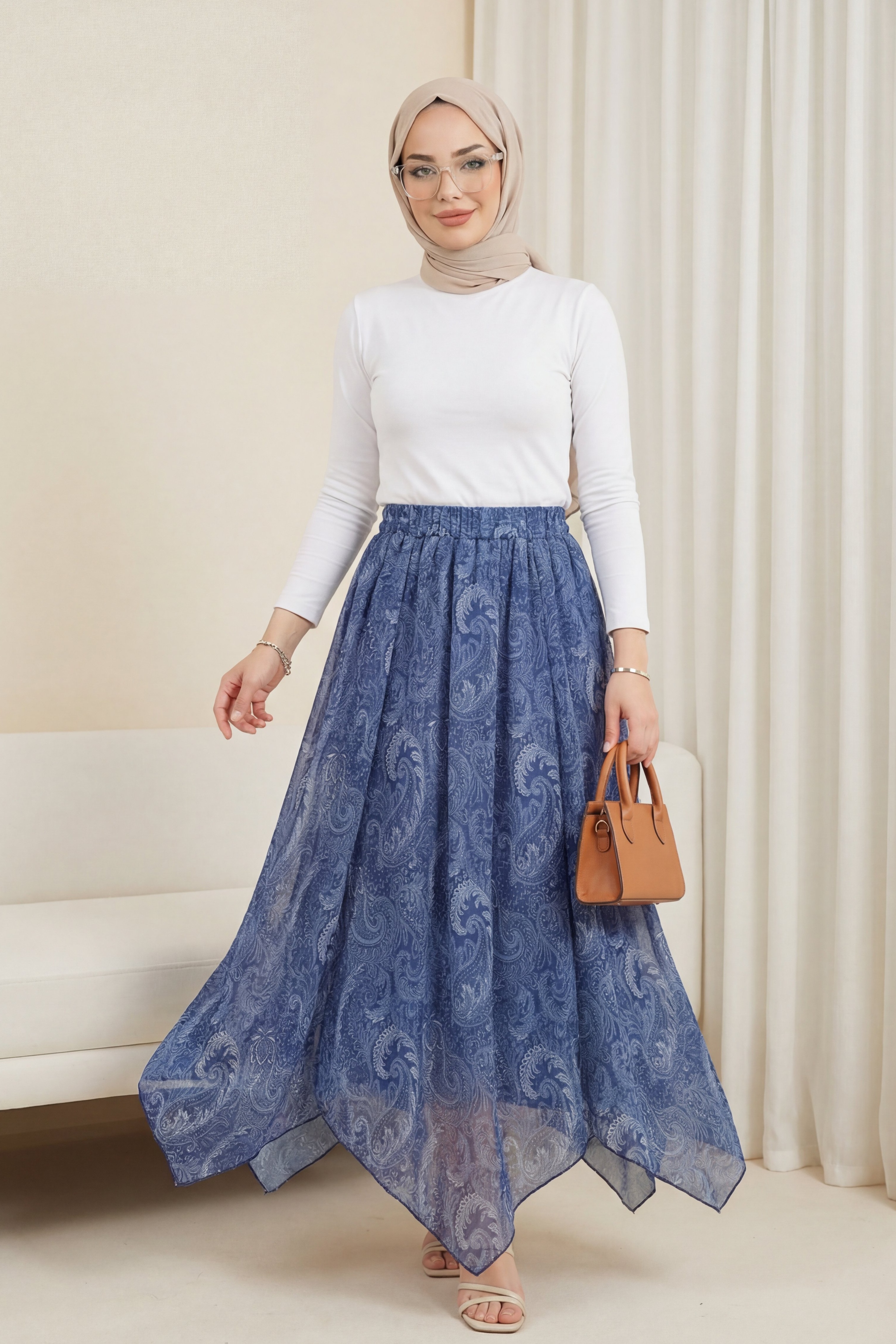 Etnik Desen Beli Lastikli Astarlı Ucu Asimetrik Kesim Şifon Etek -İndigo