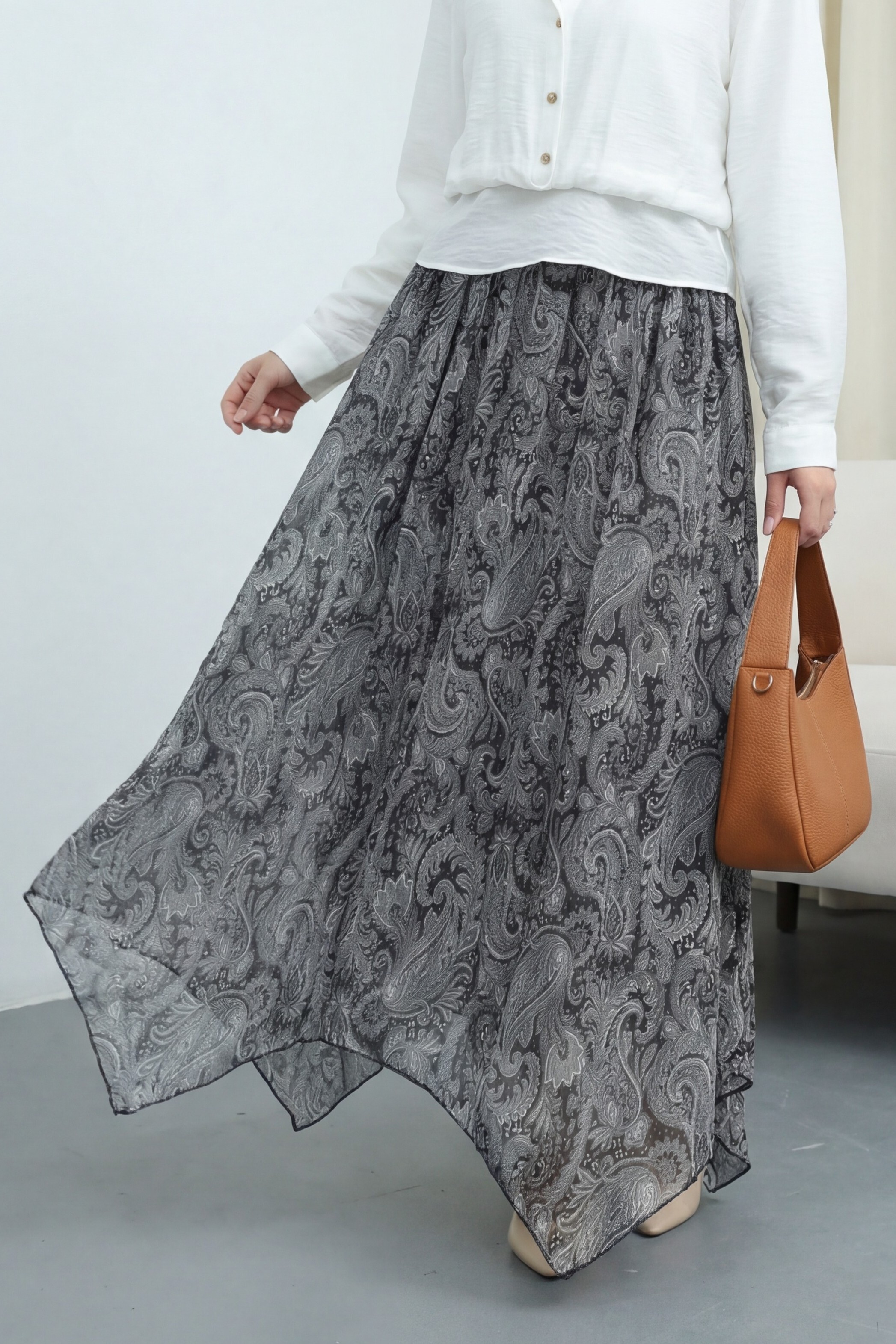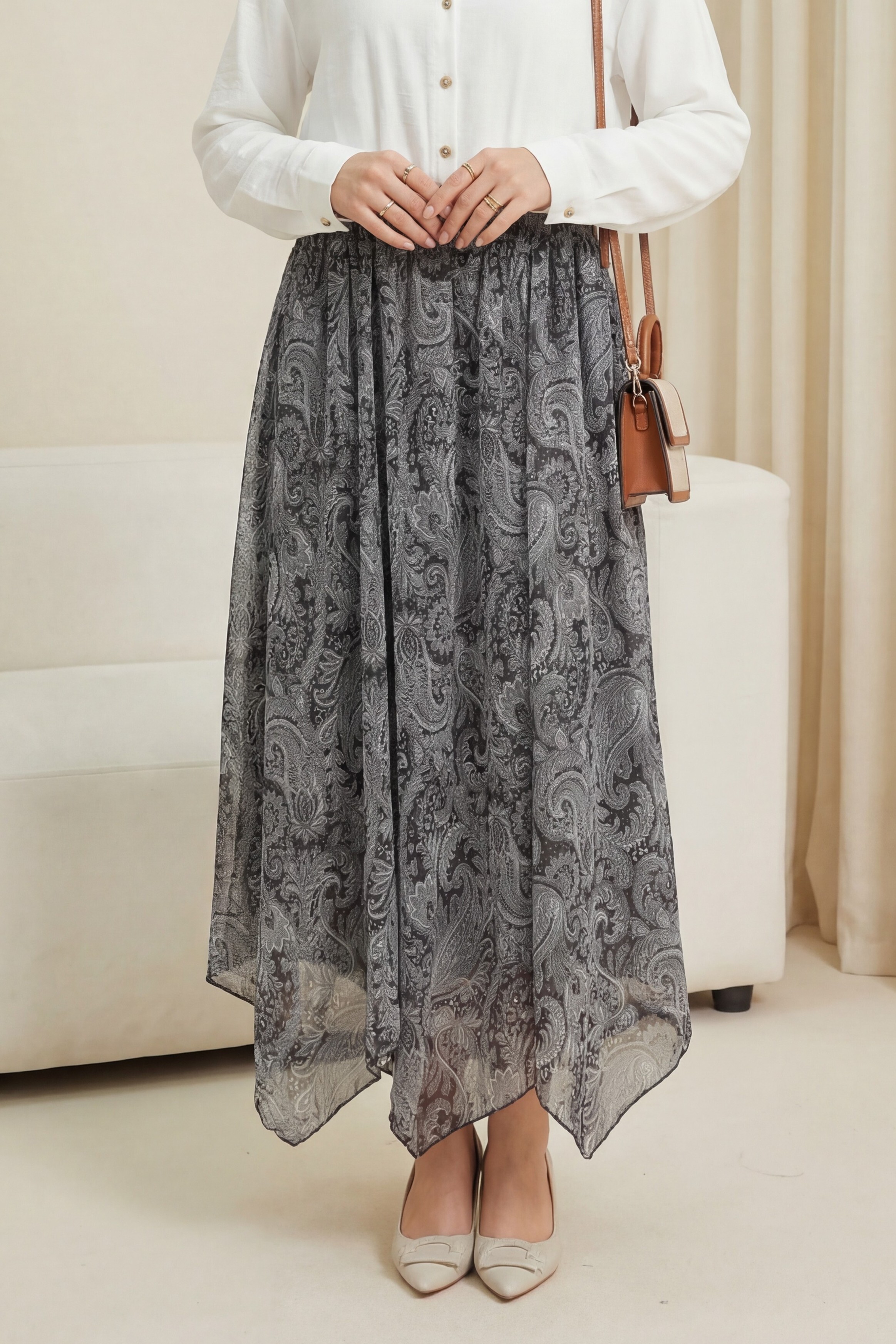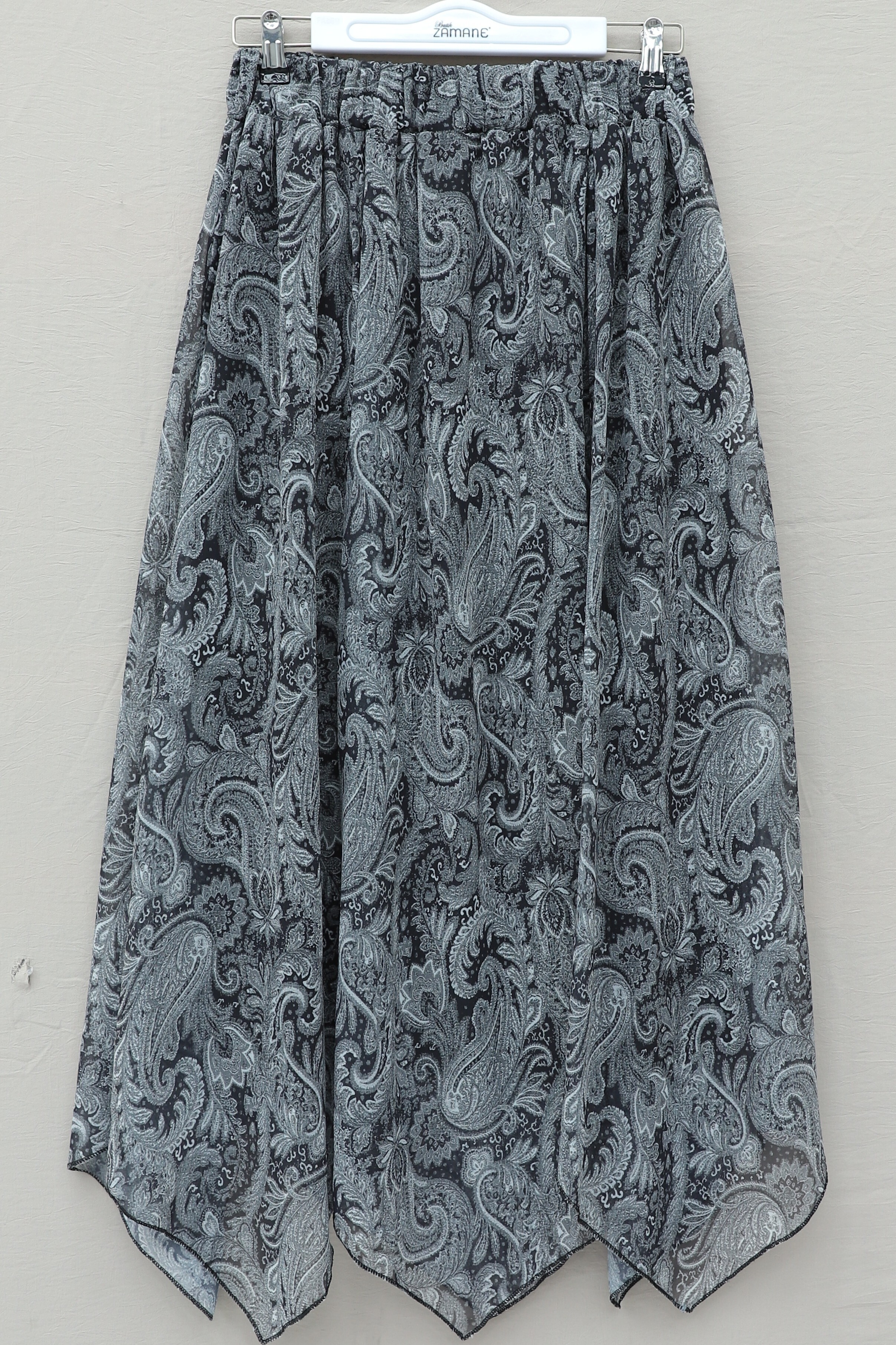 “Etnik desenli şifon etek”, “asimetrik kesim etek”, “beli lastikli kadın etek”, “astarlı şık etek modeli” gibi adlandırılabilir.