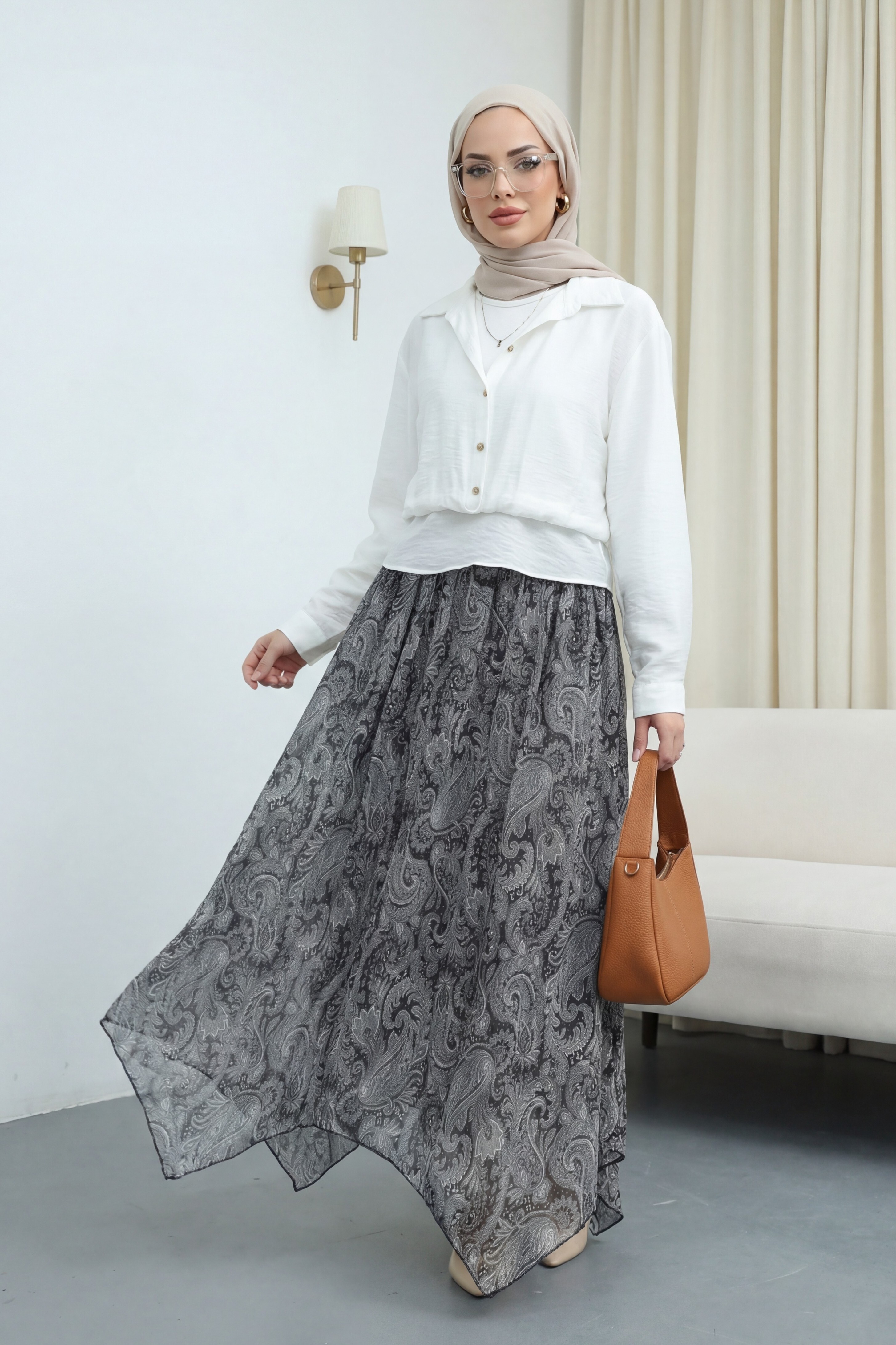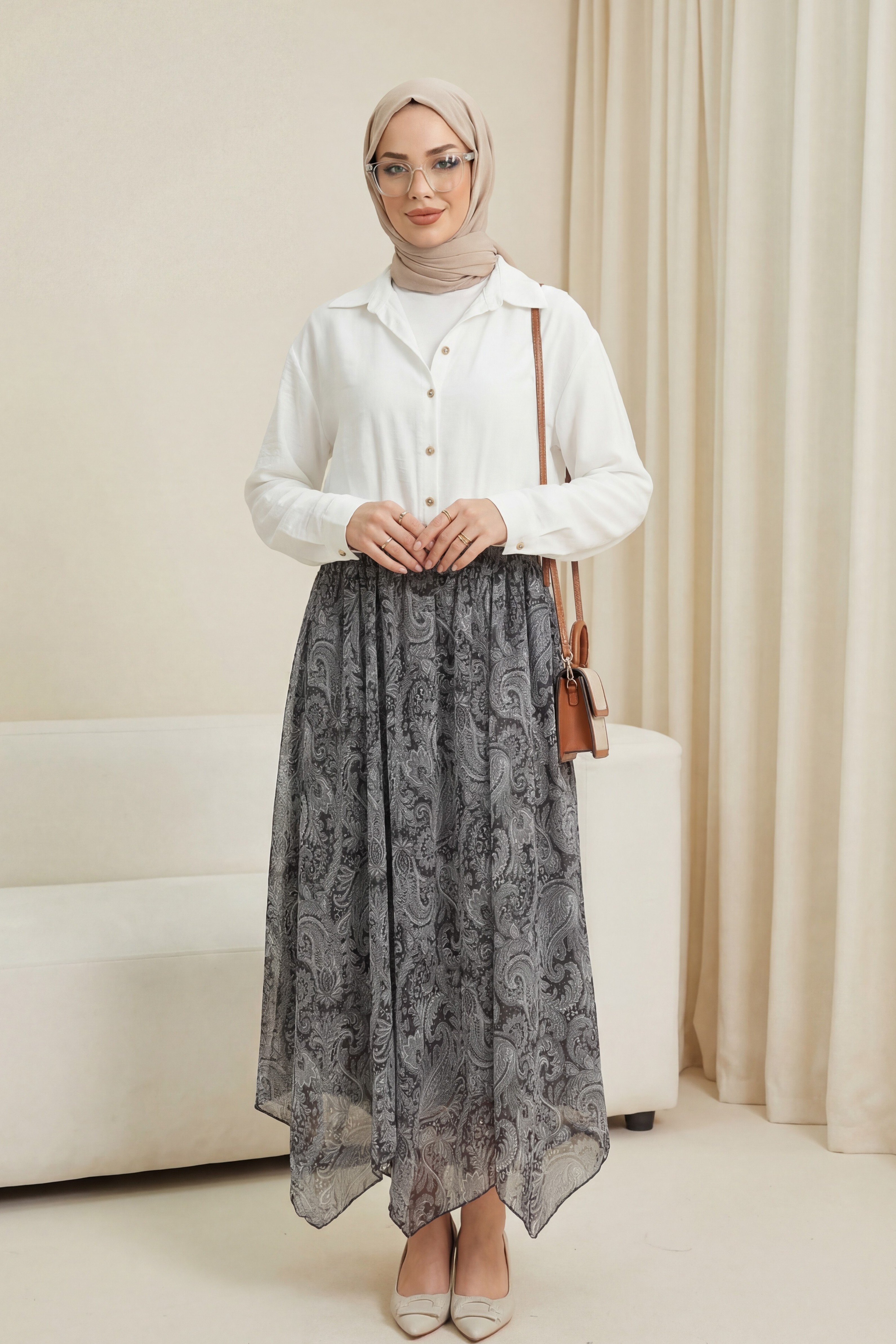 Kombindeki şal, çanta, ayakkabı ve takılar aksesuar olarak kullanılmıştır.