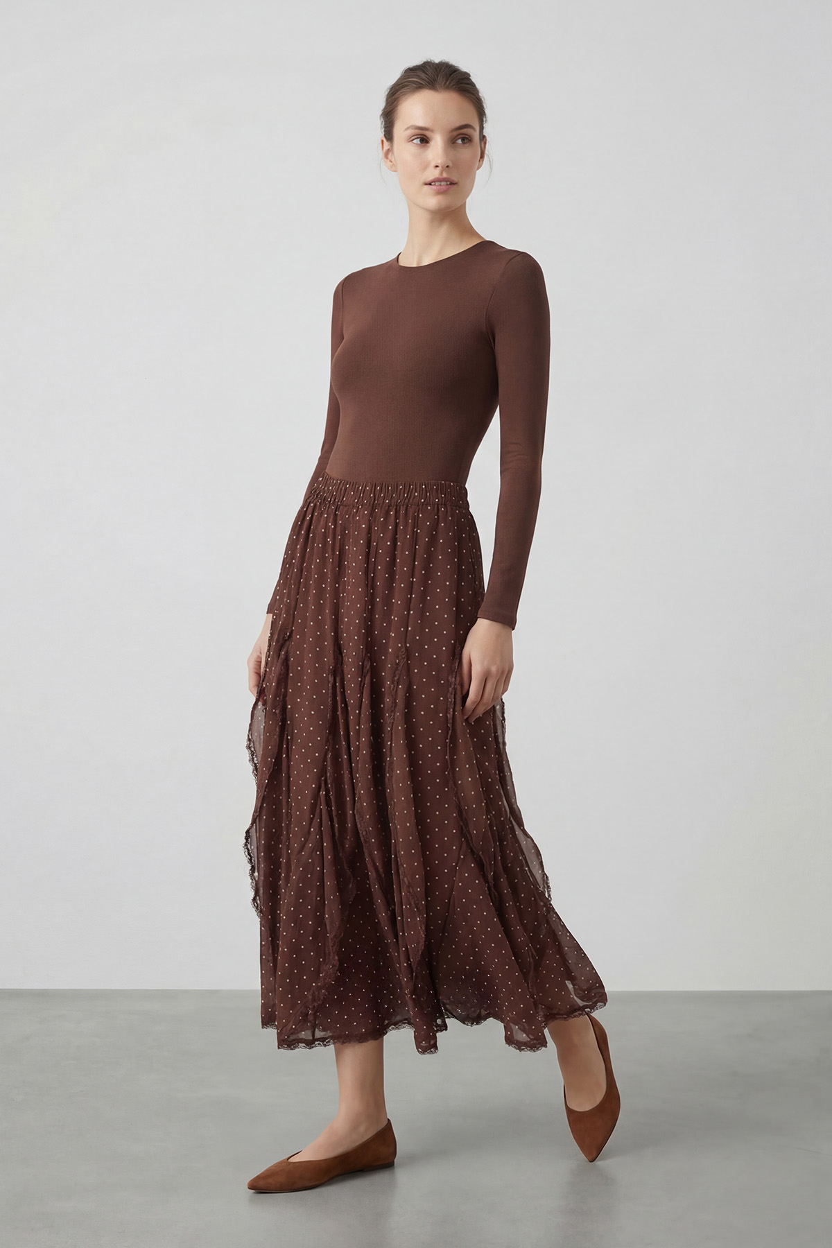 Akışkan yapısı ve hareketli kesimiyle zarif bir görünüm sunar. Puantiye deseni tasarıma klasik bir dokunuş katarken, etek boyunca uzanan dantel detayları şıklığı ön plana çıkarır. Lastikli bel yapısı sayesinde konforlu bir kullanım sağlar ve farklı bedenlere uyum sunar. Günlük kombinlerden özel gün stiline kadar geniş kullanım alanı oluşturur. Hafif dokusu ile gün boyu rahatlık sunar, modern ve feminen bir duruş kazandırır