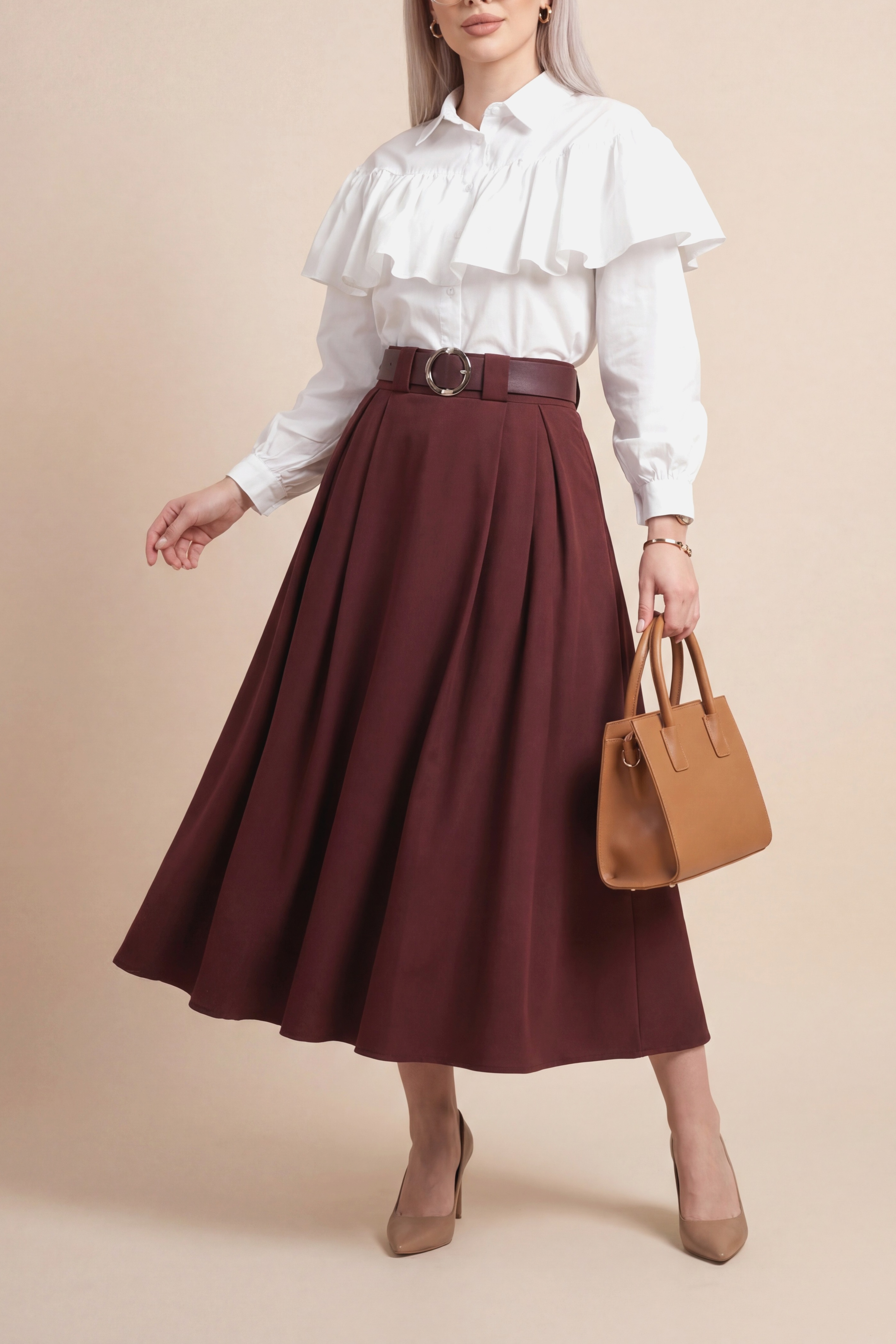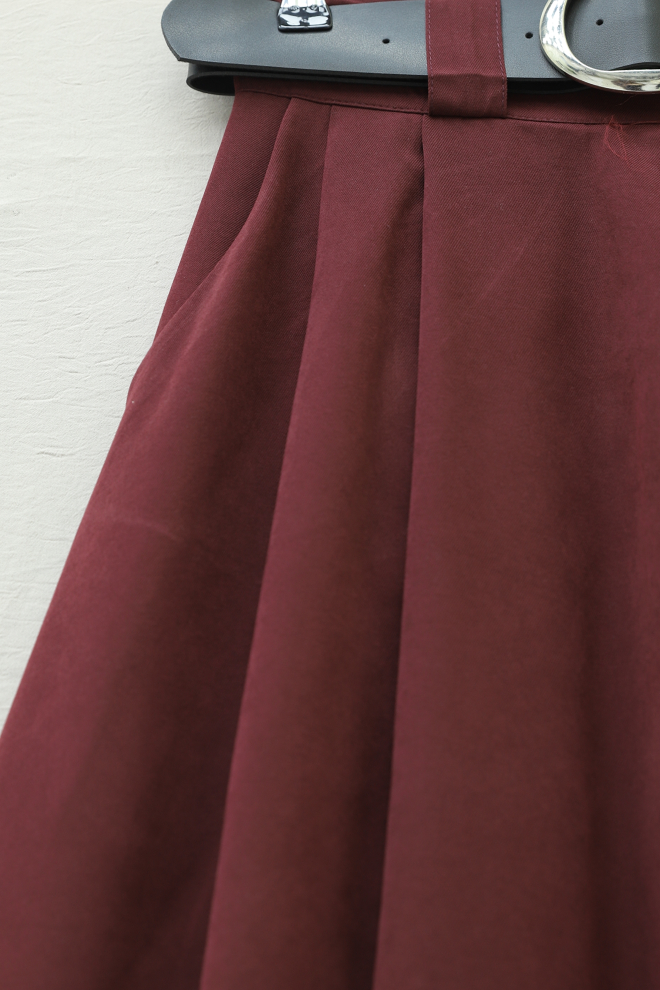 Kalın Kemerli Önü Pileli Yan Cepli Fermuarlı Tivil Etek, modern ve güçlü bir stil sunar. Ön pile detayı hareketli bir görünüm kazandırırken, kalın kemer formu beli vurgular. Yan cepleri pratik kullanım sağlar, fermuar detayı şık bir tamamlayıcıdır. Tivil kumaşı tok ve rahattır. Vücuda oturan fakat sıkmayan ideal kalıbı ile dengeli bir duruş sunar.