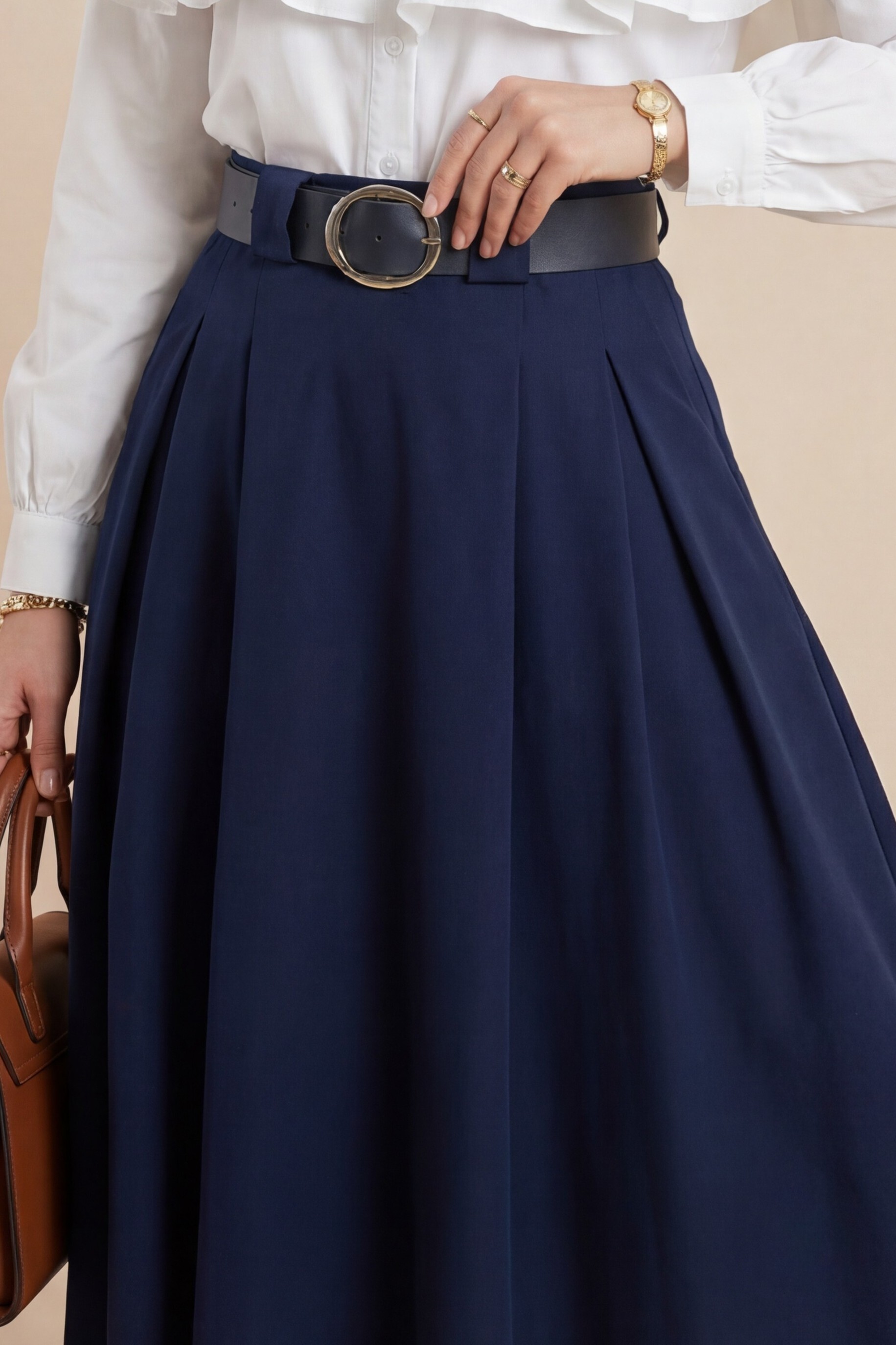 Kalın Kemerli Önü Pileli Yan Cepli Fermuarlı Tivil Etek, modern ve güçlü bir stil sunar. Ön pile detayı hareketli bir görünüm kazandırırken, kalın kemer formu beli vurgular. Yan cepleri pratik kullanım sağlar, fermuar detayı şık bir tamamlayıcıdır. Tivil kumaşı tok ve rahattır. Vücuda oturan fakat sıkmayan ideal kalıbı ile dengeli bir duruş sunar.