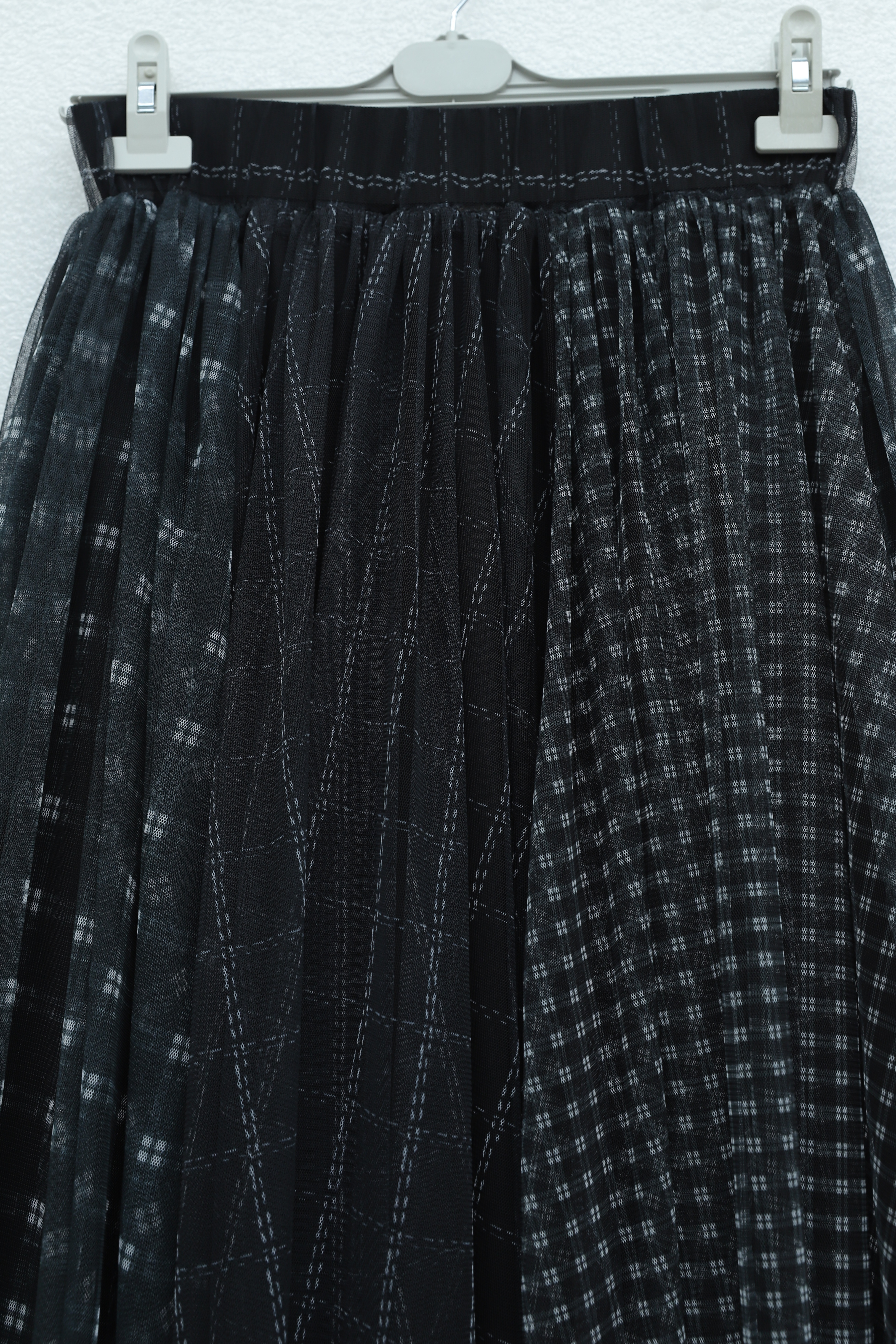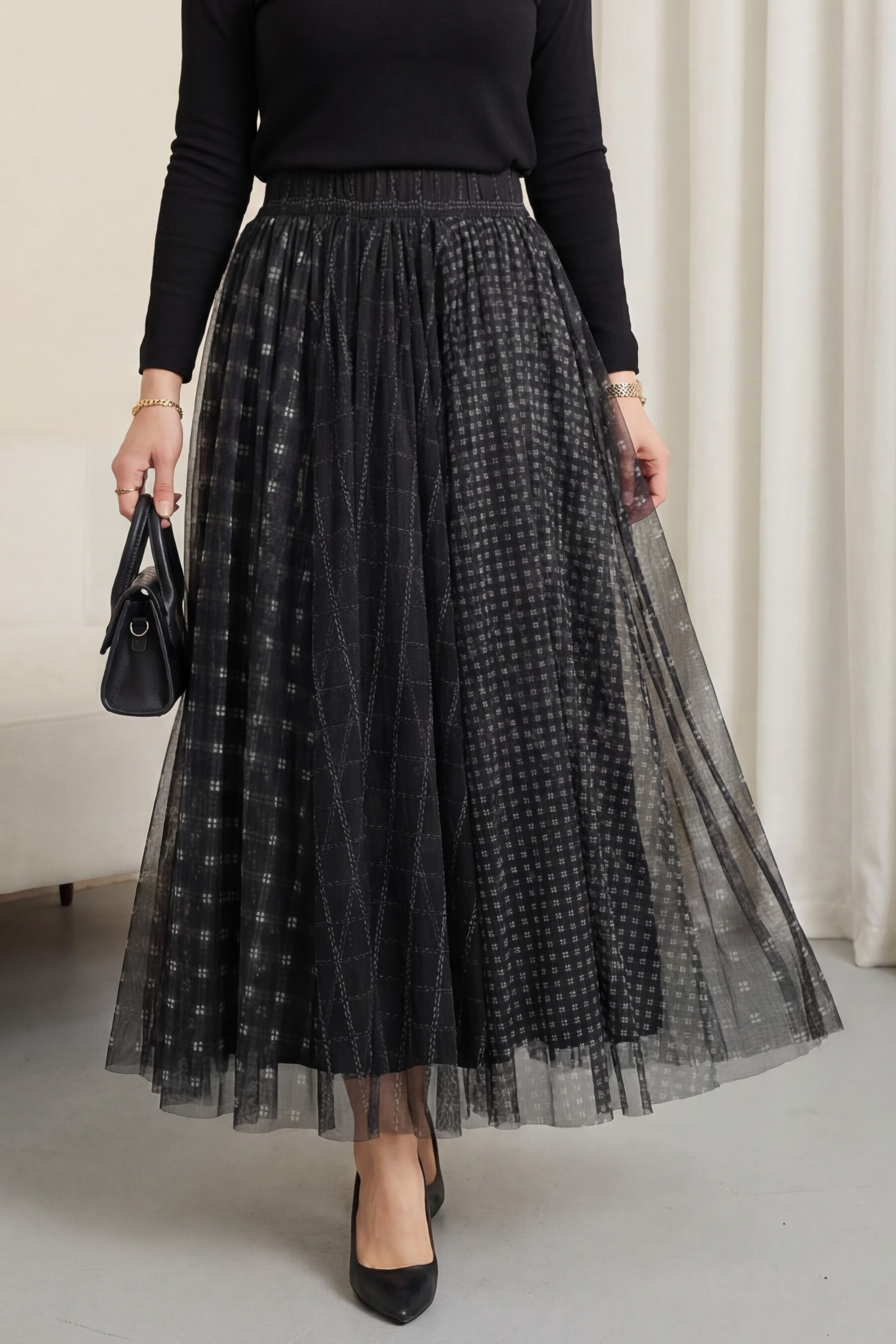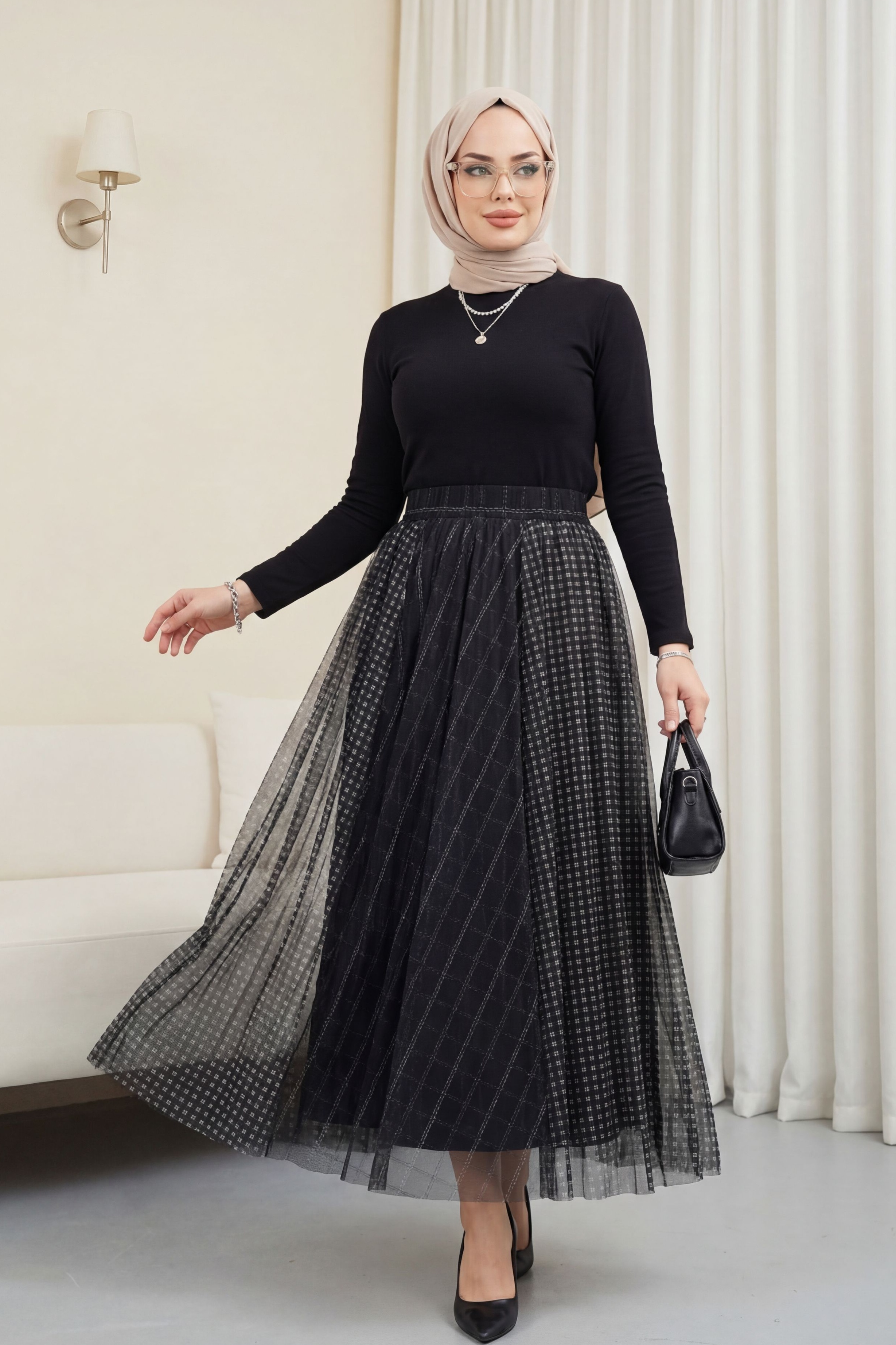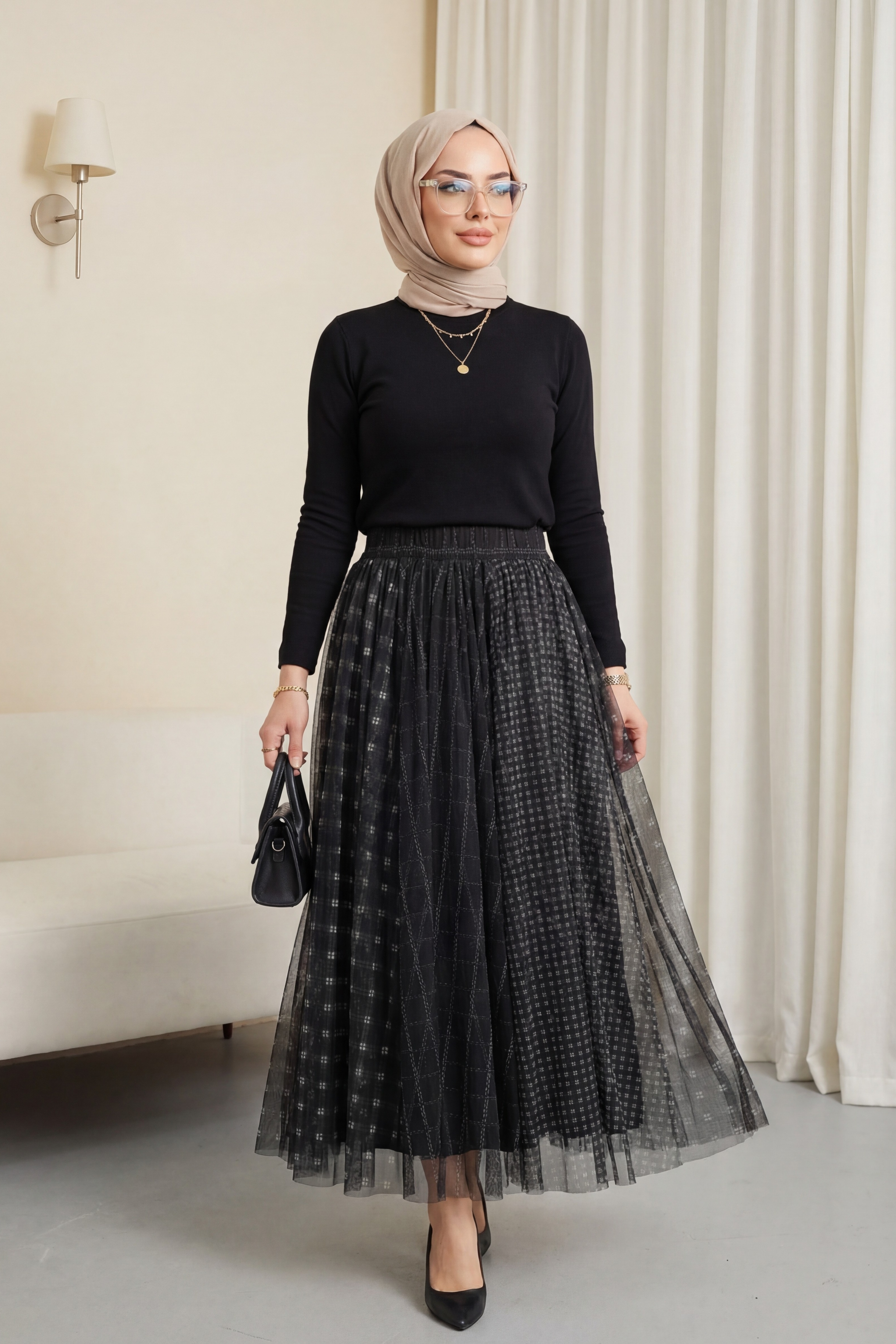 Kare Desen Beli Lastikli Astarlı Tül Etek -Siyah
