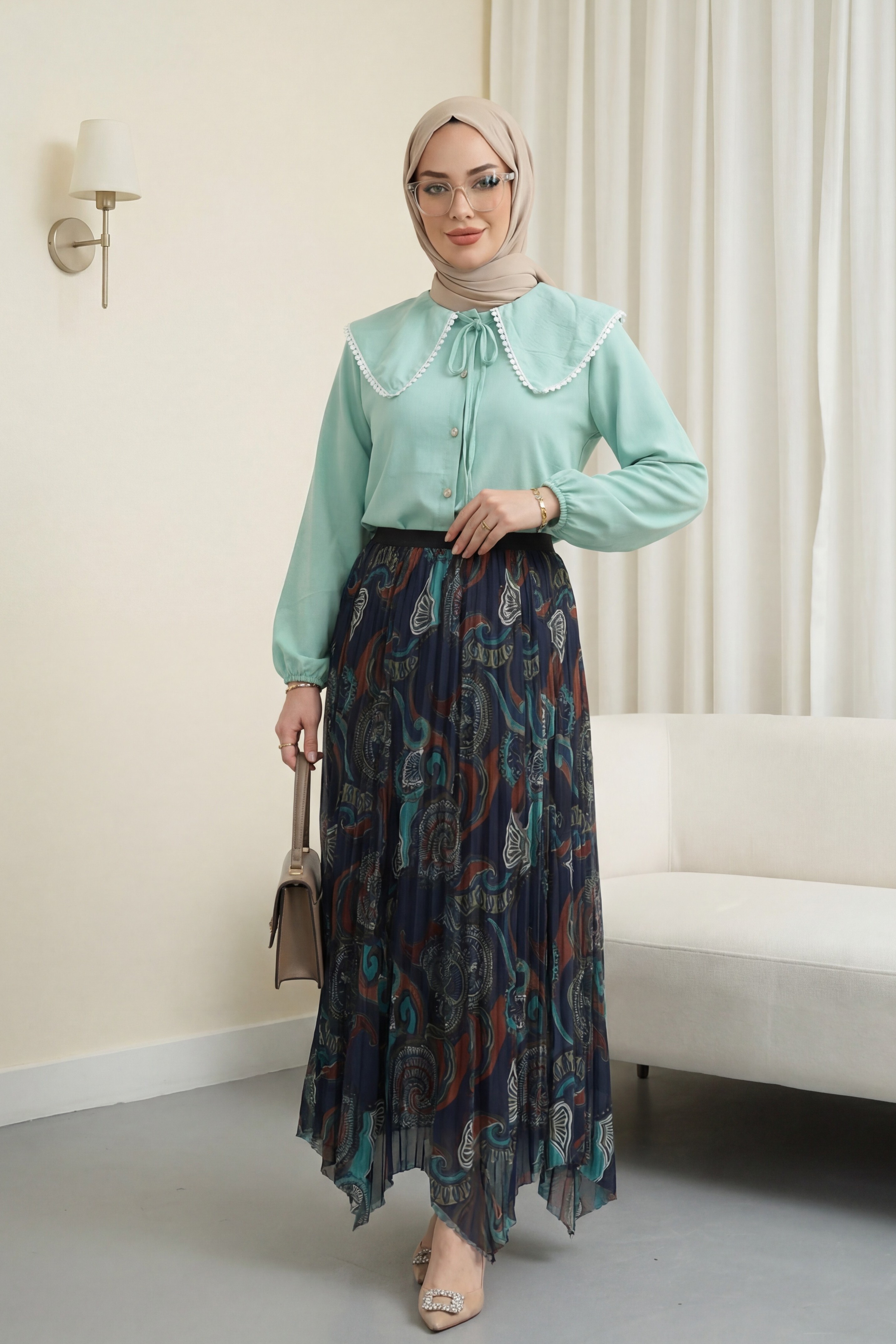 Kombindeki şal, çanta, ayakkabı ve takılar aksesuar olarak kullanılmıştır.
