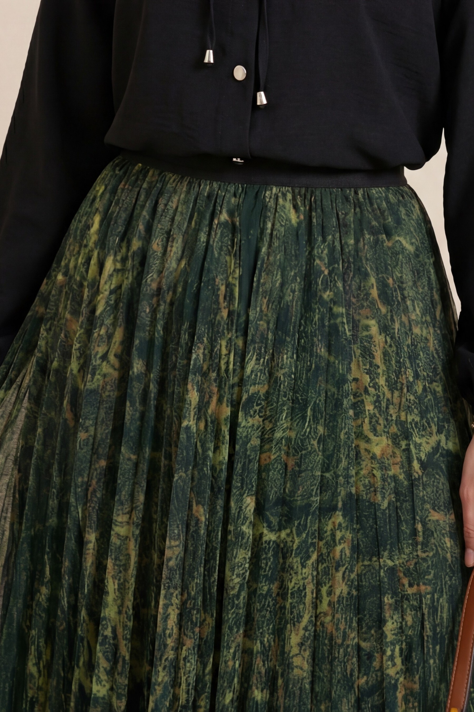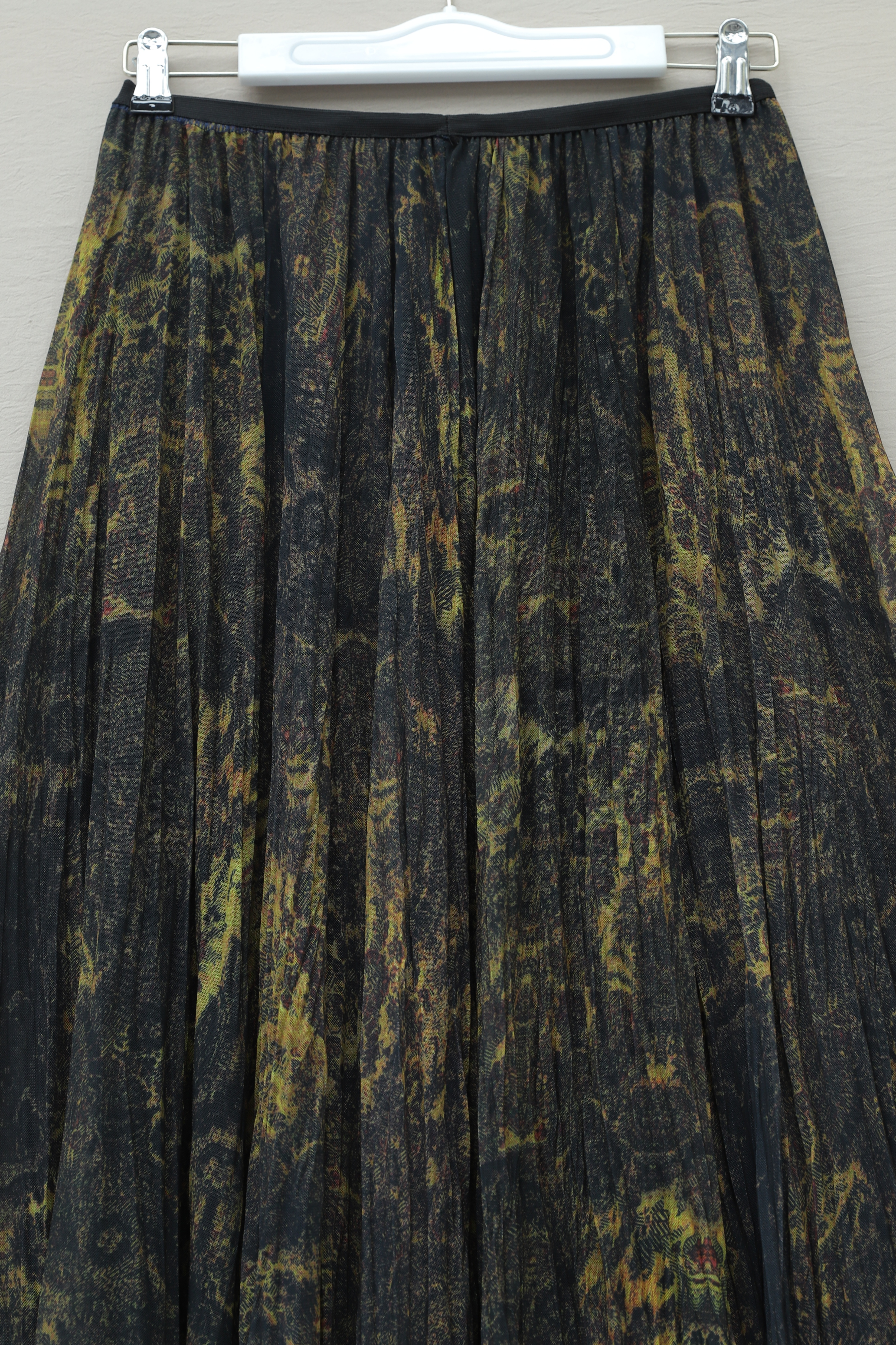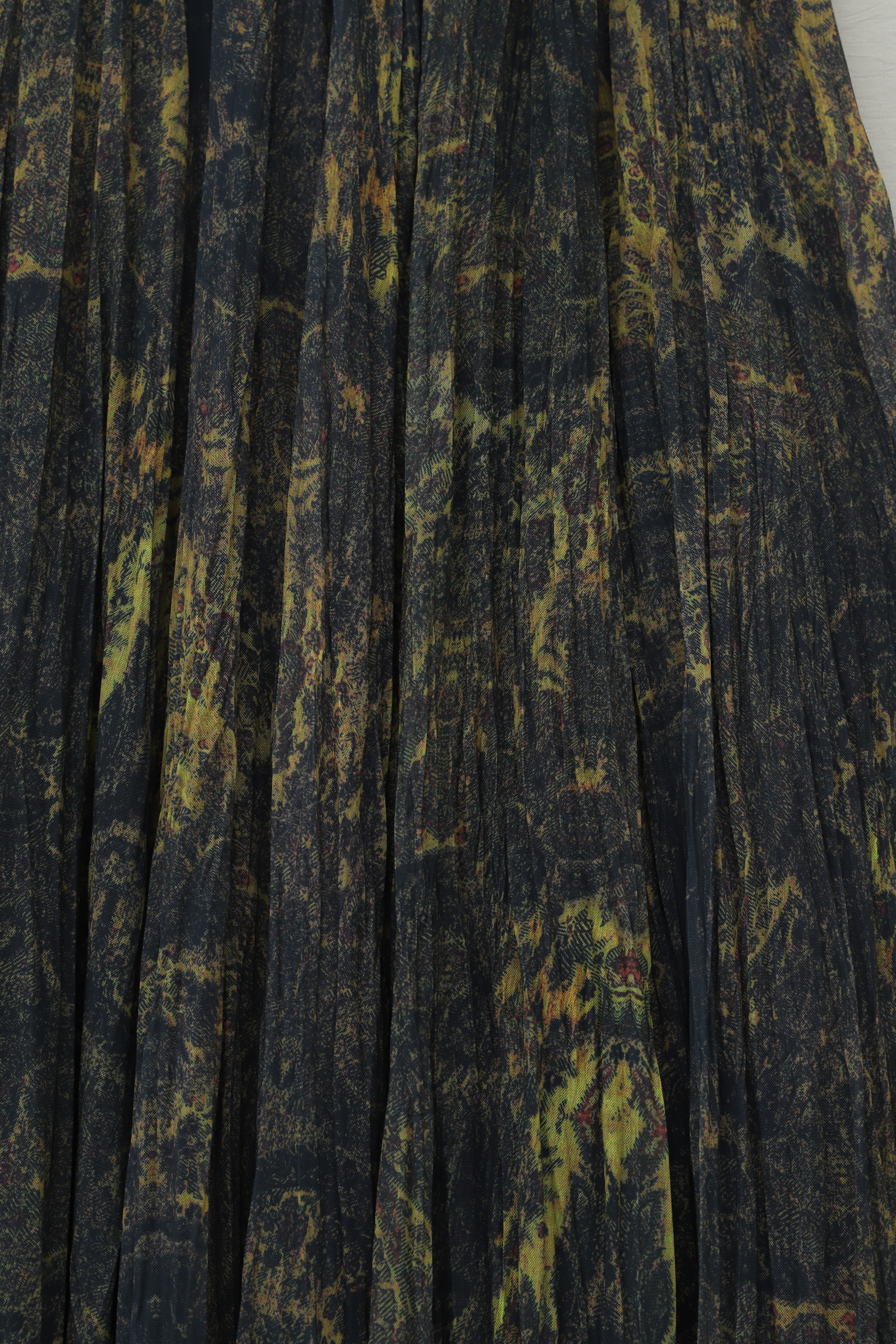 Karışık Desen Beli Lastikli Asimetrik Kesim Astarlı Tül Etek -Yağ Yeşili