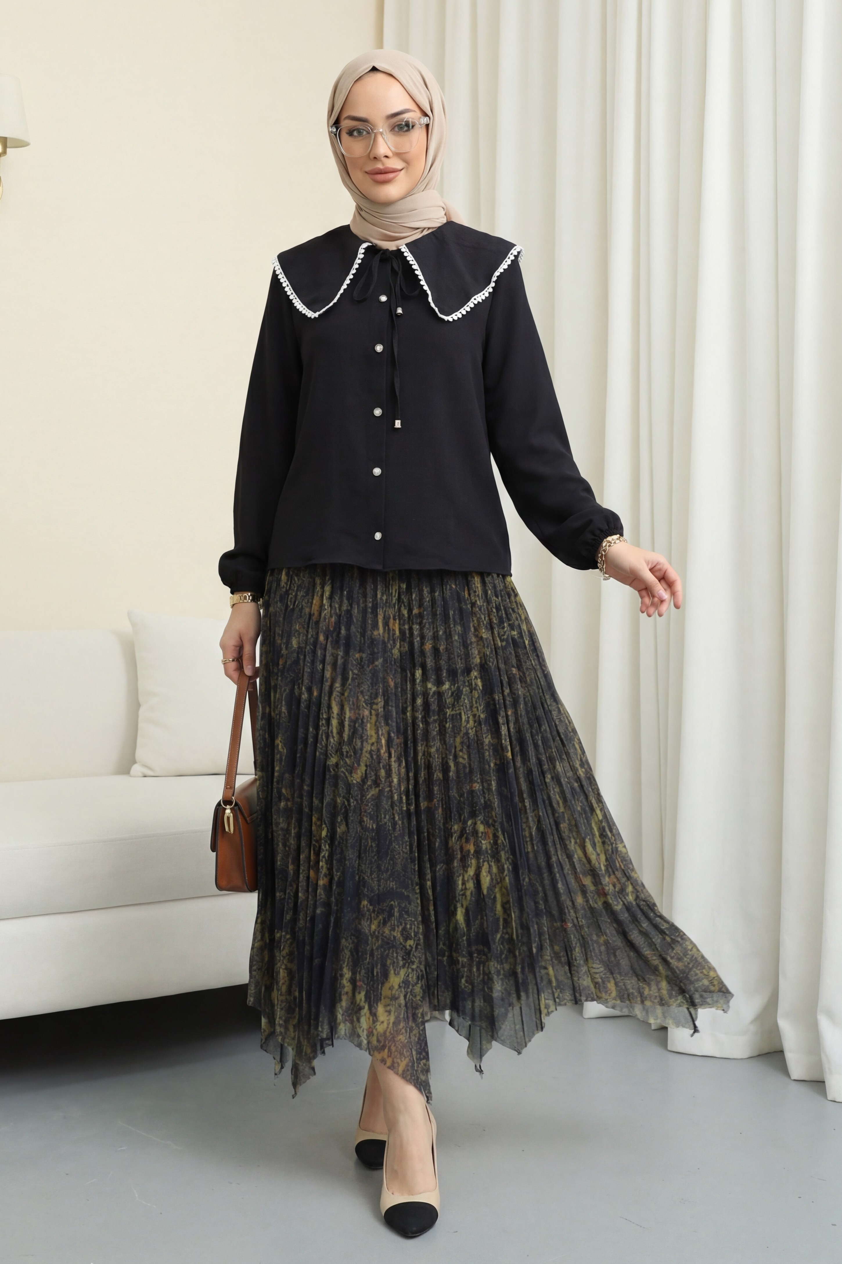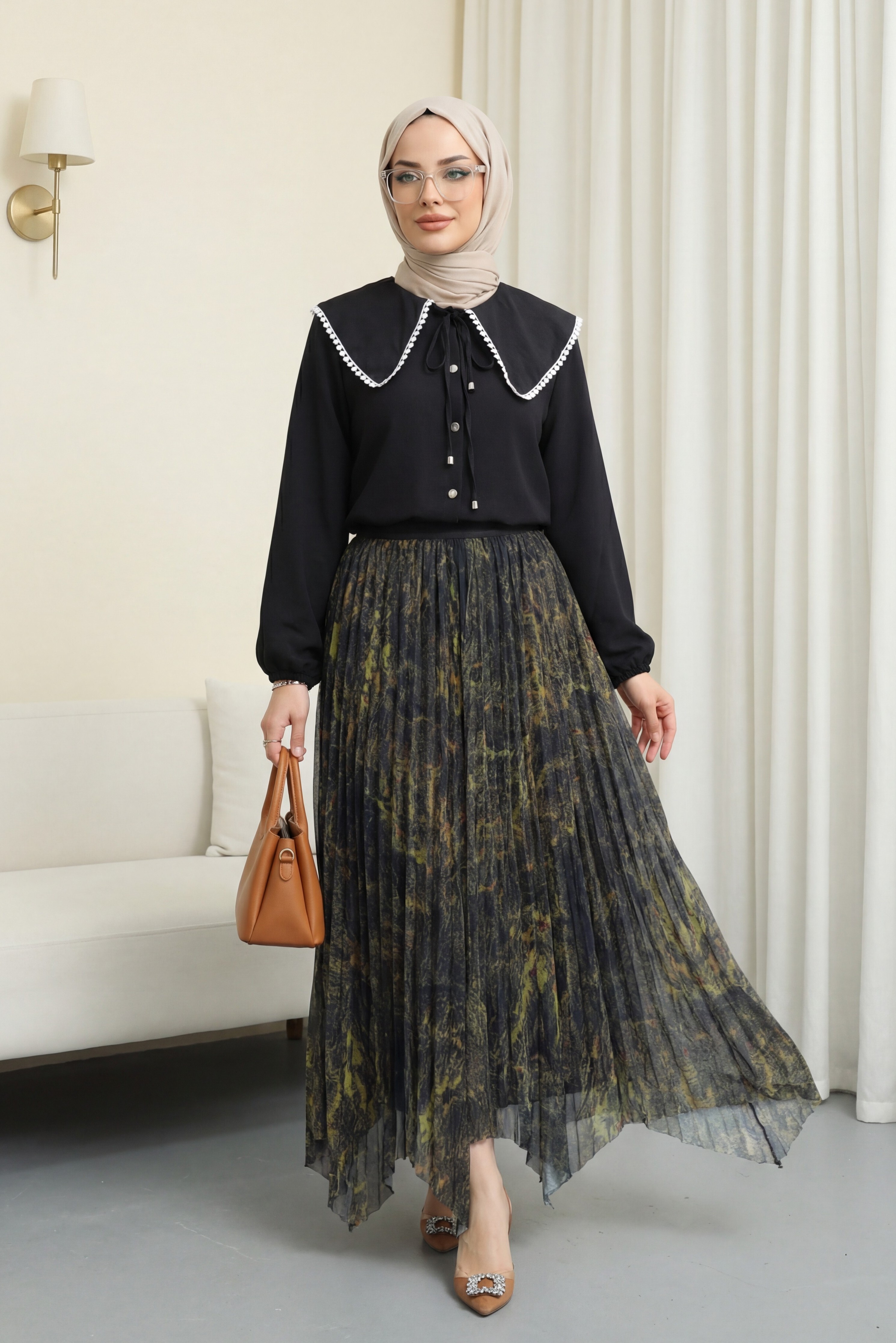 Kombindeki şal, çanta, ayakkabı ve takılar aksesuar olarak kullanılmıştır.