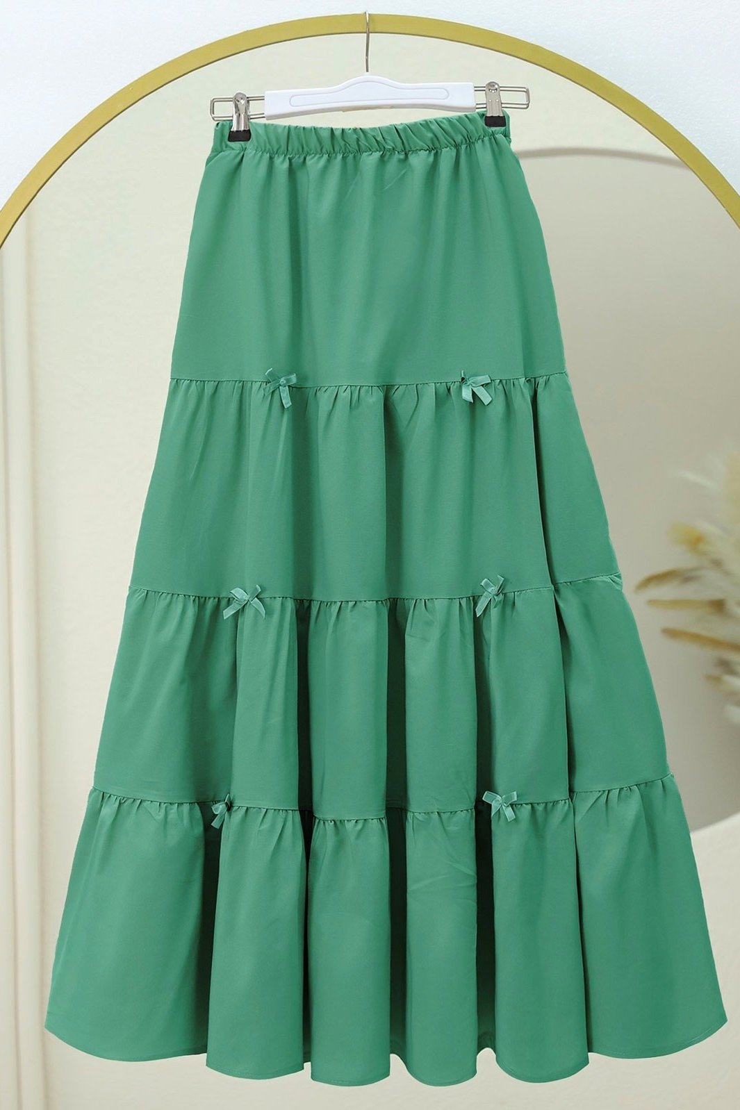 Kurdele Detaylı Parçalı Beli Lastikli Etek, rahat lastikli bel ve şık kurdele detayıyla zarif bir stil sunar. Parçalı tasarımı dinamik bir görünüm yaratırken, günlük ve ofis kombinleriniz için mükemmel bir seçenek.Giydiğiniz bedeni ölçü tablosuna bakarak belirleyebilir
