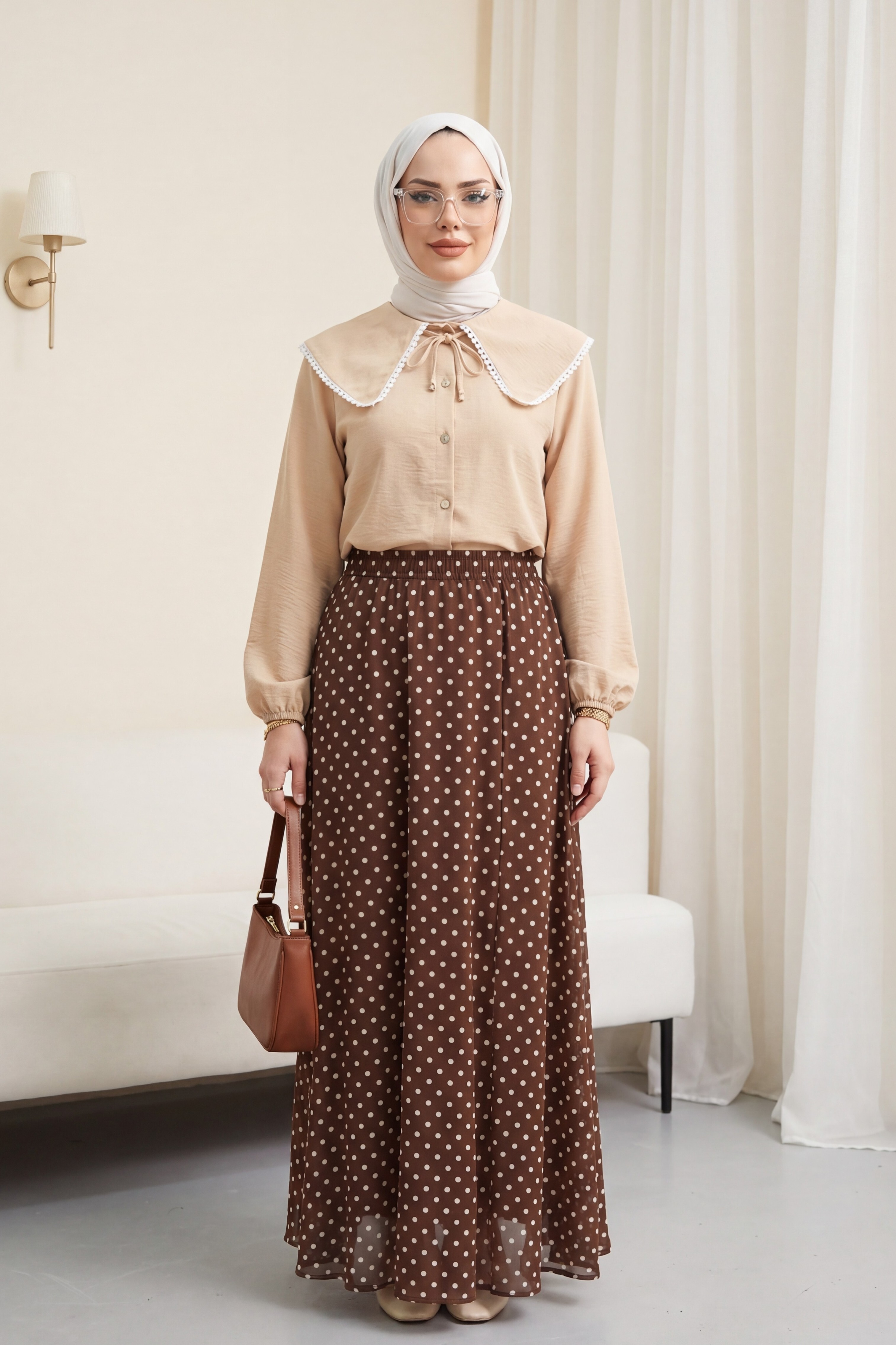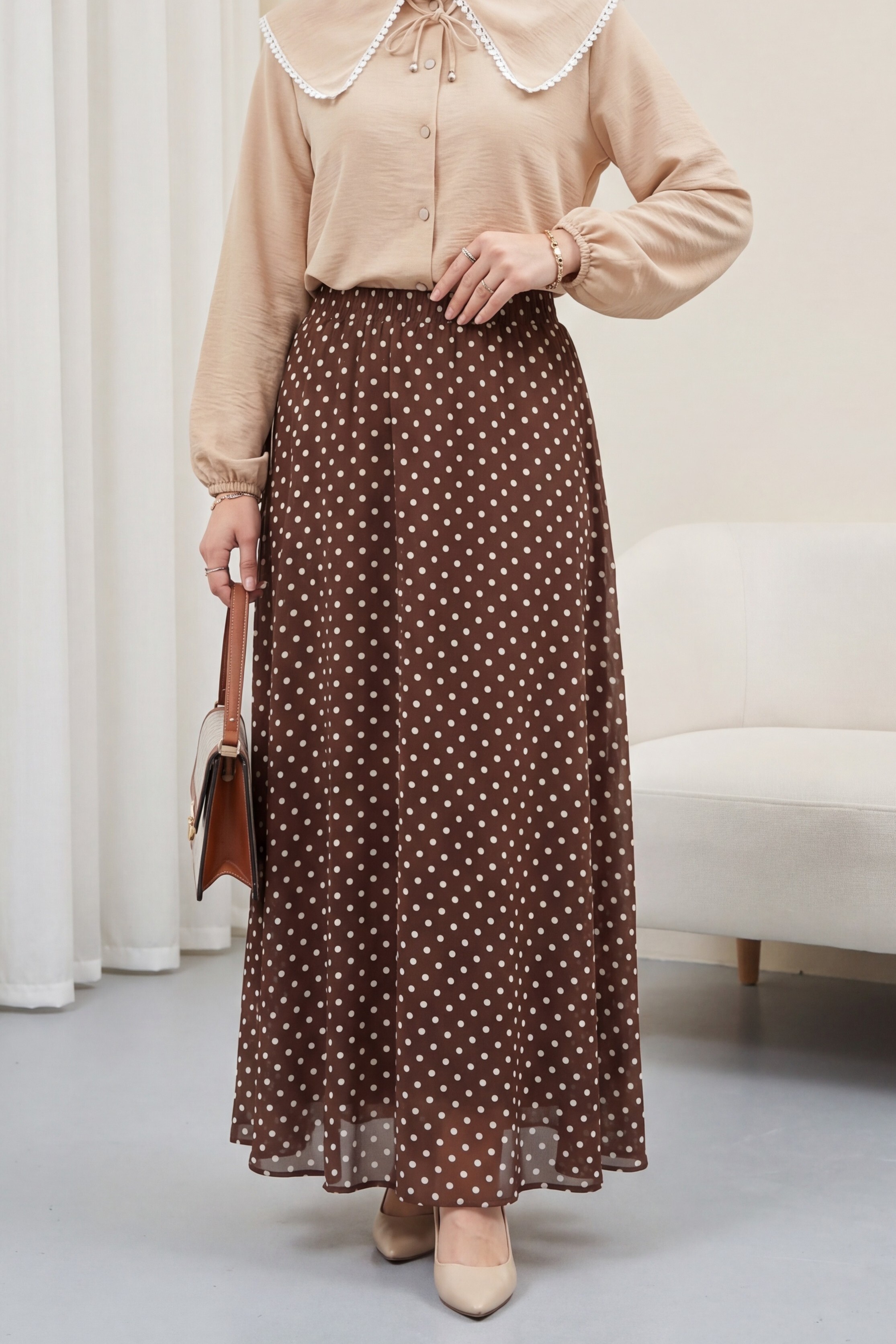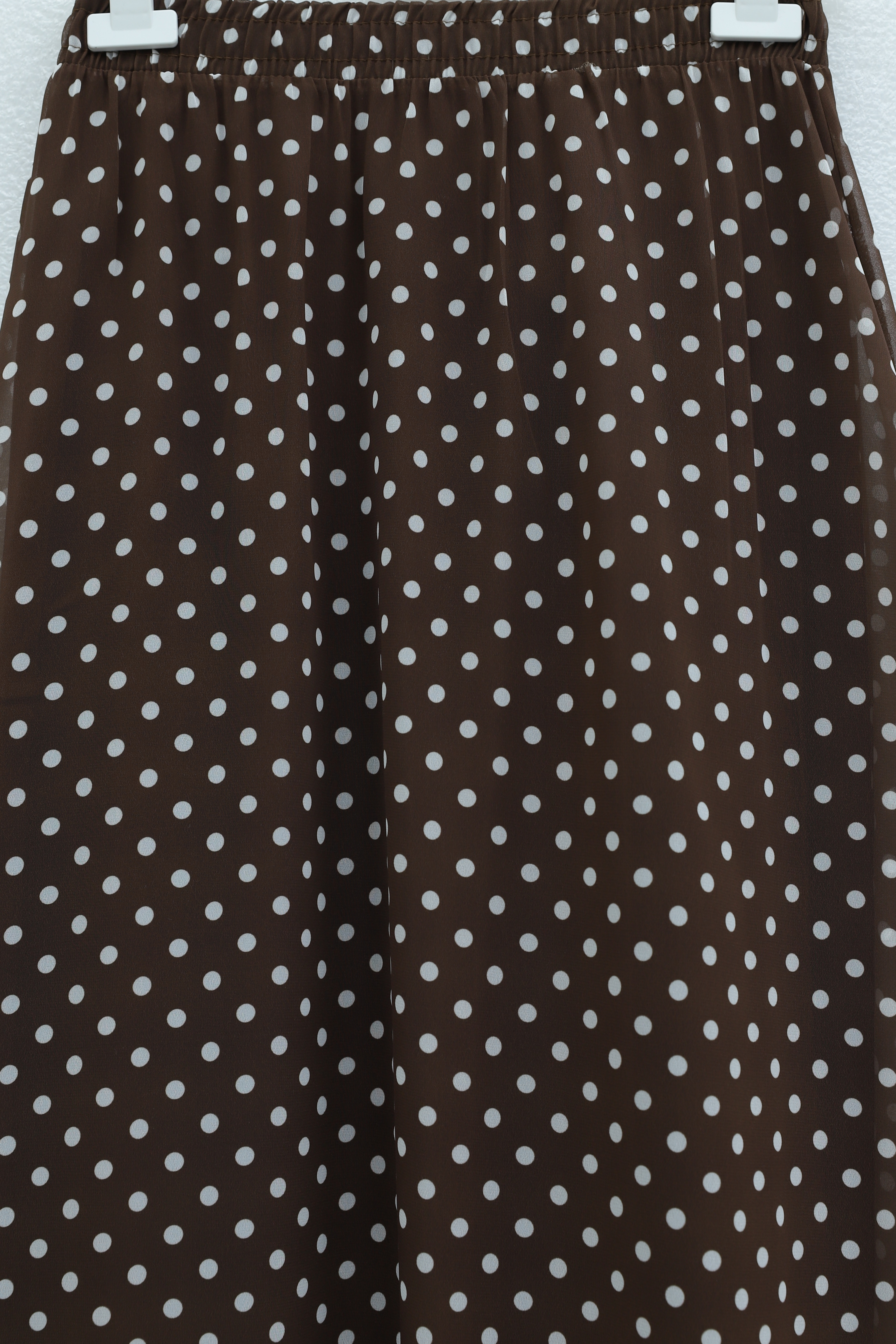 Puantiyeli Beli Lastikli Astarlı Şifon Etek -Kahve
