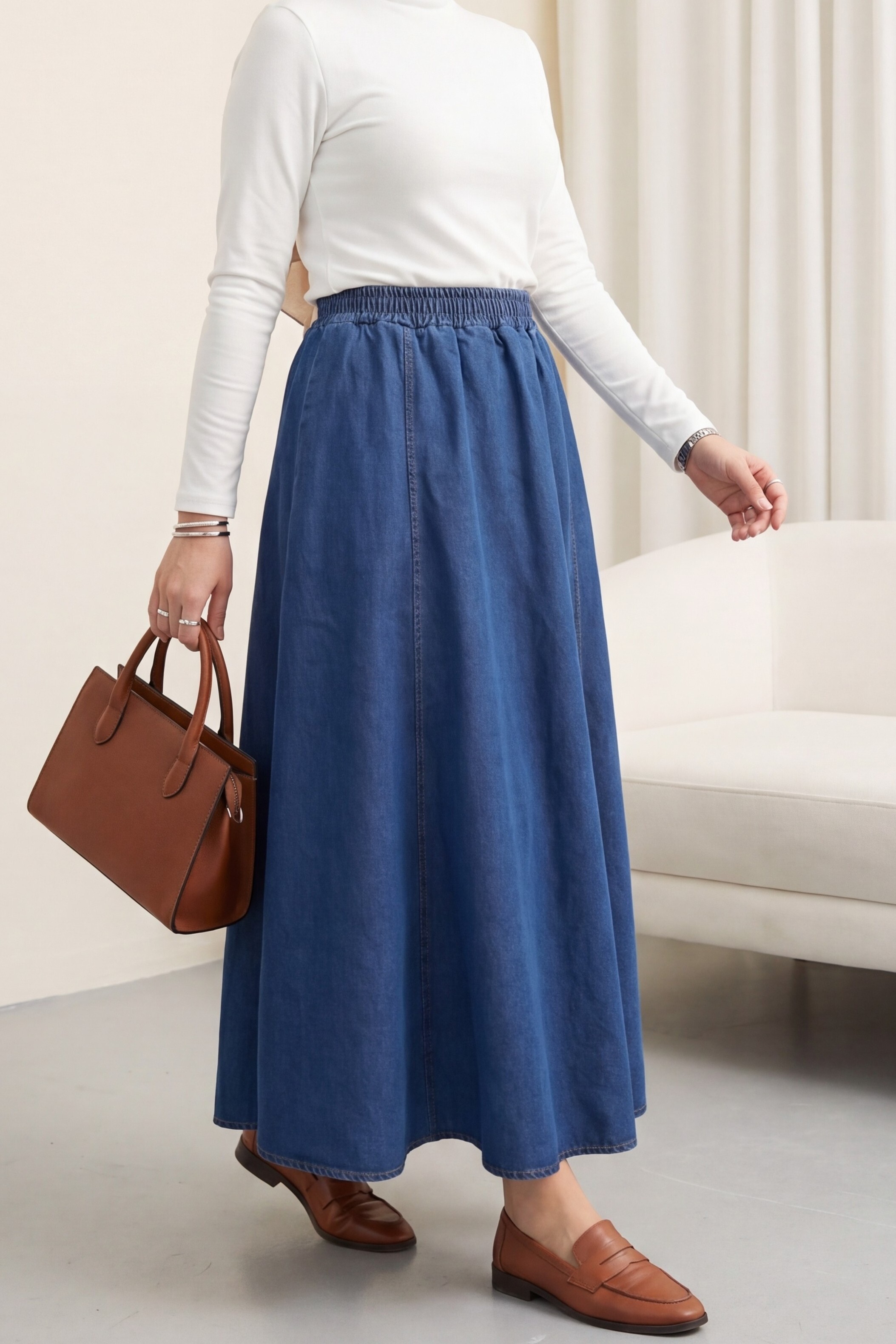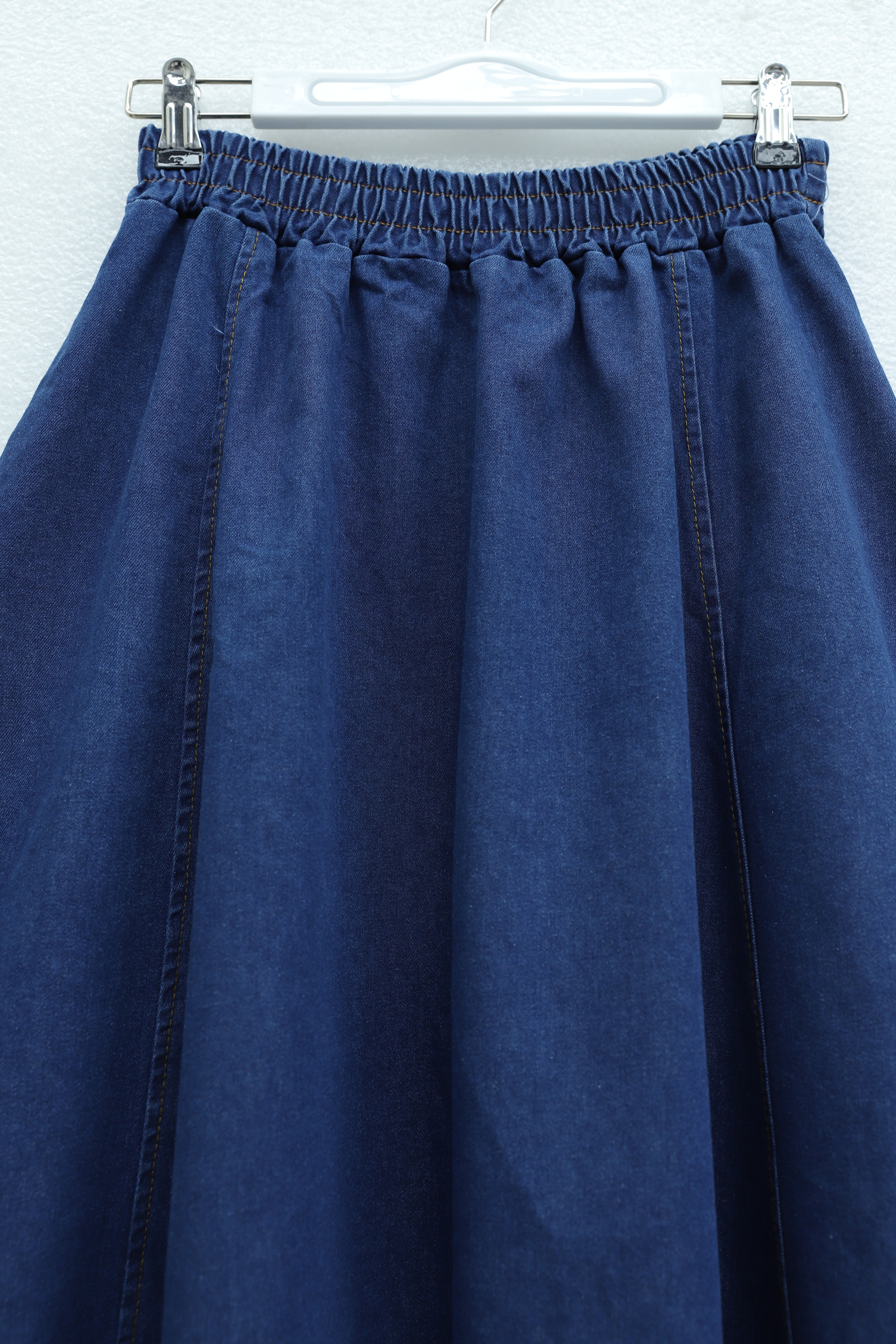 “Cepli kot etek”, “beli lastikli denim etek”, “günlük kadın etek”, “rahat kesim kot etek” gibi adlandırılabilir.