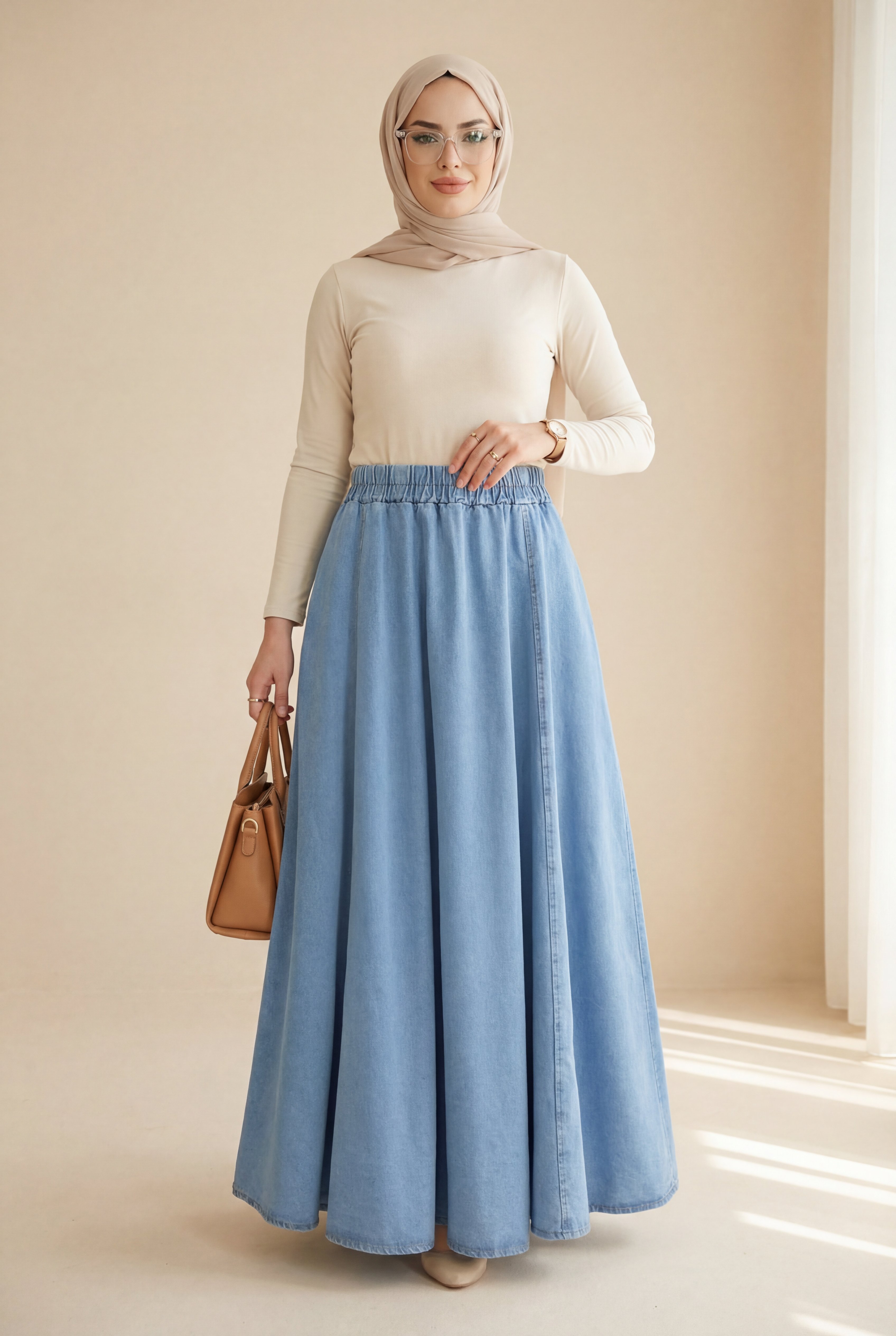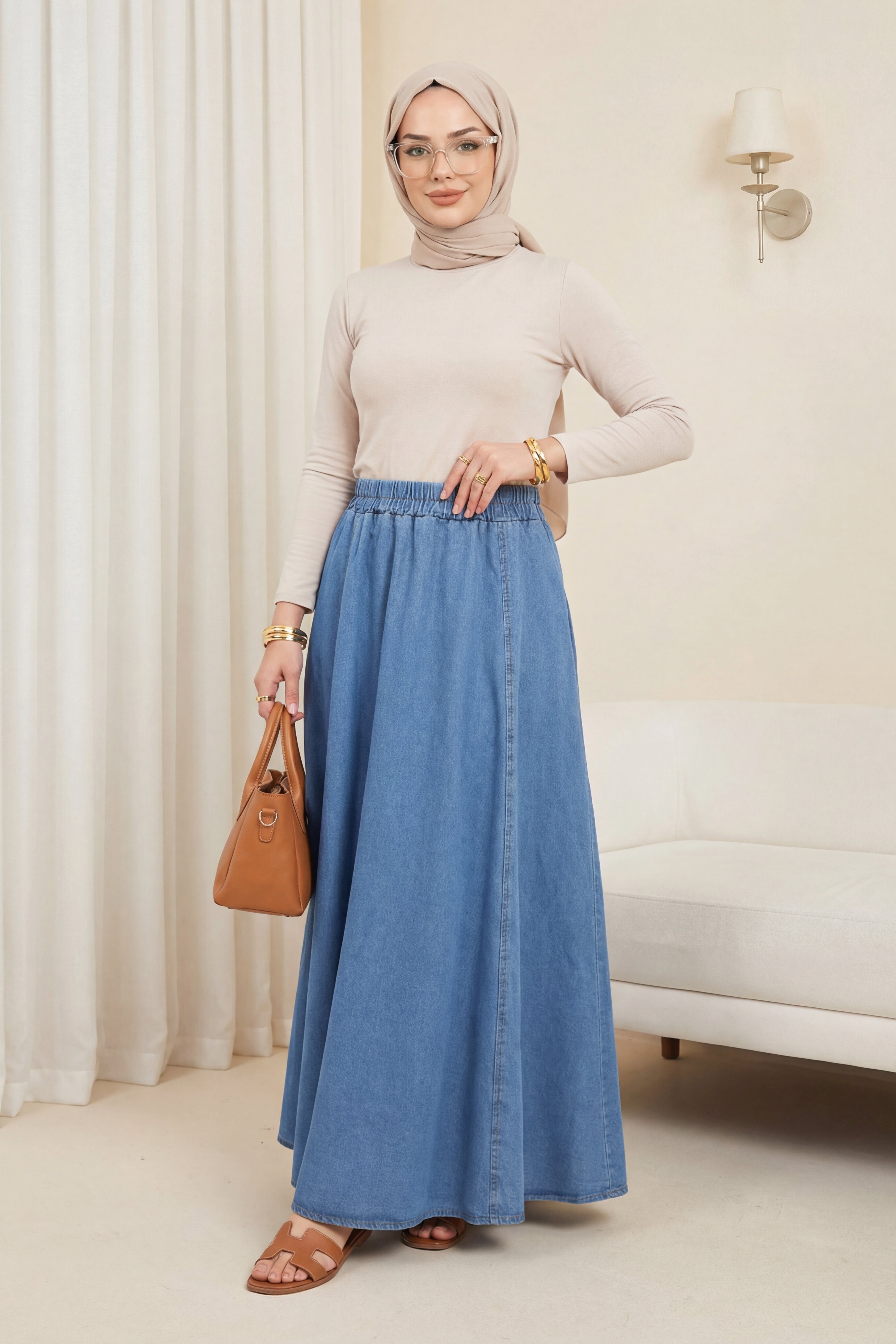 “Cepli kot etek”, “beli lastikli denim etek”, “günlük kadın etek”, “rahat kesim kot etek” gibi adlandırılabilir.