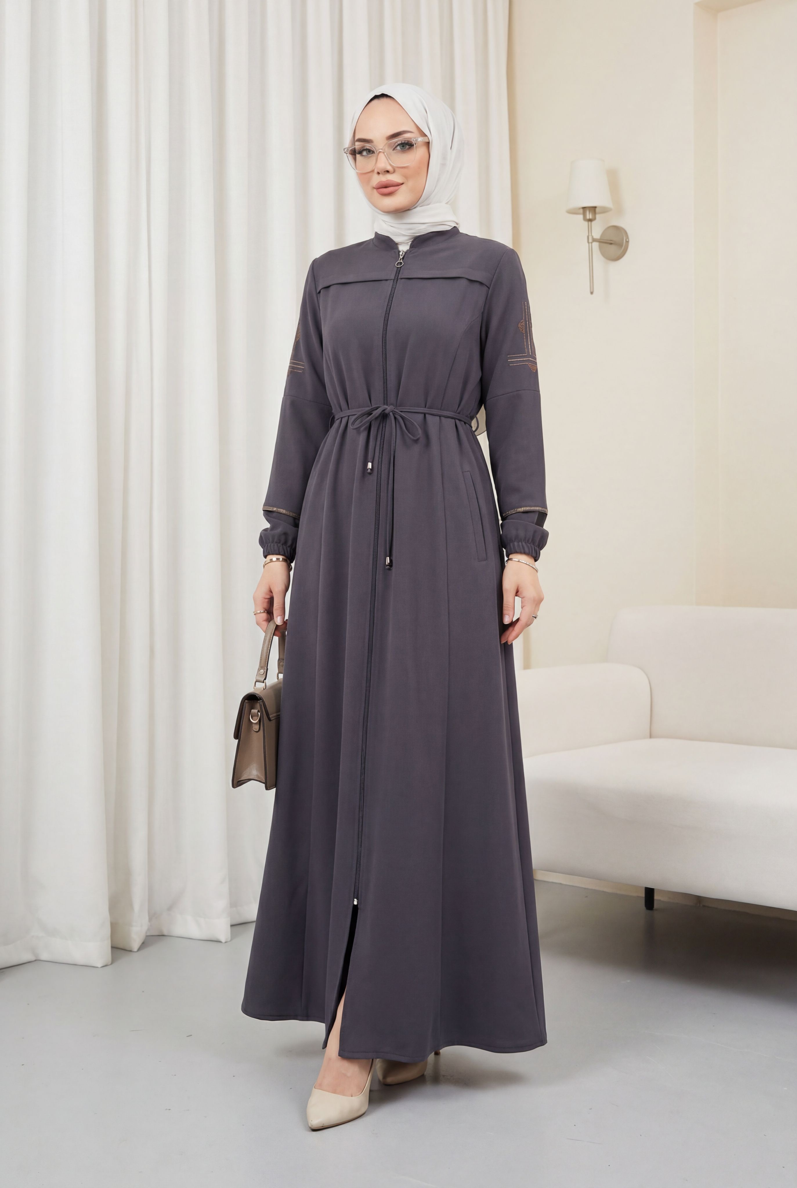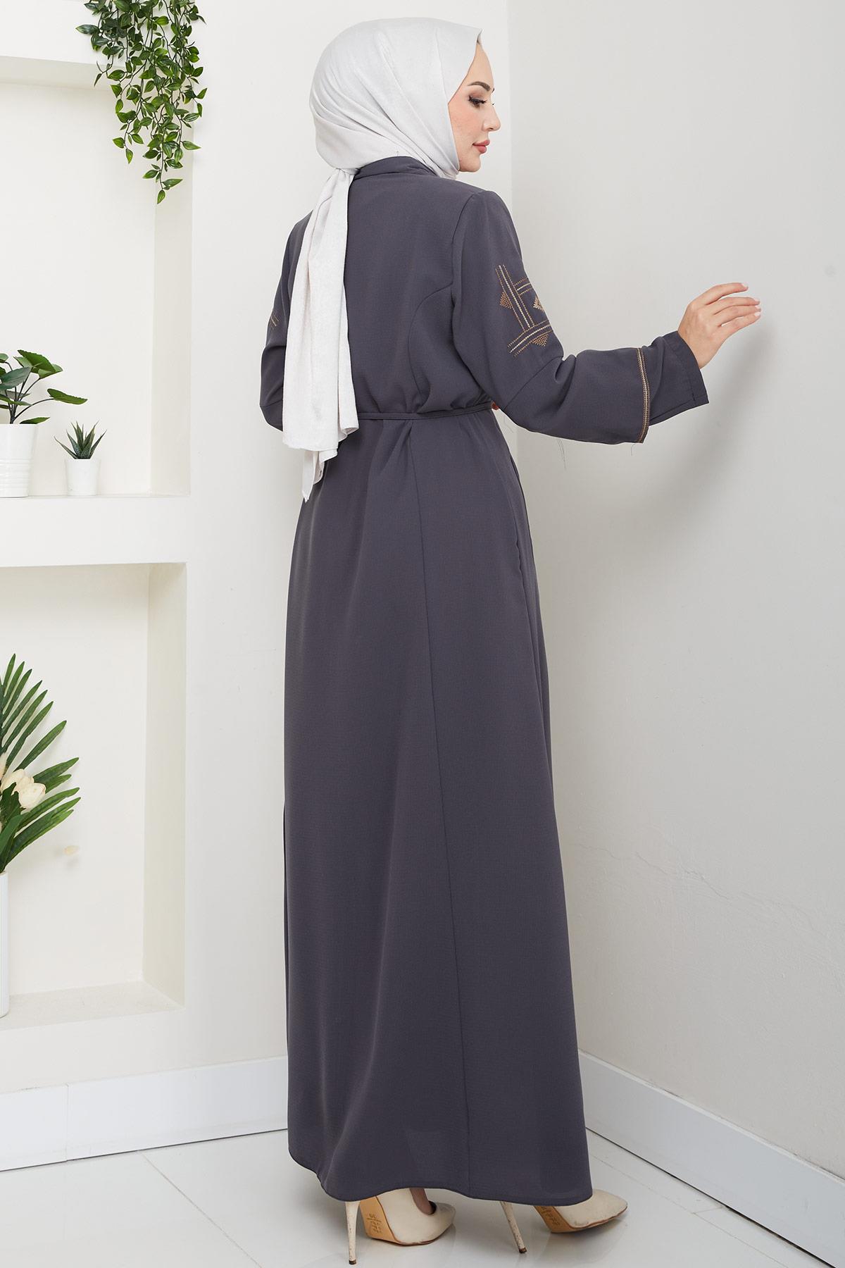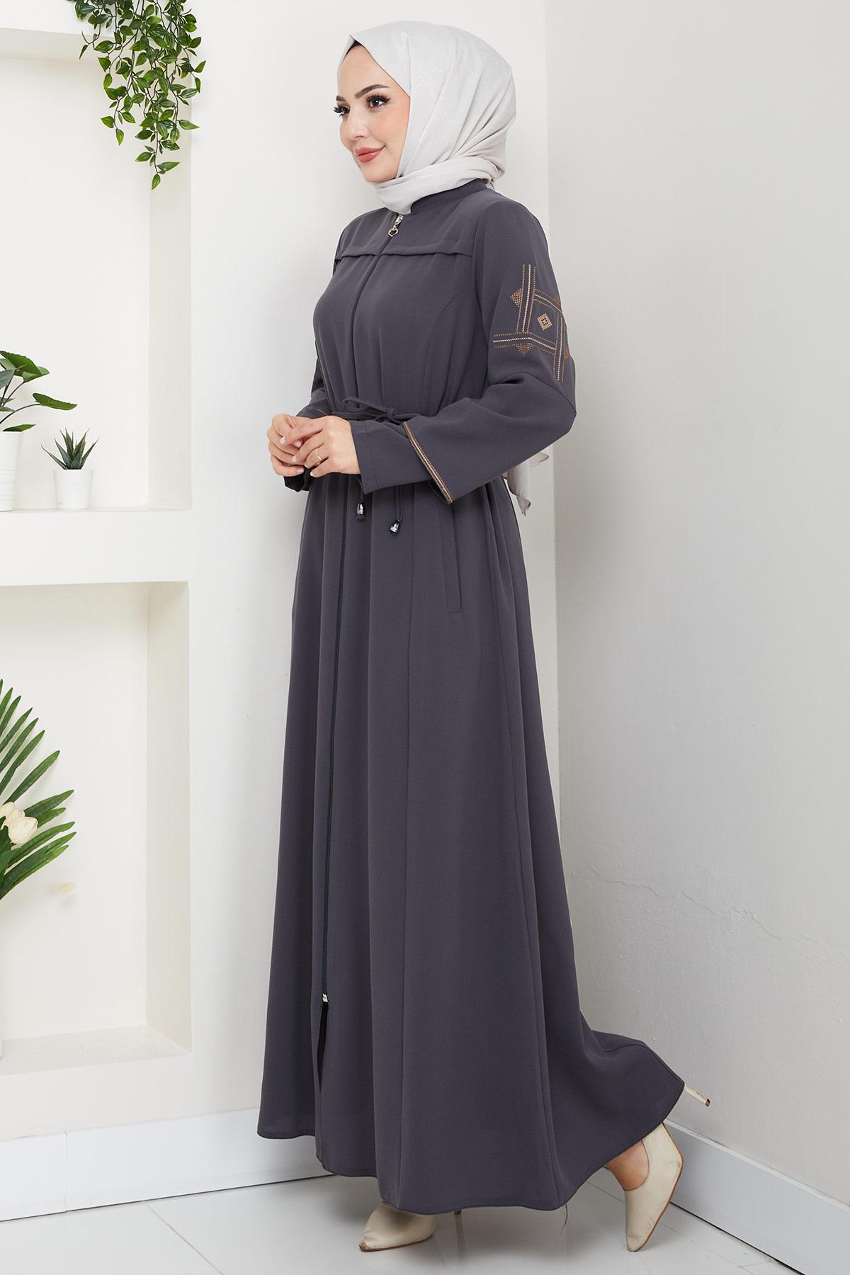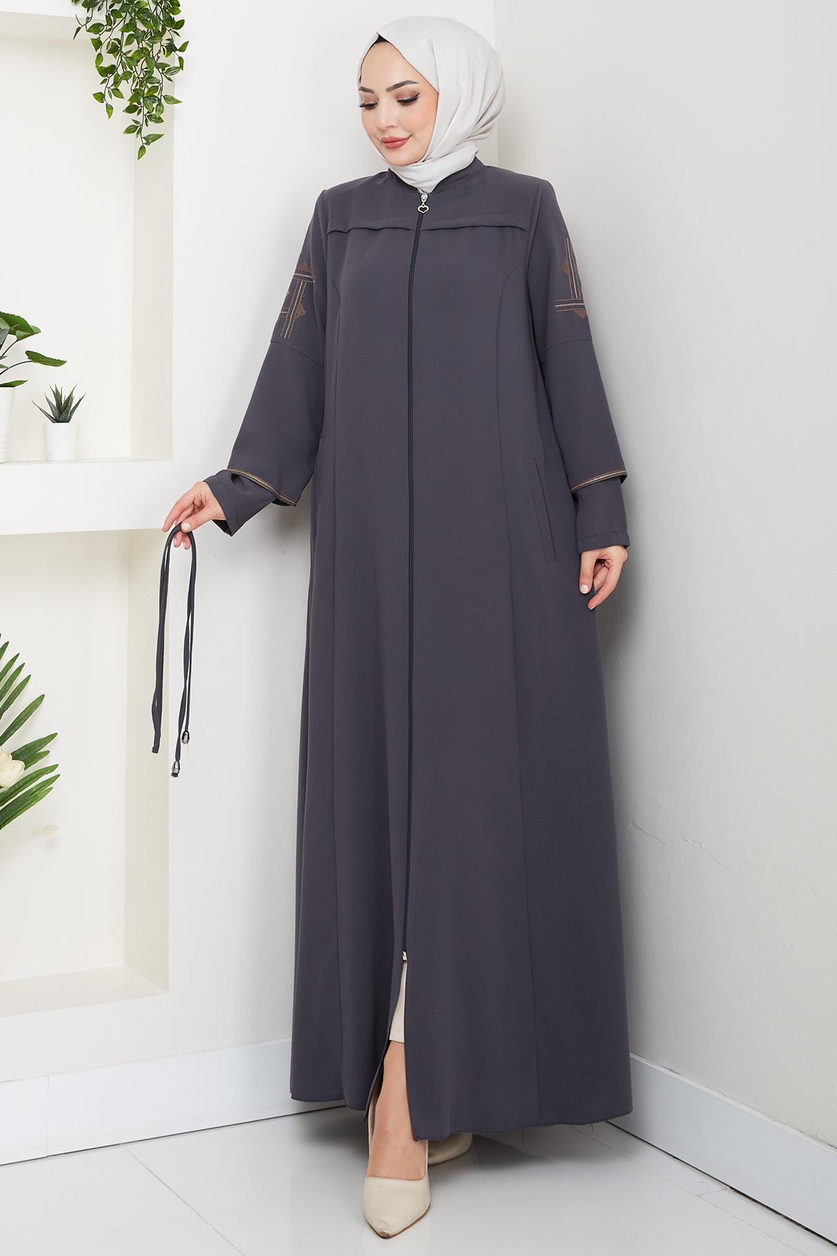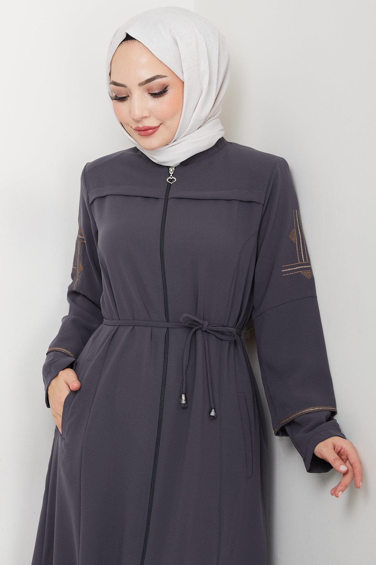 Ürün Özelliği : Hakim yaka, boydan fermuarlı, kolları nakış işleme detaylı bağcıklı Ferace modelidir. Omuzları vatkalı, yandan fleto cepli, astarsızdır. Ürün renginde konsept çekimlerinden dolayı ton farklılığı olabilir.