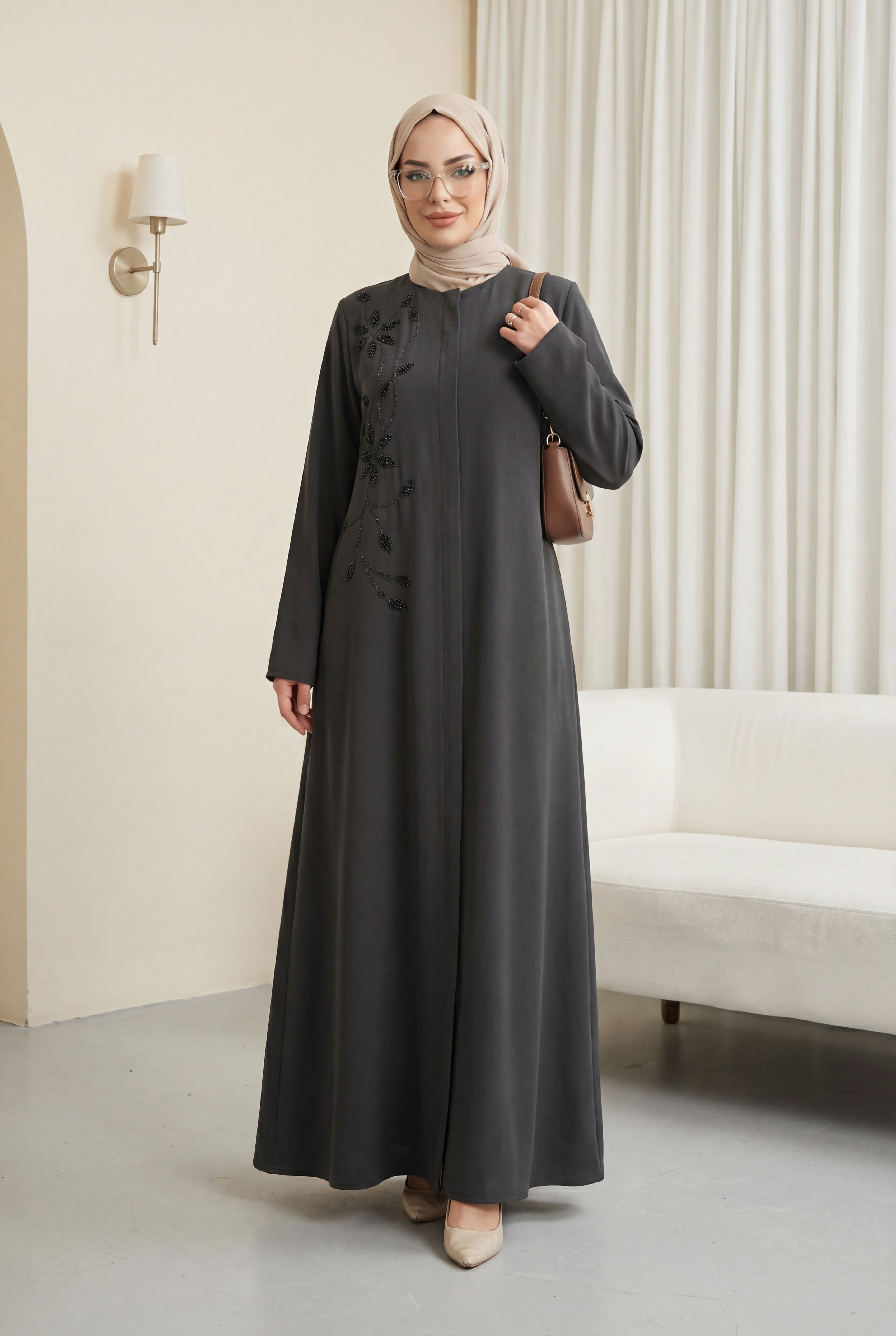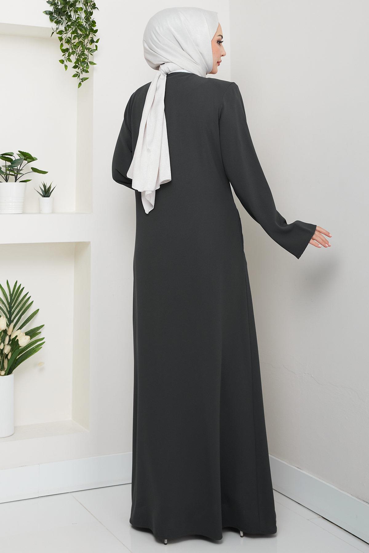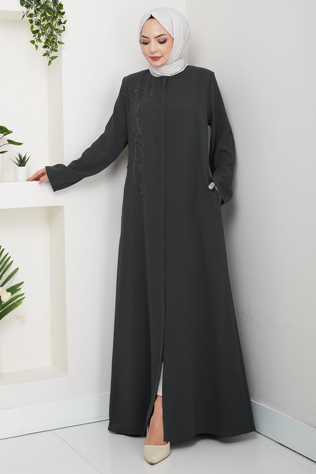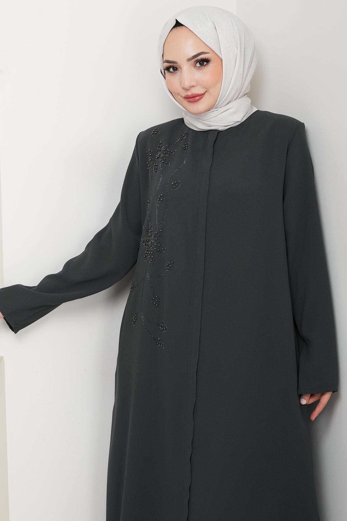 Ürün Özelliği : Bisiklet yaka, gizli boydan fermuarlı, önü boncuk ve taş detaylı Büyük Beden Ferace modelidir. Omuzları vatkalı, yandan cepli, astarsızdır. Boncuklar çakımdır. Ürün renginde konsept çekimlerinden dolayı ton farklılığı olabilir.