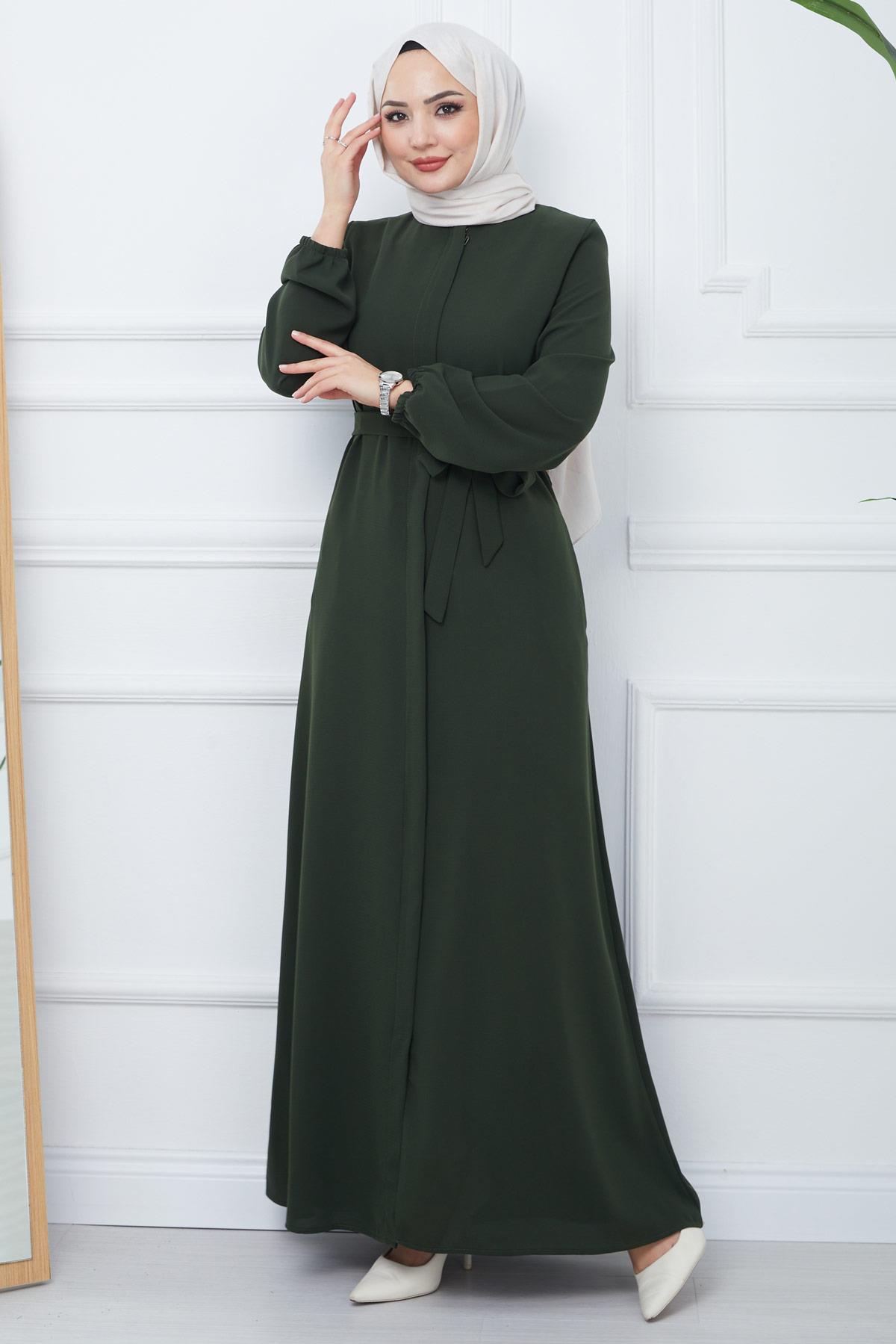 Ürün Özelliği : Boydan fermuarlı Ferace modelidir. Önden gizli patlı fermuar ile kapanmaktadır. Yandan iki cebi bulunmaktadır. Beli kuşaklıdır. Omuzları vatkalı, manşeti lastik ribanalıdır. Astarsızdır. Ürün renginde konsept çekimlerinden dolayı ton farklılığı olabilir.