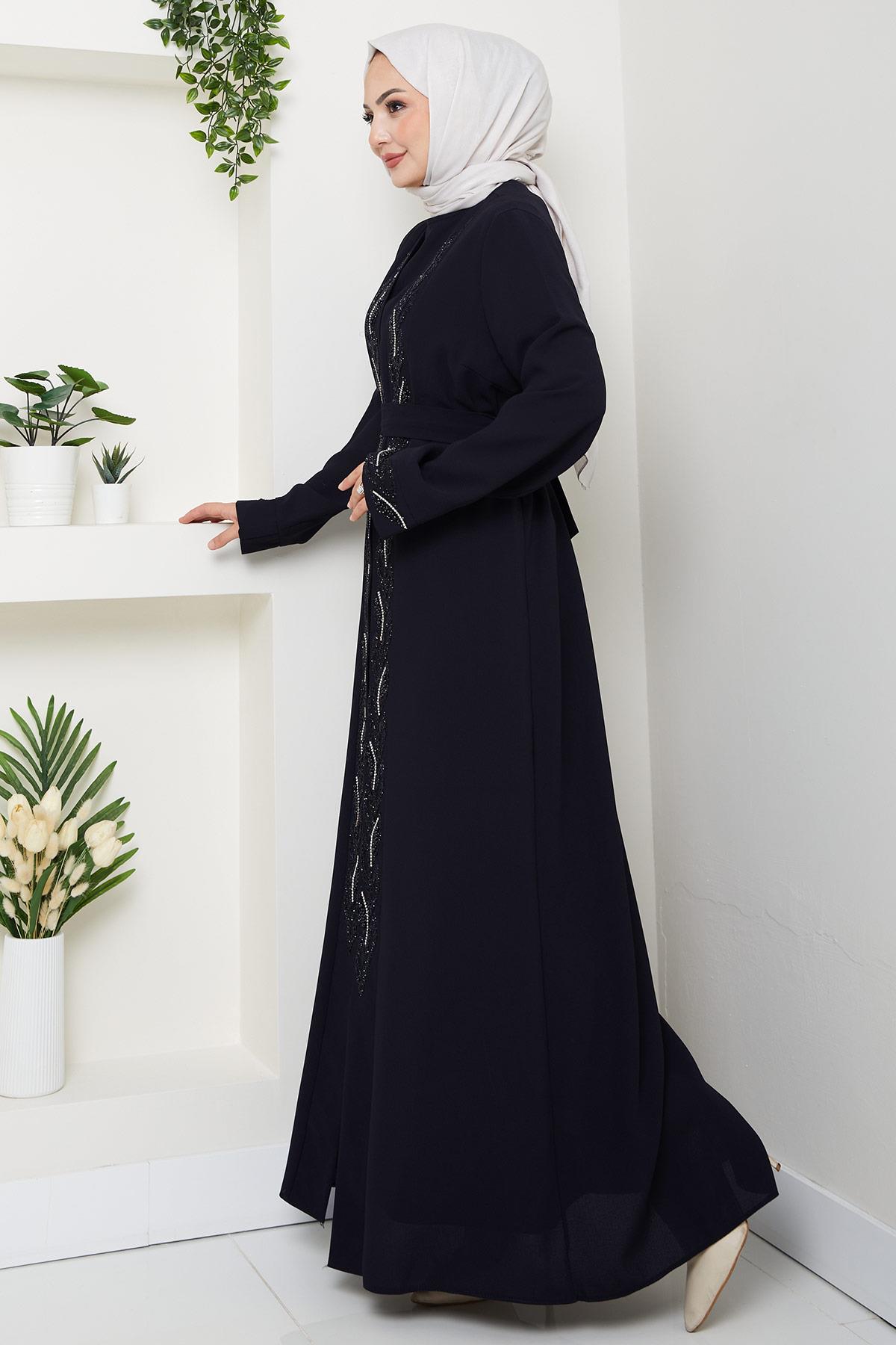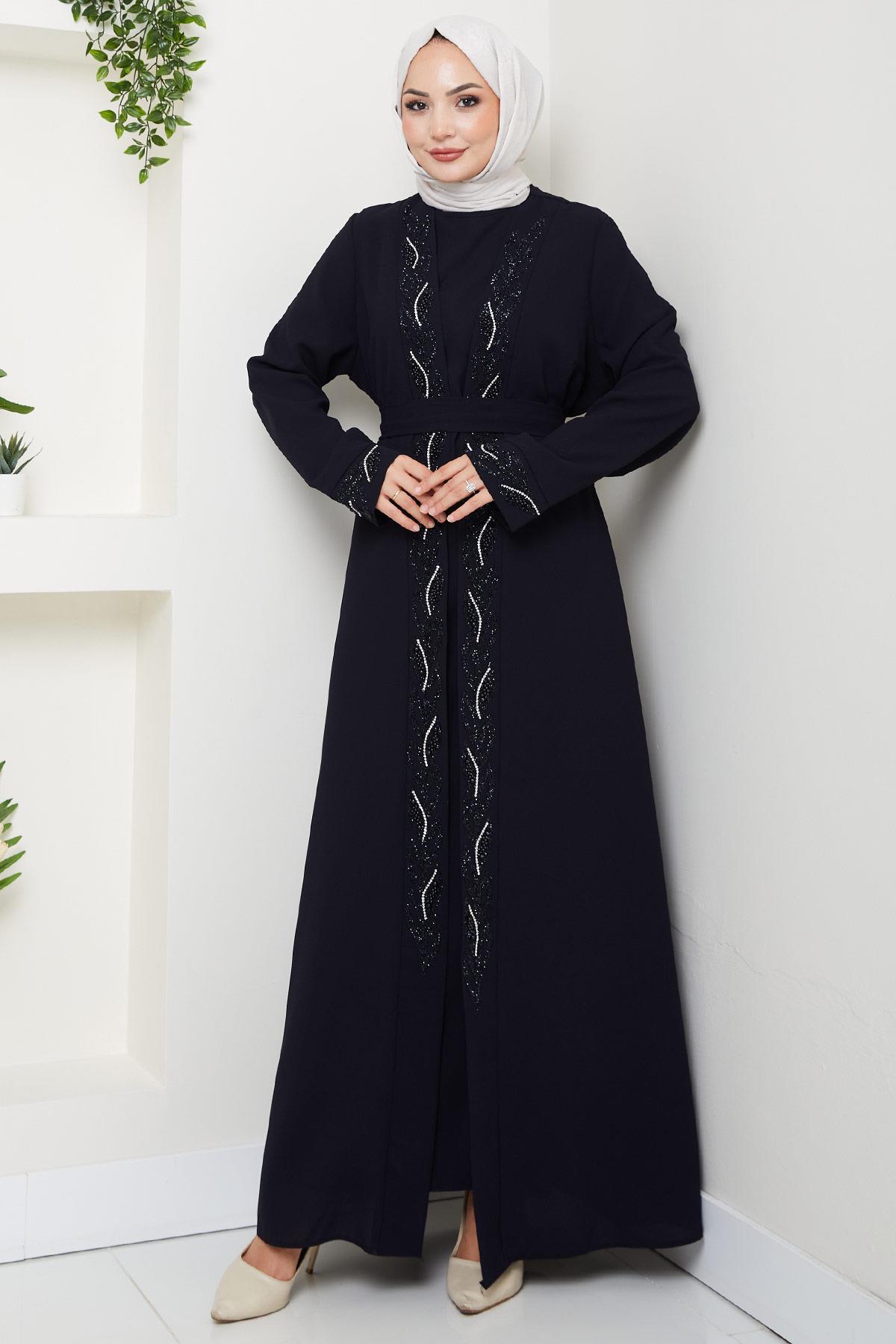 Ürün Özelliği : Bisiklet yaka, kısa kol içlikli ve önü taş detaylı, kuşaklı abaya olarak iki parçadan oluşmaktadır. Kuşak çıkarılabilir, cepsizdir. Ürün renginde konsept çekimlerinden dolayı ton farklılığı olabilir.