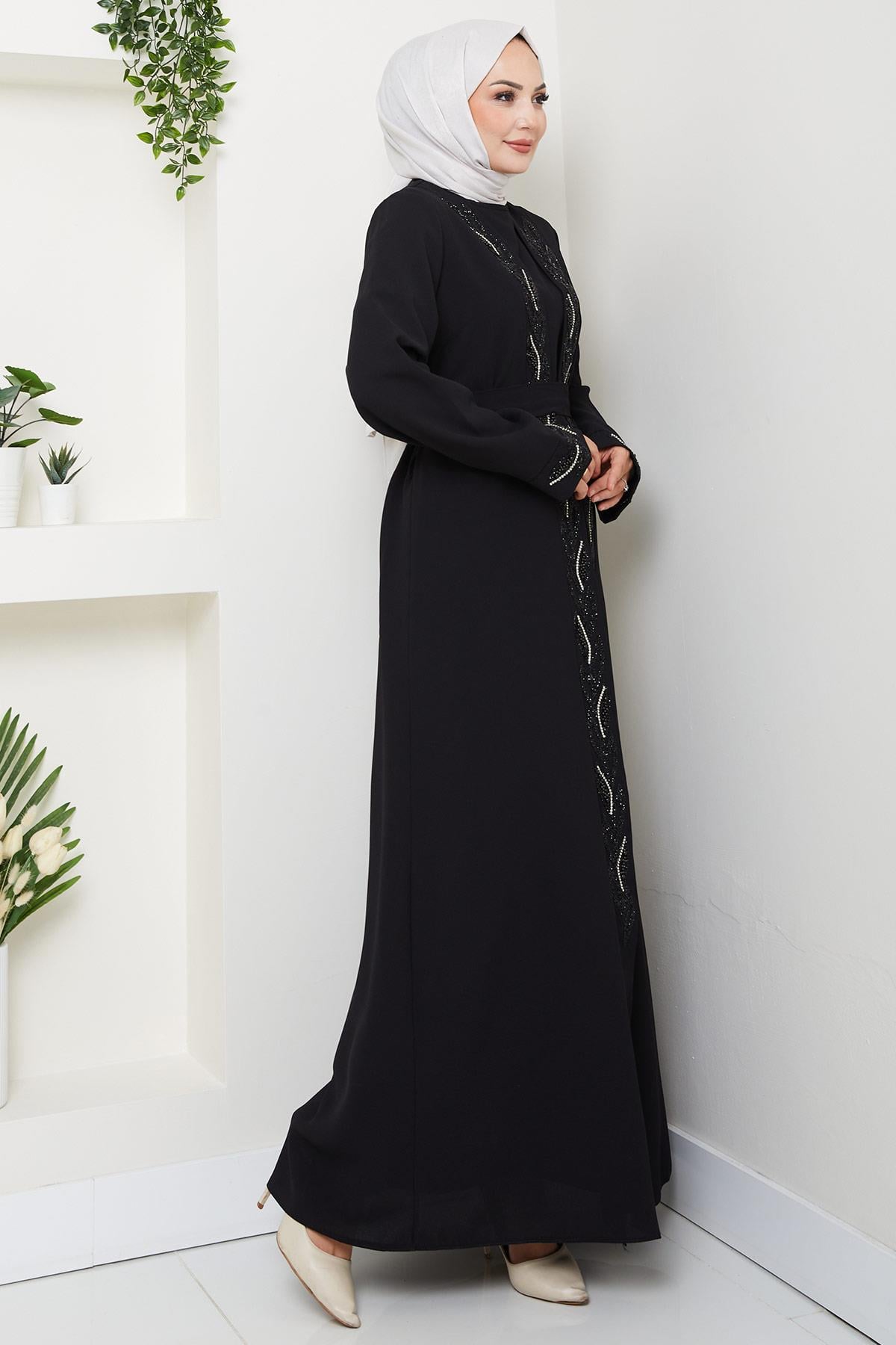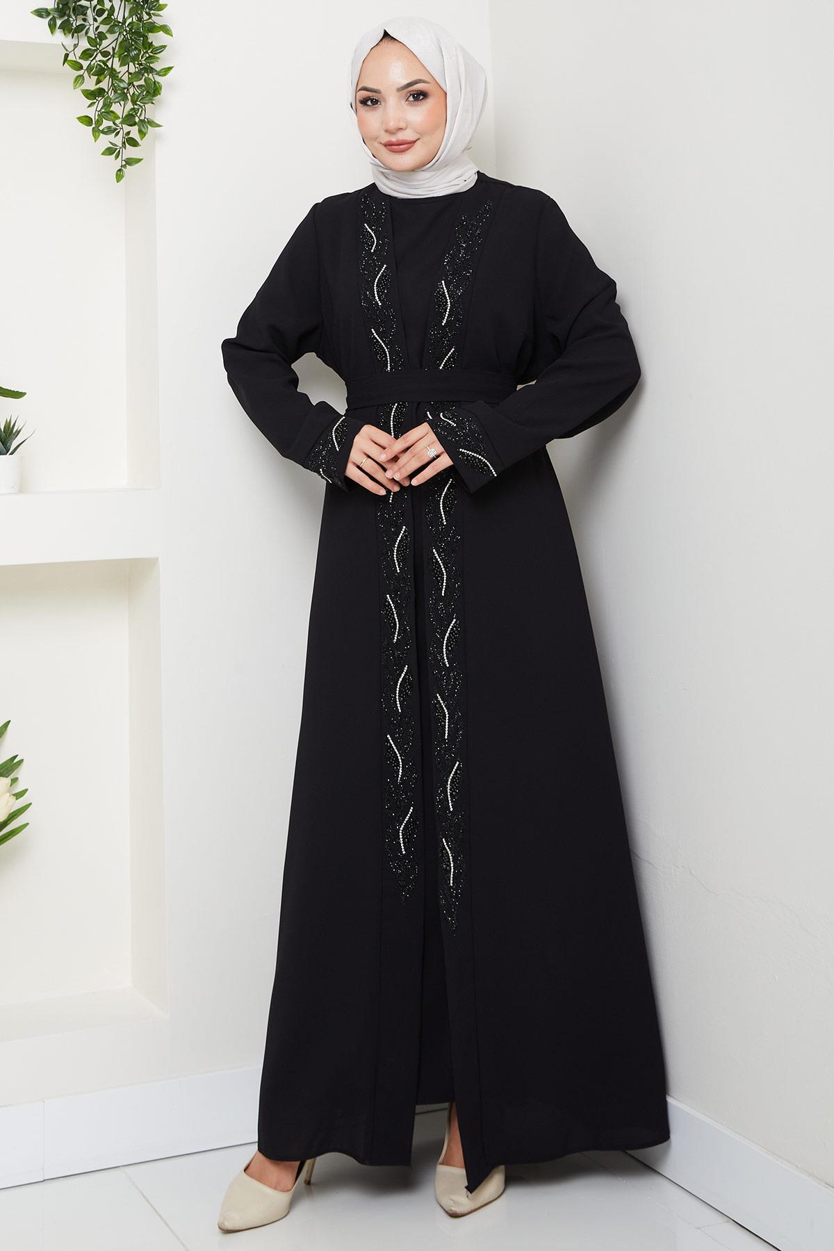 Kuşaklı Taş Detaylı Abaya Siyah HM2803