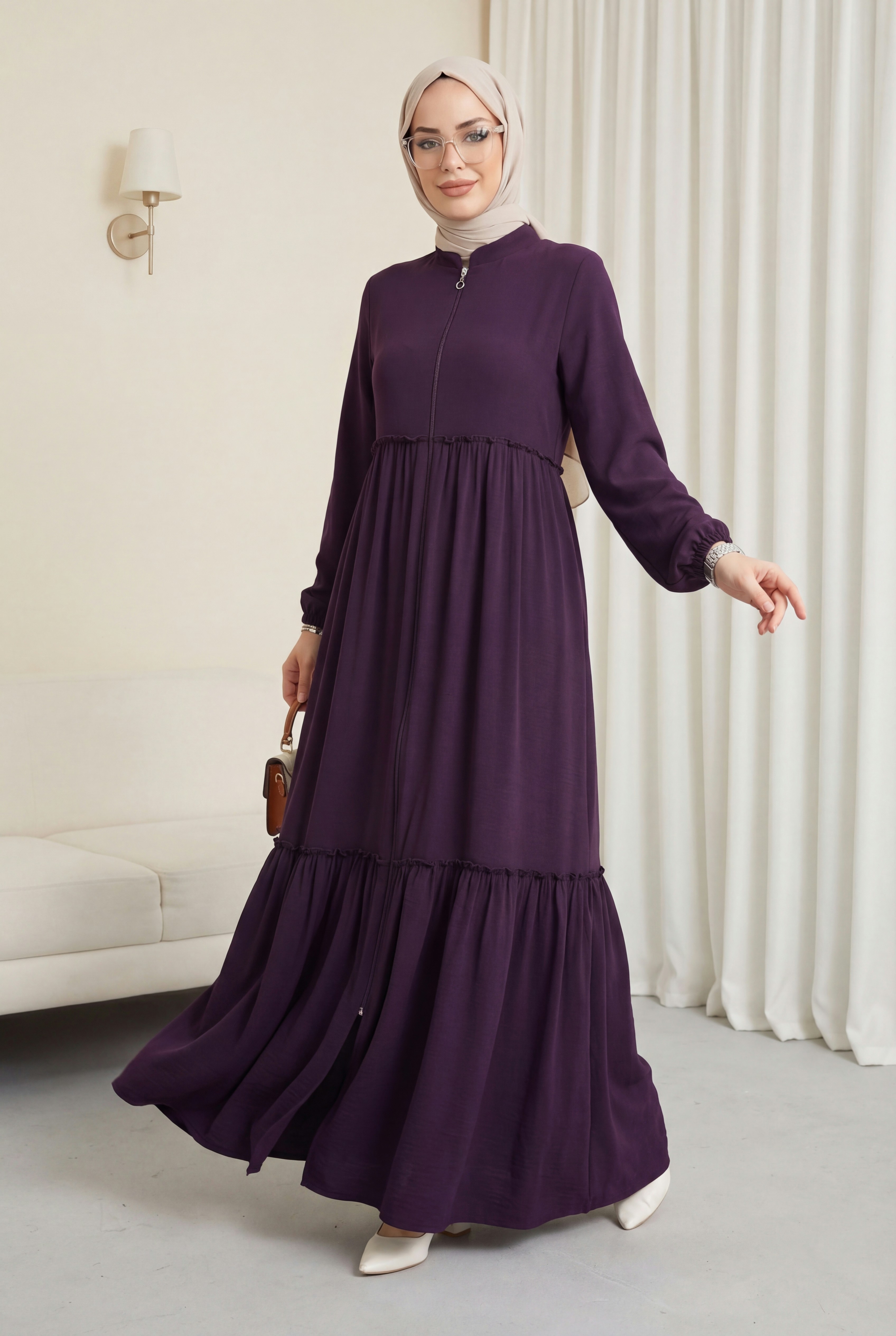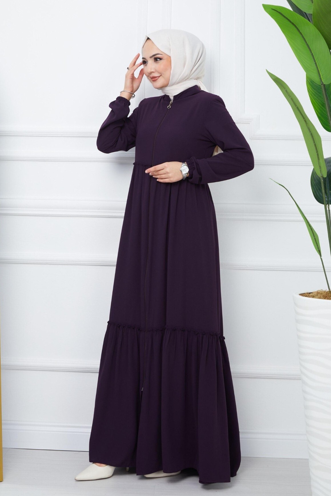Parçalı kolu lastikli boydan fermuarlı ferace, modern tasarımı ve pratik özellikleriyle öne çıkar. Lastikli kol detayları ve boydan fermuarı, rahatlık ve şıklığı bir arada sunar. Farklı renk ve kesim seçenekleriyle her tarza hitap eder. Hem günlük kullanımda hem de şık etkinliklerde rahatça tercih edilebilir.