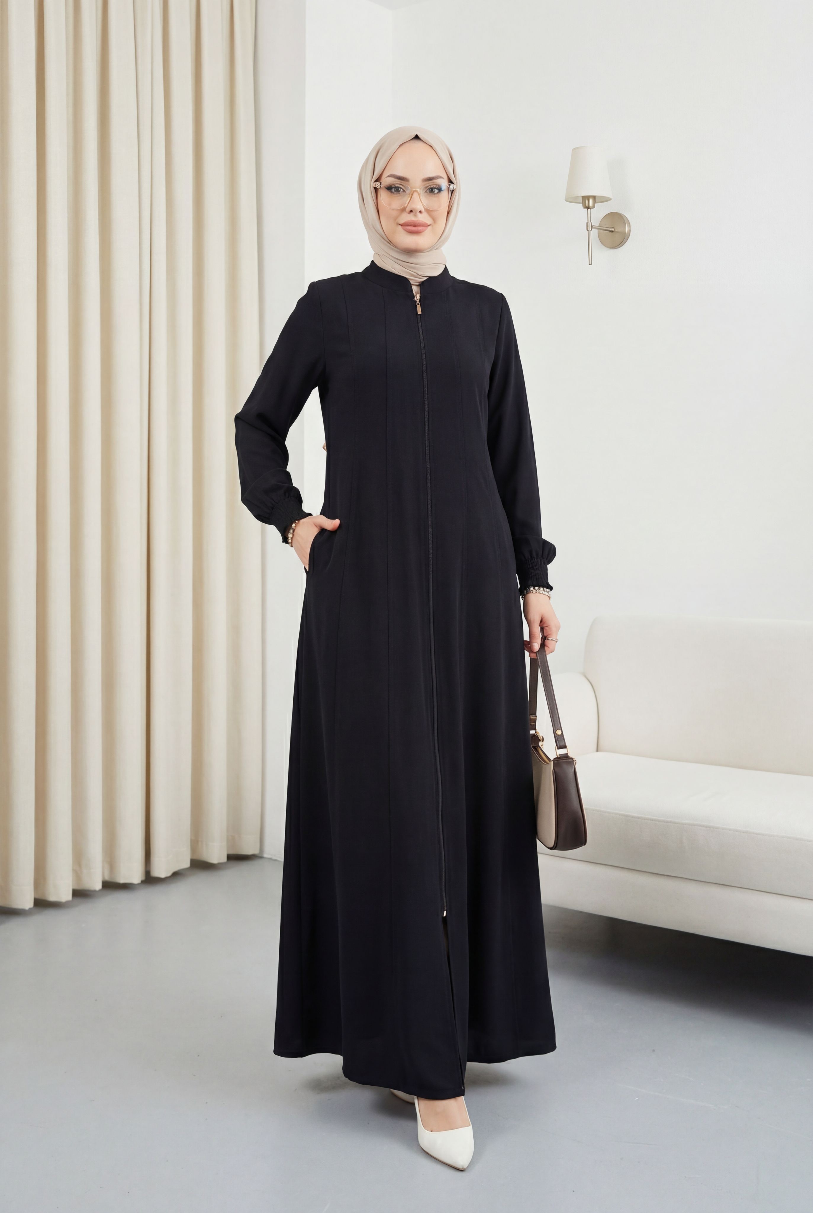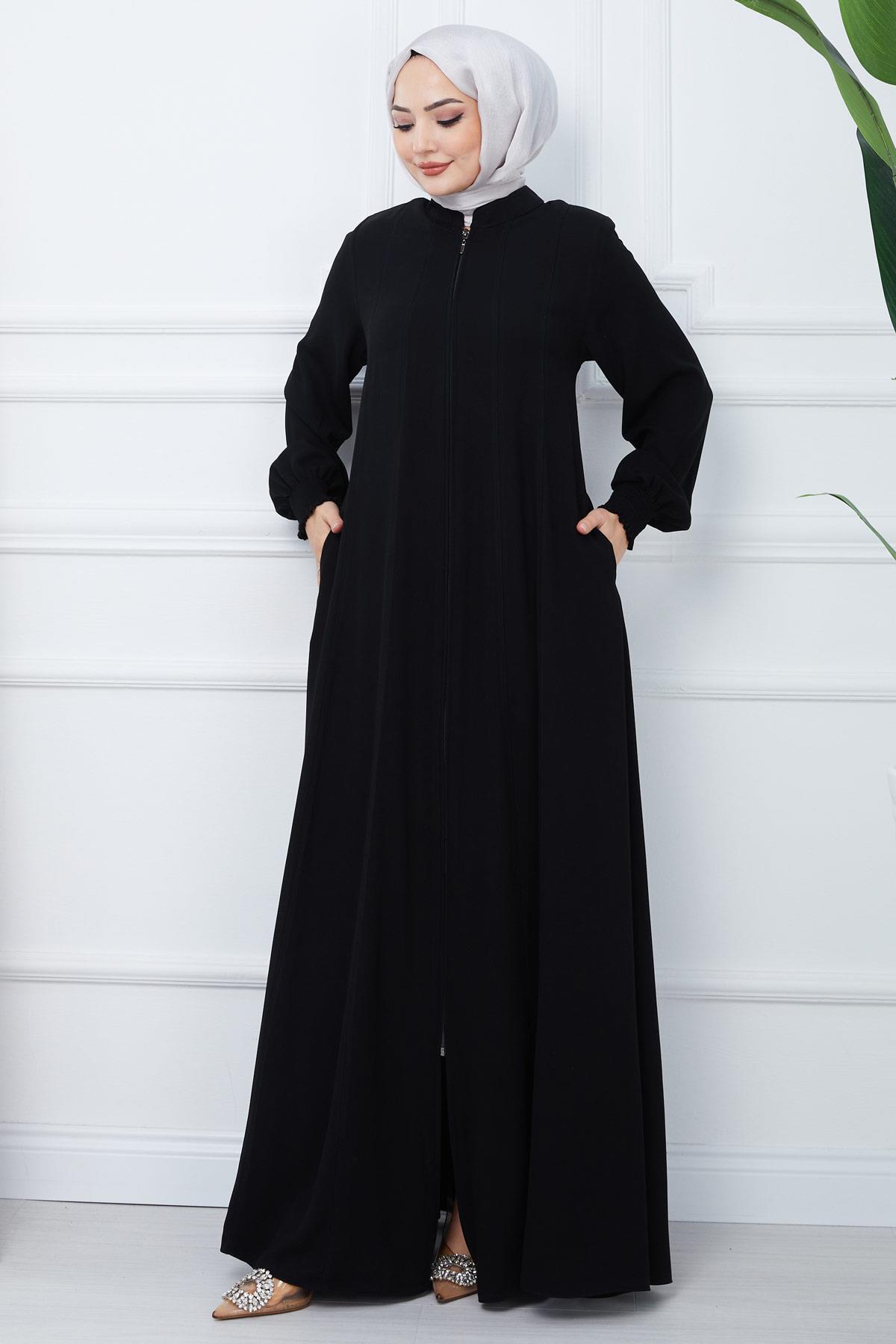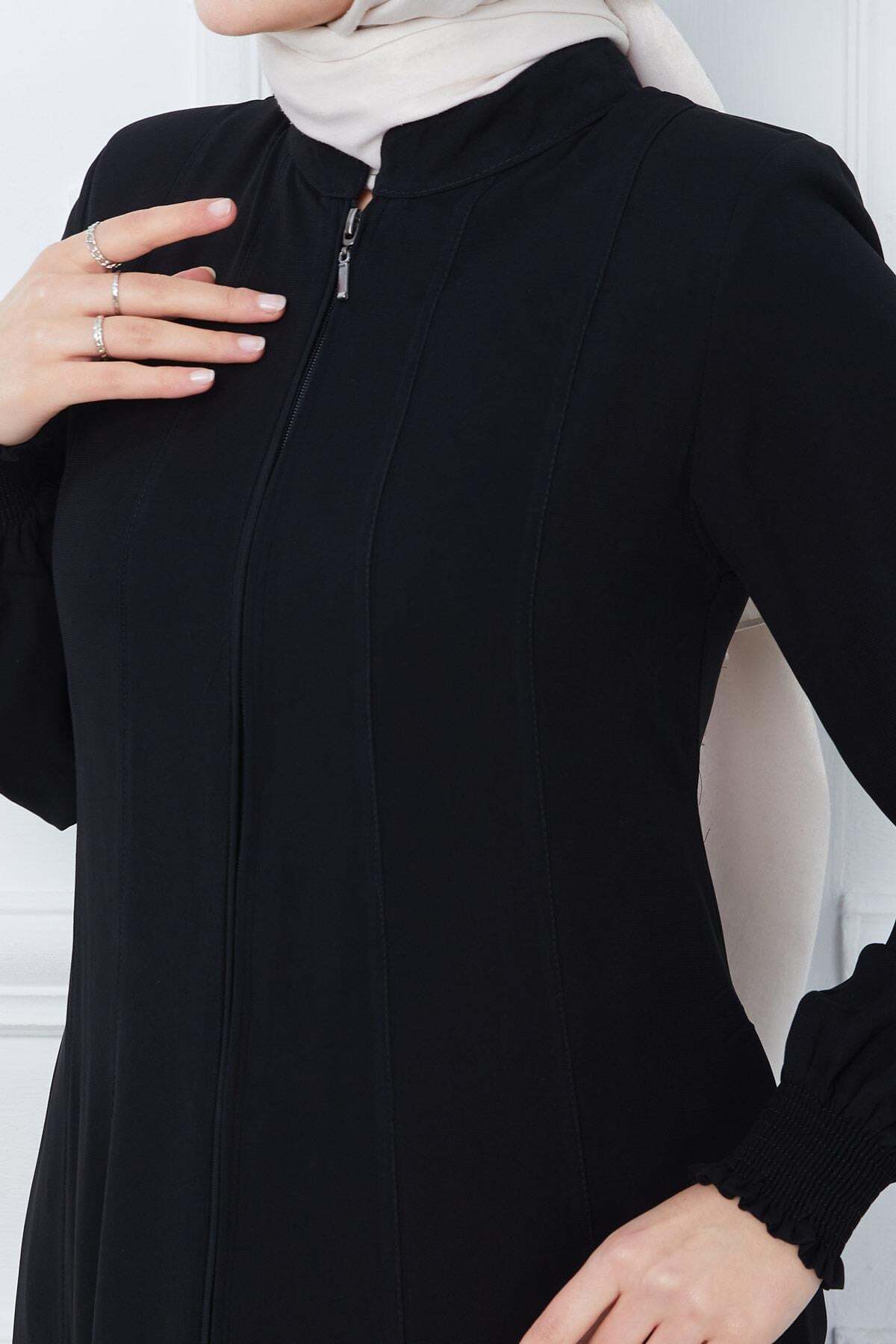 Ürün Özelliği : Boydan fermuarlı hakim yakası Mevlana Ferace modelidir. Önden fermuar ile kapanmaktadır. Hakim yakadır, manşeti lastik gipelidir. Boydan parçalı detayları mevcuttur. Omuzları vatkalı, astarsızdır. Ürün renginde konsept çekimlerinden dolayı ton farklılığı olabilir.