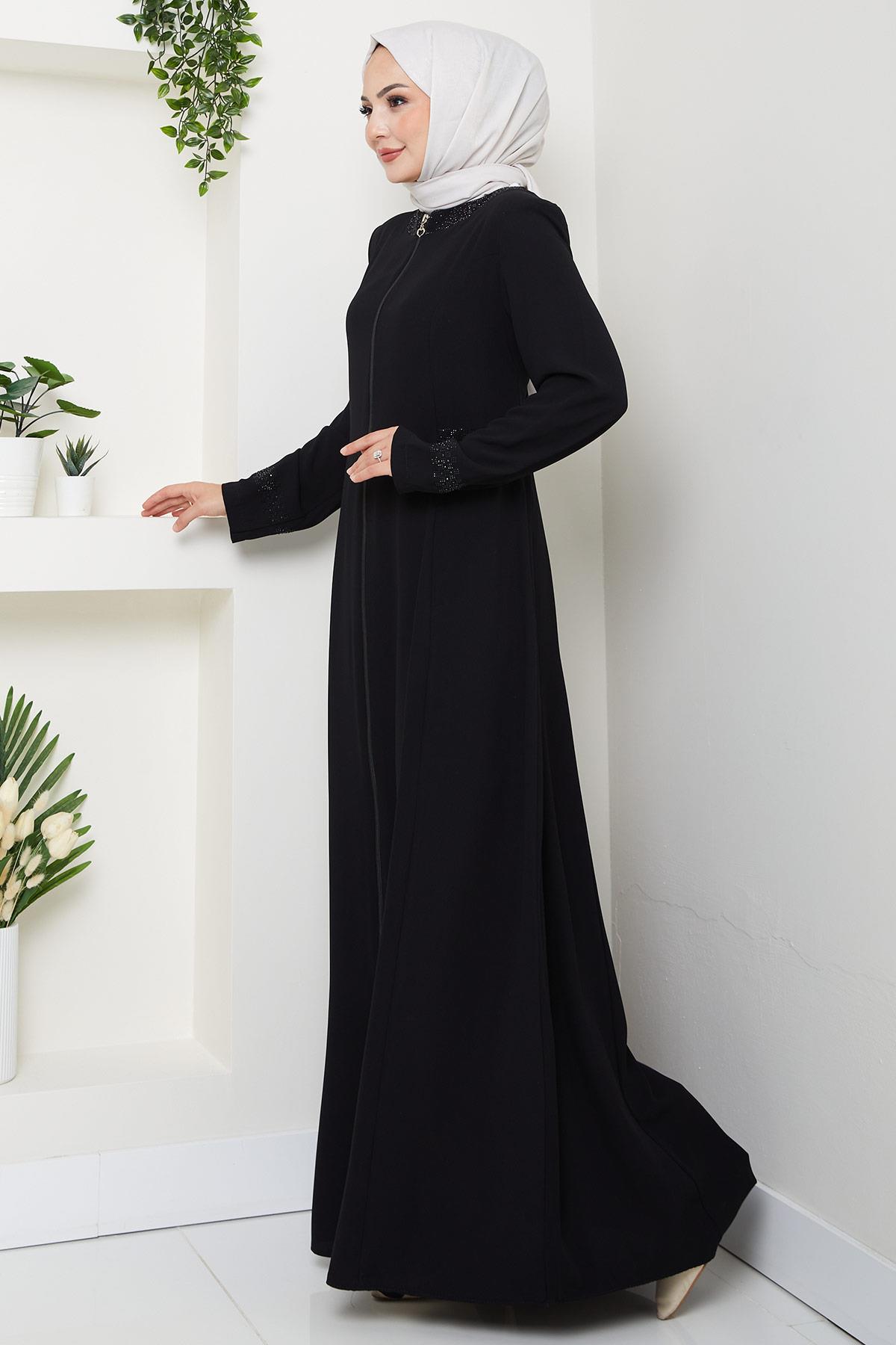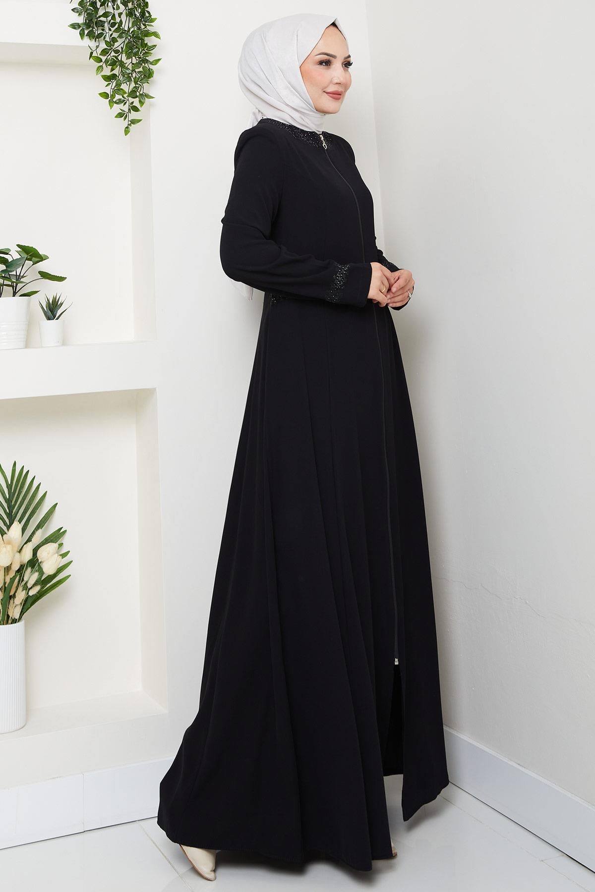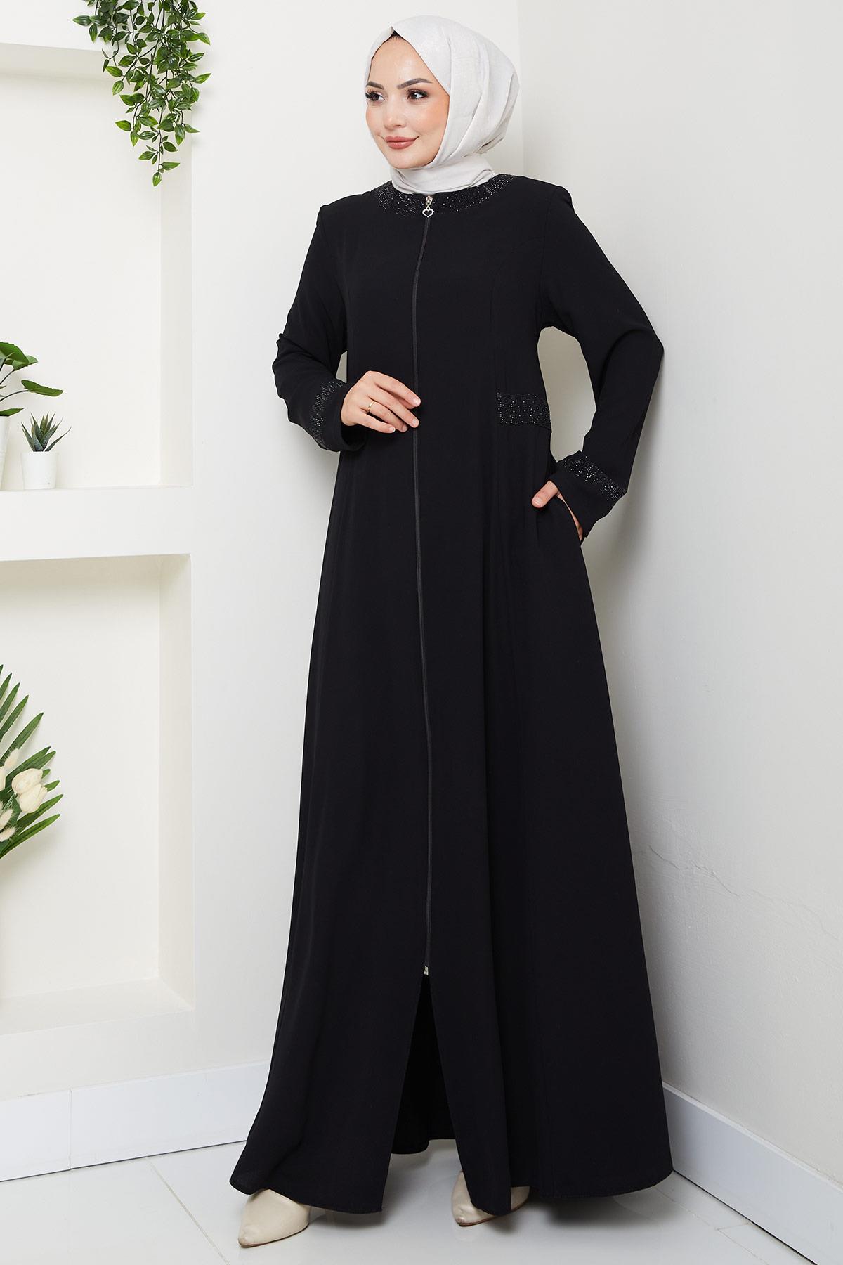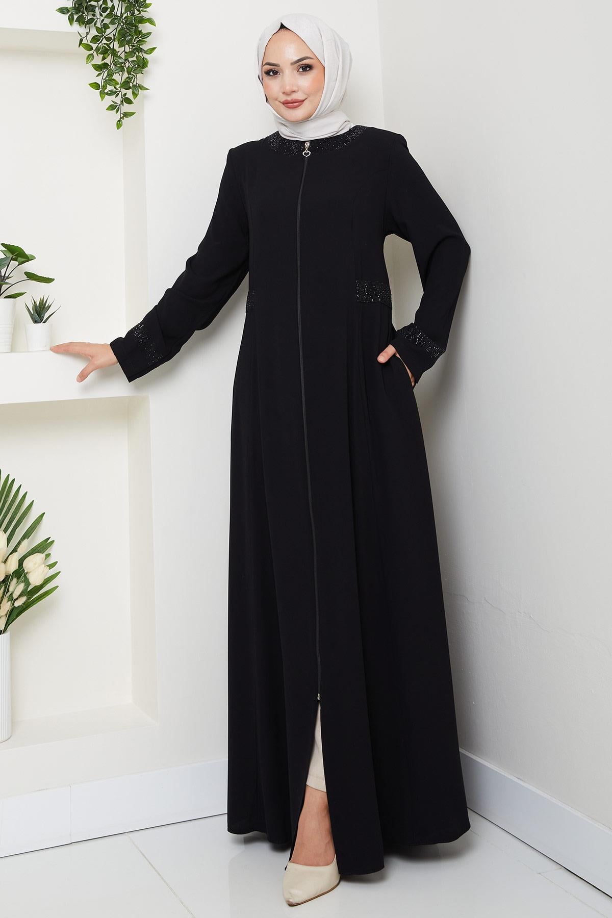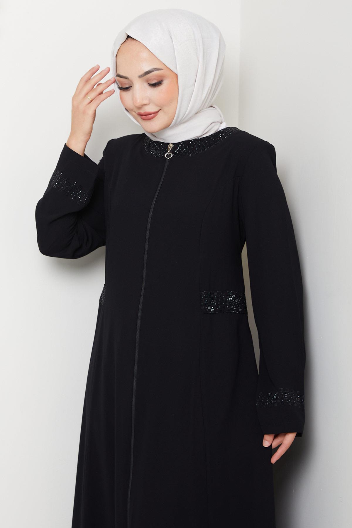 Ürün Özelliği : Bisiklet yaka, boydan fermuarlı taş detaylı Yazlık Ferace modelidir. Omuzları vatkalı, yandan ceplidir. Astarsızdır. Ürün renginde konsept çekimlerinden dolayı ton farklılığı olabilir.