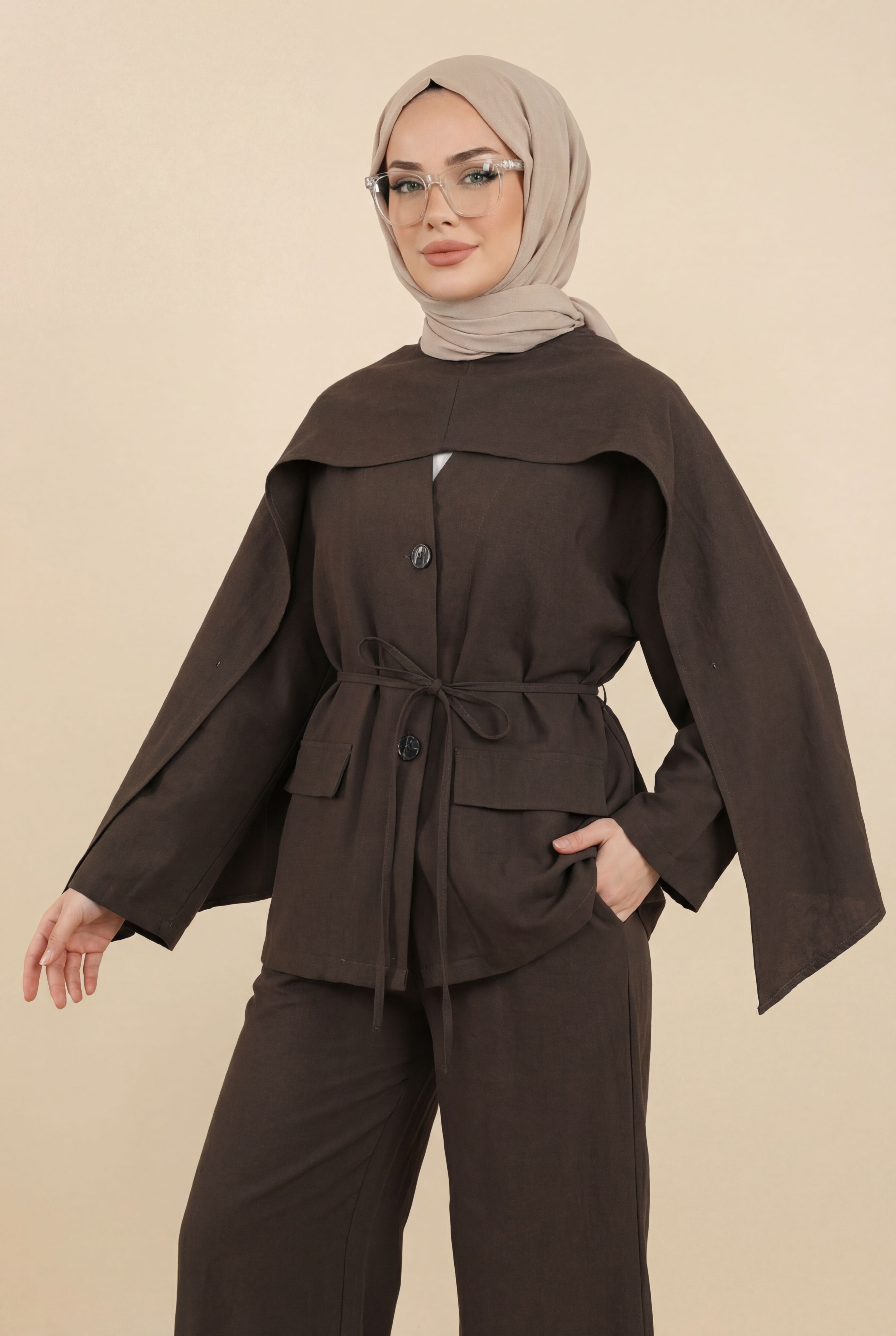 Cep Detaylı V Yaka Bağcıklı Fularlı Paraşüt Takım -Kahve