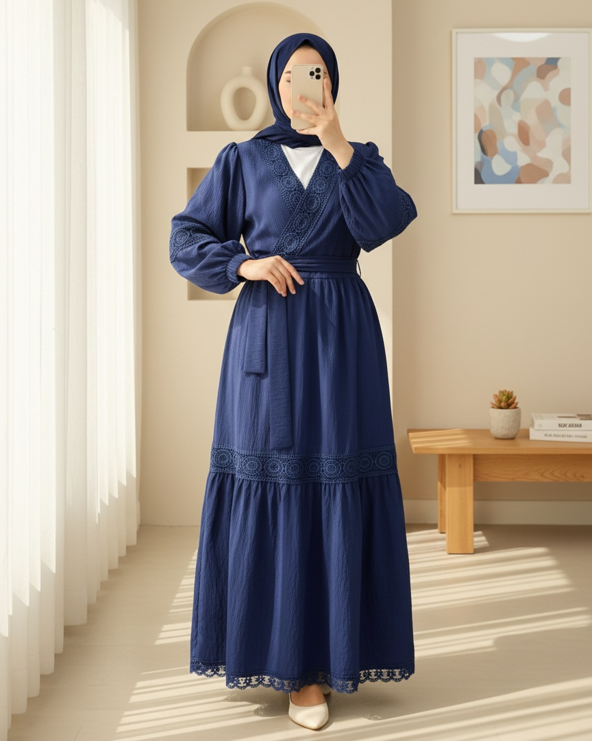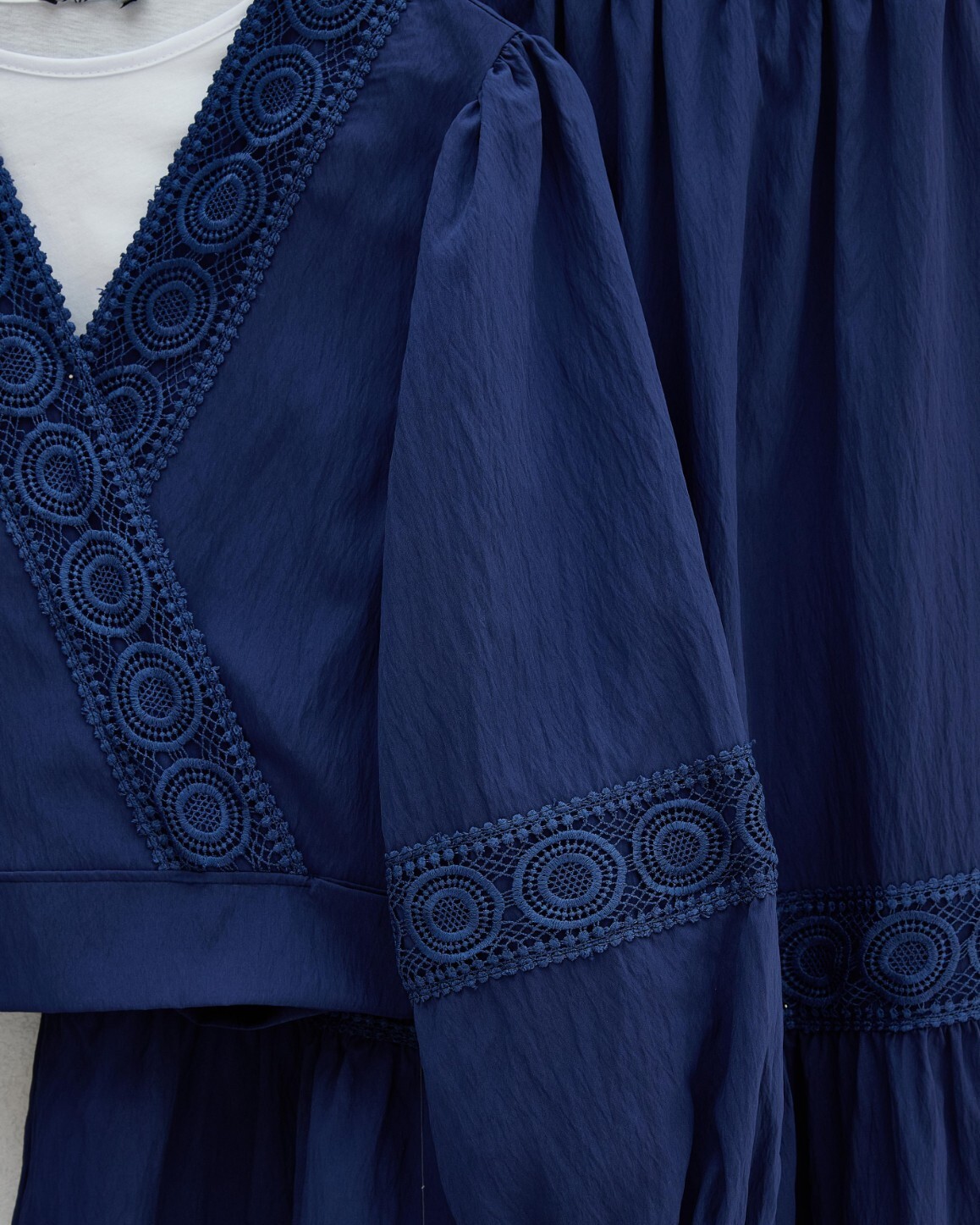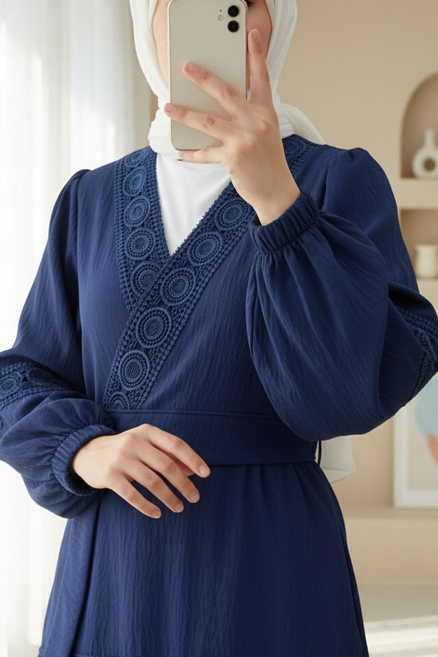 Dantel Detaylı Bağlamalı Kolu Lastikli Kraş Etekli Takım, zarif dantel ve rahat kol lastiğiyle feminen bir şıklık sunar. Bağlamalı tasarımı ve kraş eteğiyle modern ve rahat bir kombin oluşturur.