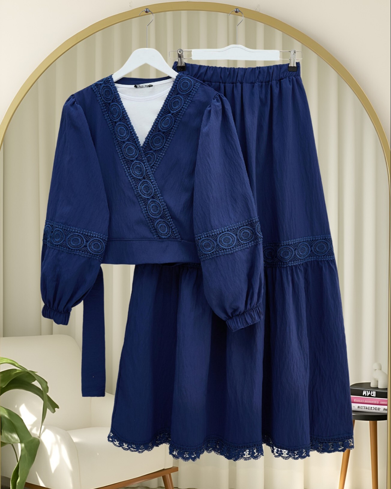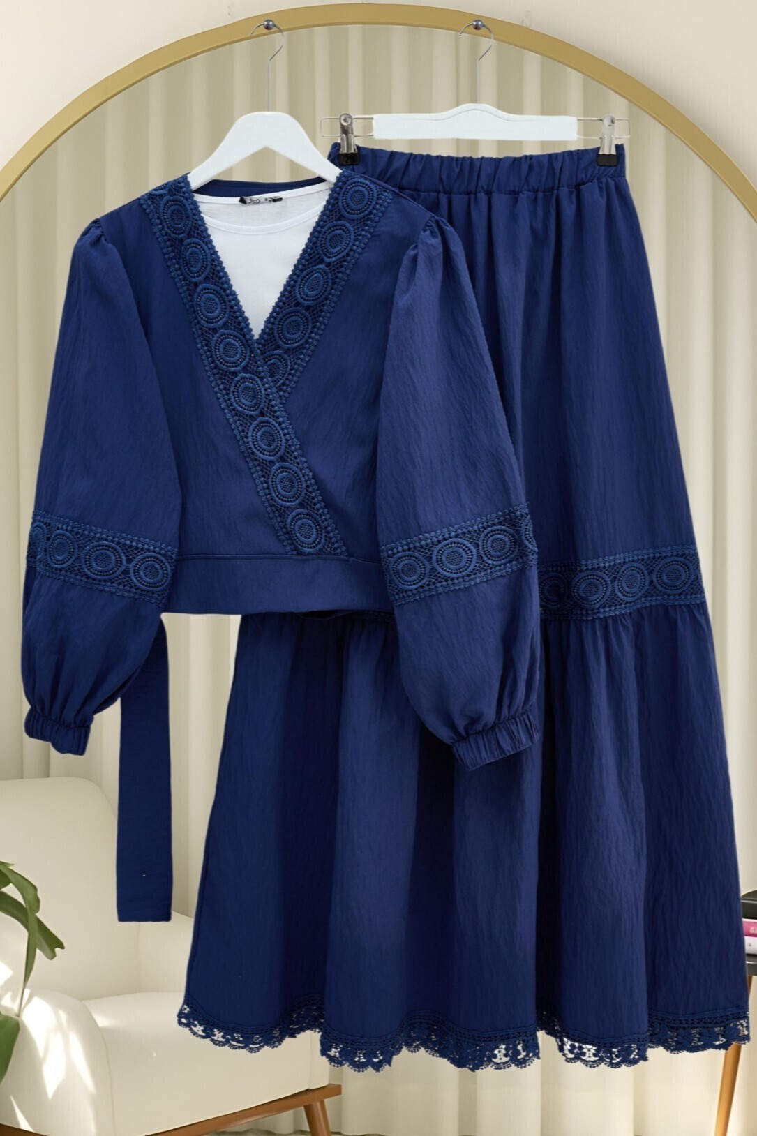Ürün bluz ve etek olarak ikili takımdan oluşmaktadır. İçlik dekor amaçlıdır, dahil değildir.
