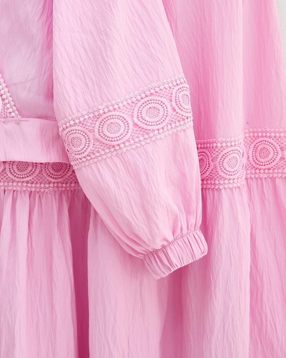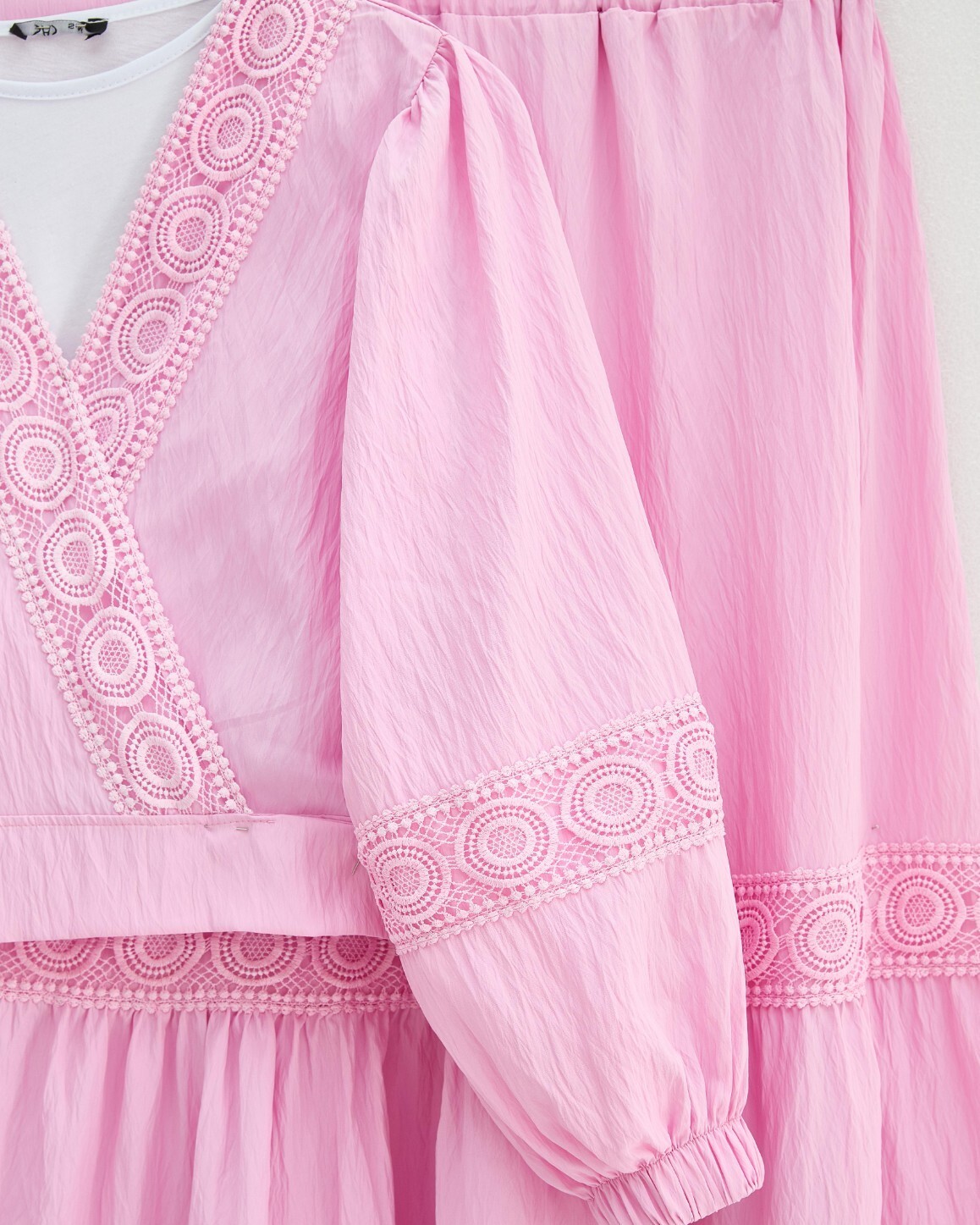 Dantel Detaylı Bağlamalı Kolu Lastikli Kraş Etekli Takım -Pembe