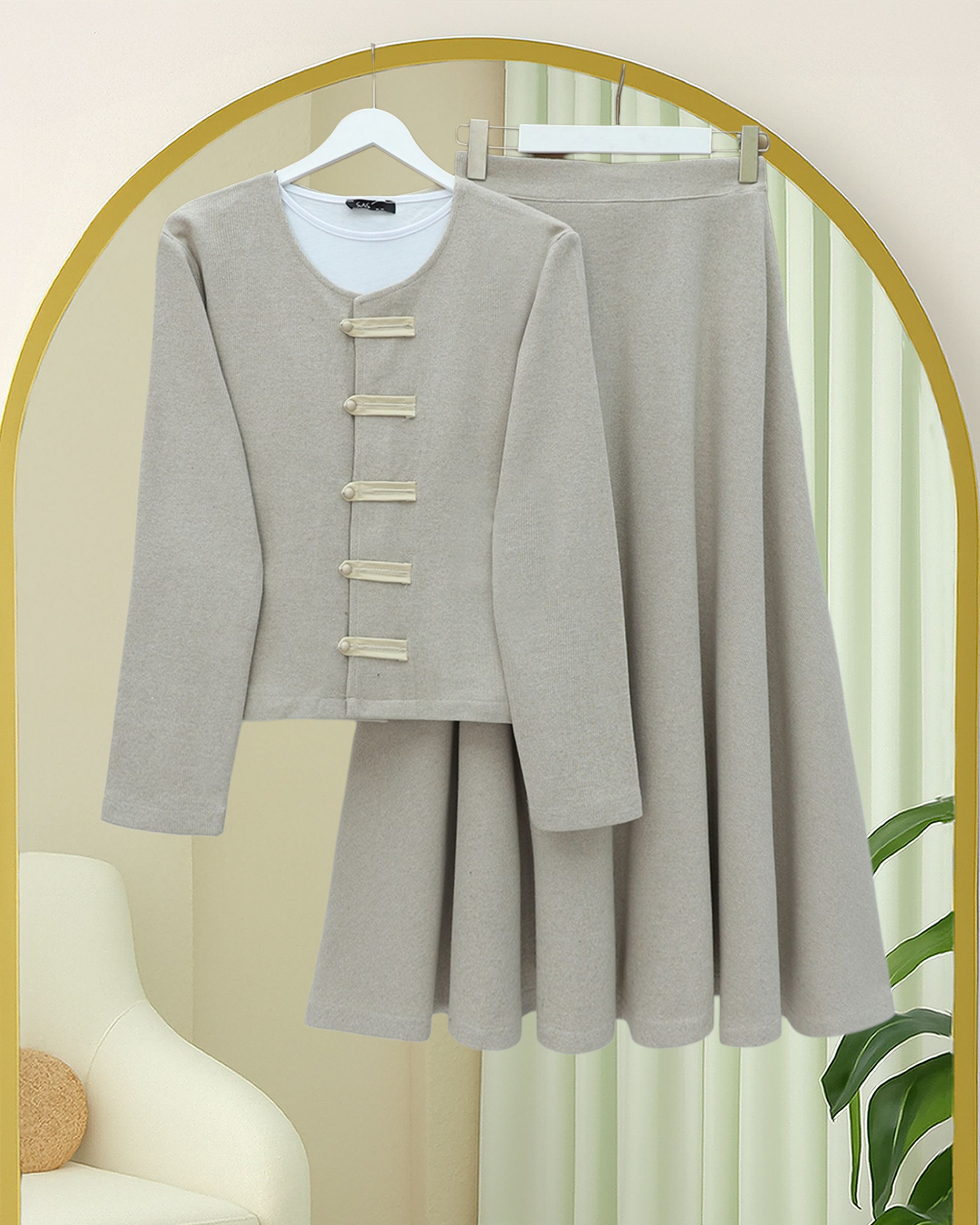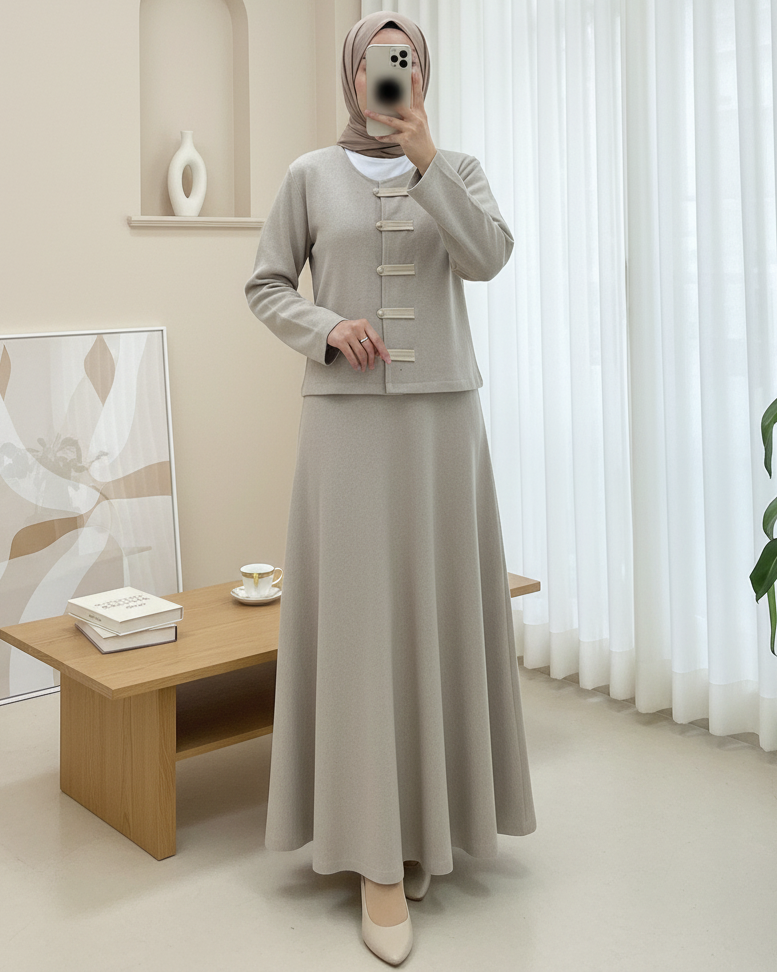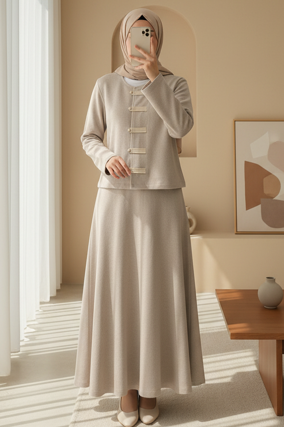 Şıklığı modern detaylarla bir araya getiren Deri Detaylı Önü Düğmeli Etekli Selanik Takım, zarif görünümü ve konforlu yapısıyla günün her anında stil sahibi bir duruş sunar. Selanik dokuma kumaşın sıcak ve tok hissi, deri detayların modern çizgisiyle buluşarak dinamik ve iddialı bir tasarım ortaya çıkarır. Önü düğmeli formu ve uyumlu etek kesimi sayesinde hem klasik hem casual kombinlere rahatlıkla uyum sağlar.