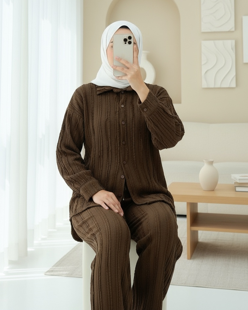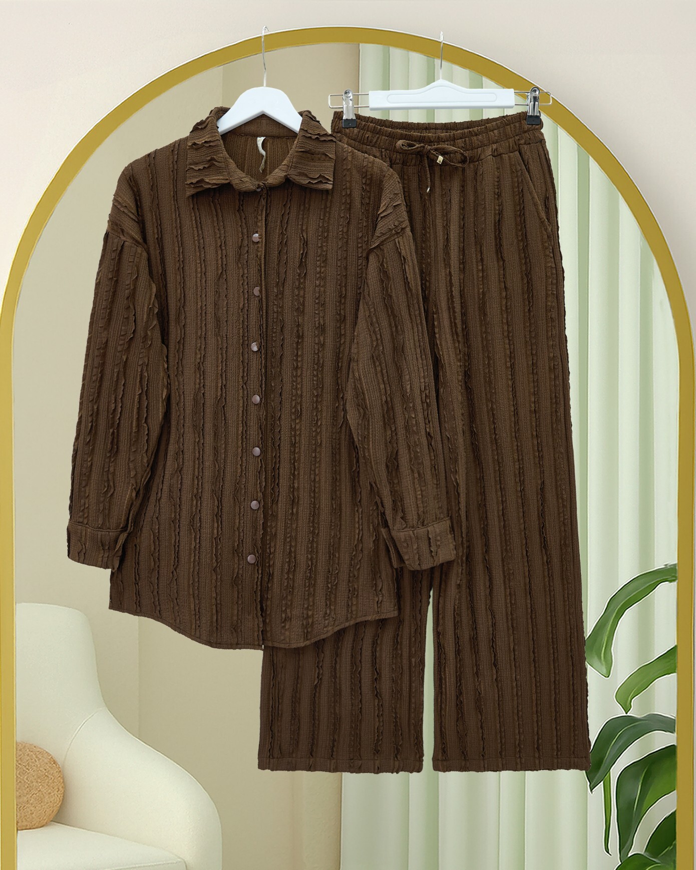 Dokulu düğmeli dikey şeritli pantolon gömlek takımı, şıklığınızı anında yükselten modern bir seçenektir. Dikey şeritler, uzun bir siluet yaratırken, dokulu kumaşı ve düğme detayları tasarıma zarif bir dokunuş katar. Hem ofis stilinize hem de gündelik kombinlerinize rahatça uyum sağlar, her anınızda şıklığı ve rahatlığı bir arada sunar.